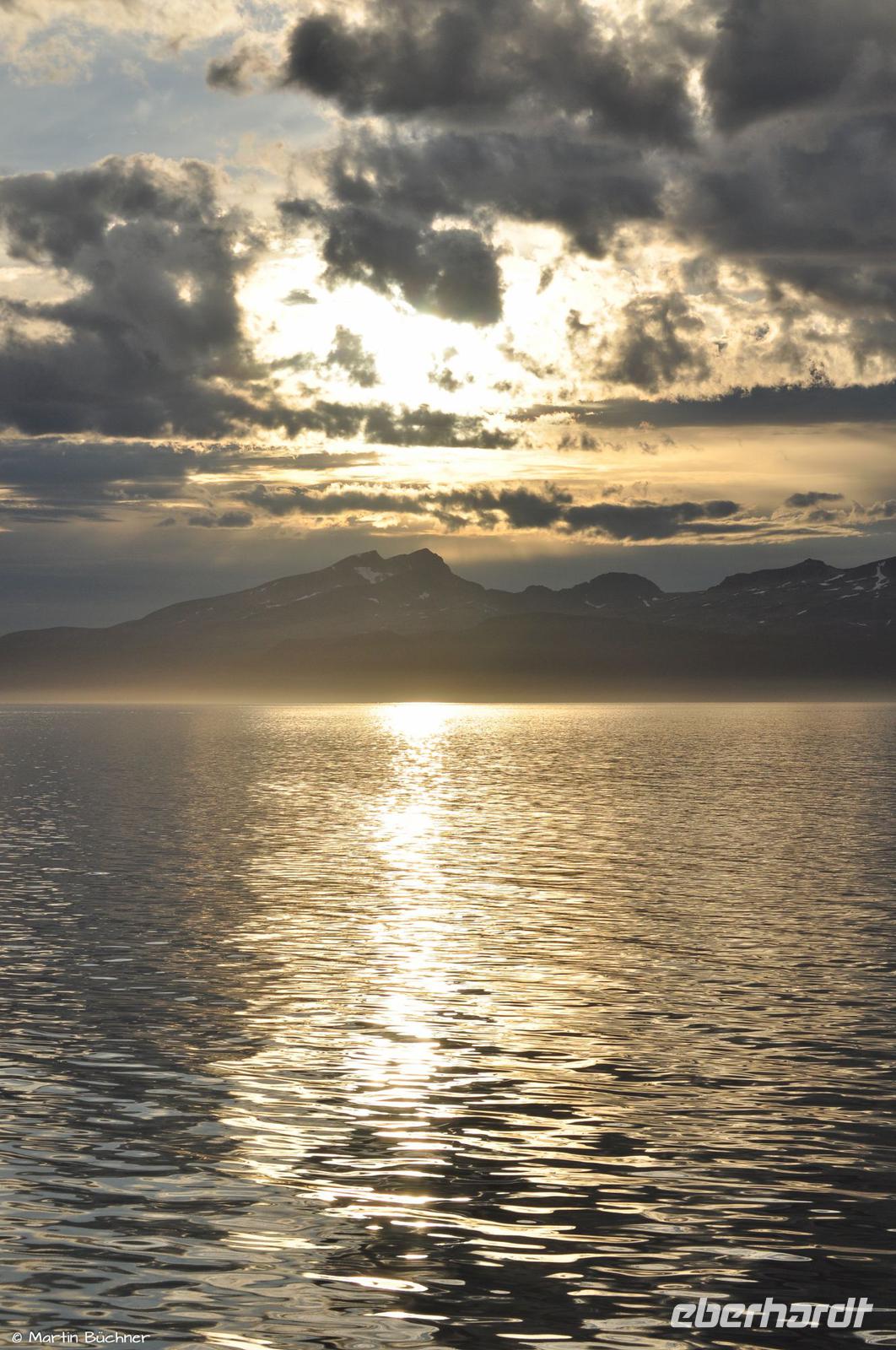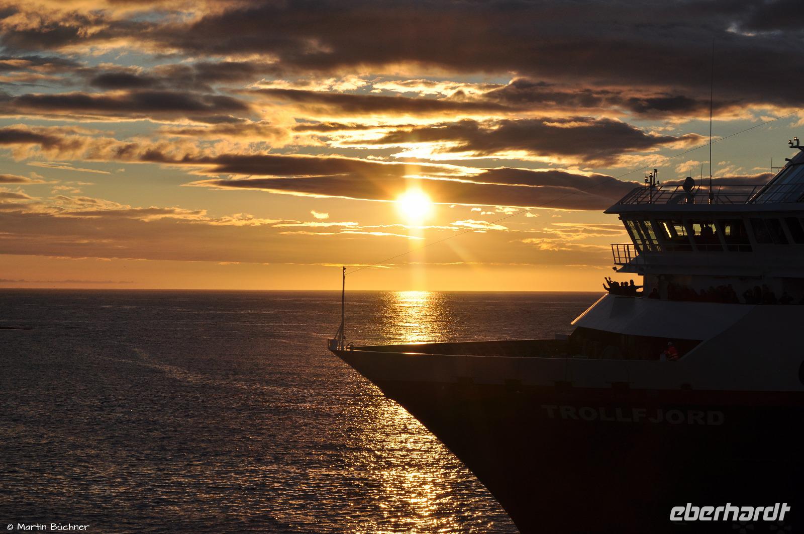 Höhepunkt des Abends ist die Einfahrt in den Trollfjord, Dank Polartag ist es taghell, bei bestem Wetter.