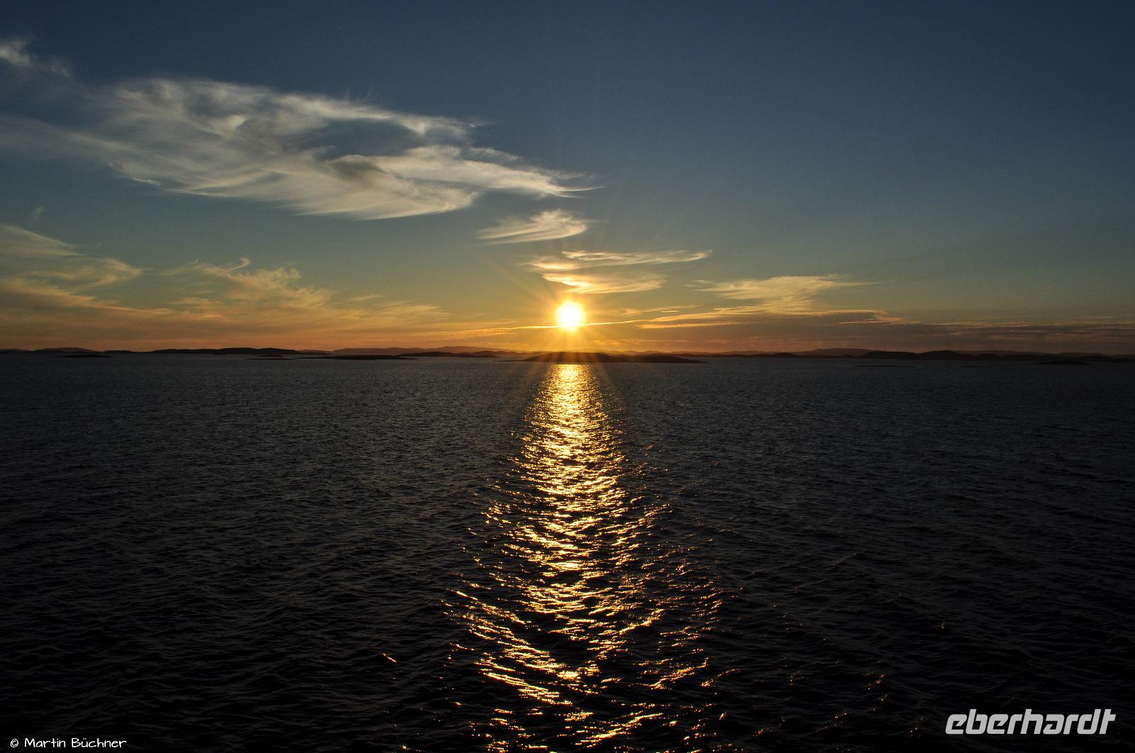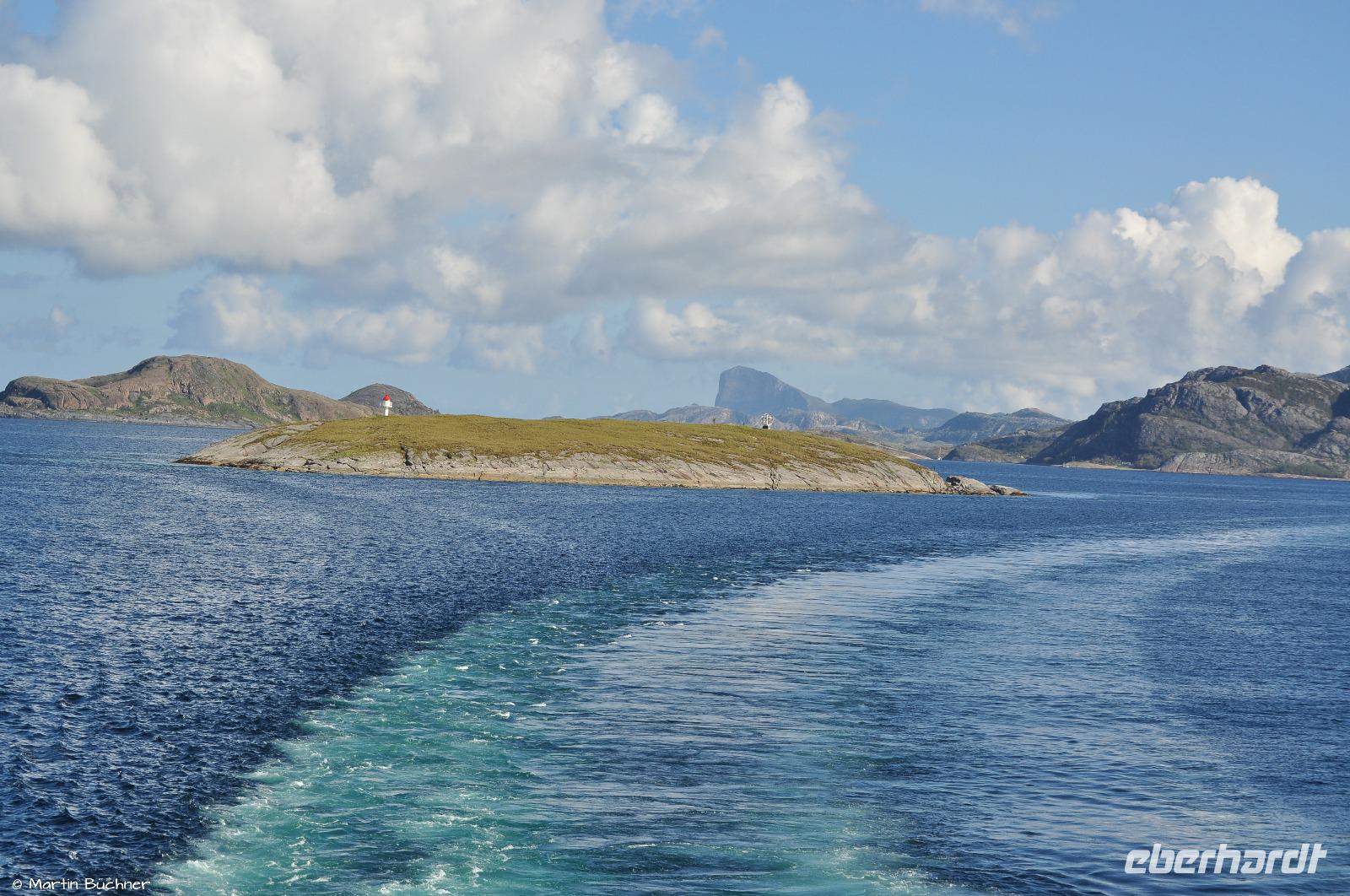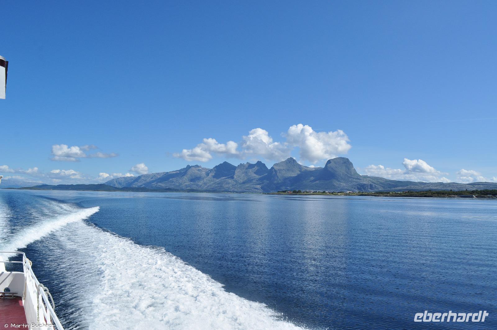 Am Morgen überqueren wir den Polarkreis südwärts. Auch hier muss man sich erneut einer arktischen Prüfung unterziehen. Die Helgelandsküste wird auch Märchenküste genannt. Ein altes nordisches Märchen erklärt die Landschaft. Es beginnt bereits auf den Lofoten und endet in Tröndelag im Süden. Es handelt von zwei Königen und ihren Kindern, einem Prinzen, der sich in eine schöne Trollfrau verliebt und diese unbedingt heiraten will. Diese ist aber schon verheiratet und hat die Aufgabe einer Gouvernante. Sie soll die Sieben Schwestern erziehen und zu guten Ehefrauen erziehen.