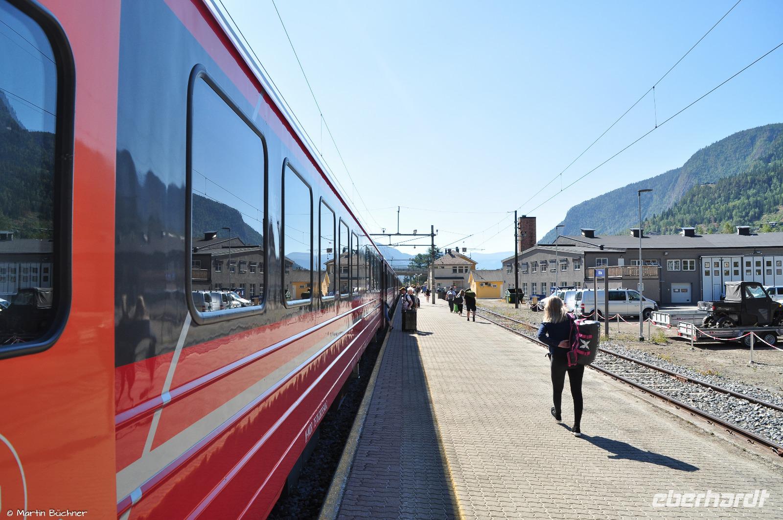 Am Morgen gehen wir zu Fuß mit unserem Gepäck vom Hotel zum Bahnhof Oslo S, dieser liegt nur auf der gegenüberliegenden Straßenseite. Es startet unsere mehr als 6-stündige Fahrt nach Bergen. Aufgrund von Bauarbeiten an der Hauptstrecke kommen wir in den Genuss auf der alten Bergenbahnstrecke bis nach Hönefoss zu fahren.