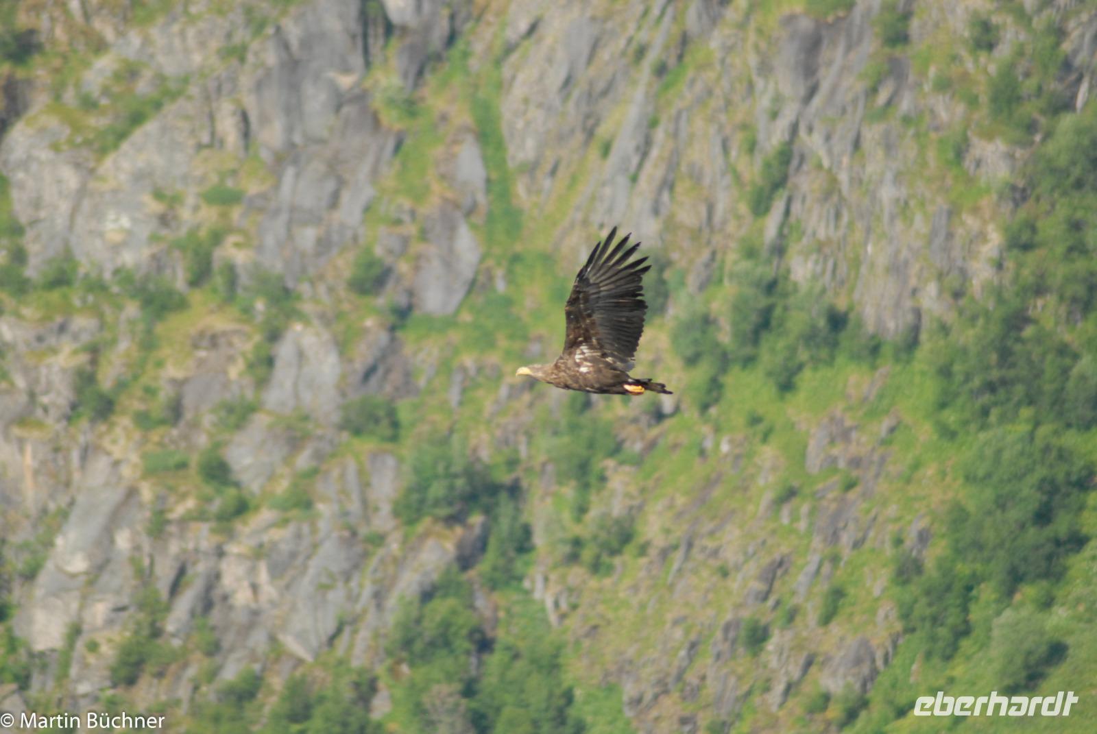 Im Raftsund selbst fährt das Schiff einen Umweg, in den weltberühmten Trollfjord, ein Highlight der gesamten Hurtigrutenstrecke. Begleitet von Seeadlern gleitet das Schiff in den kurzen Fjord. Die Einfahrt ist gerade einmal 100 m breit, die aufragenden direkten Felswände sind nahezu 300 m senkrecht, die umliegenden Berggipfel weit über 1.000 m hoch. Atemberaubend, erst recht bei diesem Wetter.