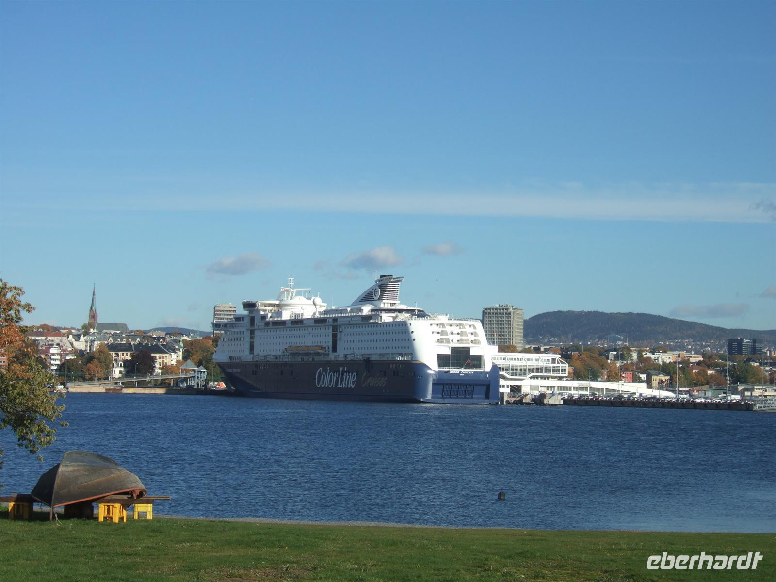 Unsere Stadtrundfahrt ist noch nicht zu Ende, denn wir nehmen nun Kurs auf die Museumshalbinsel Bygdoy, welche weltberühmte Museen wie das KonTiki-Museum, das Museum der Wikingerschiffe oder das Fram Museum, welches Nansens Schiff beherbergt. Wir werfen nur einen kurzen Blick ins Fram Museum und genießen eine super Aussicht auf die Color Fantasy, die noch im Hafen von Oslo liegt.