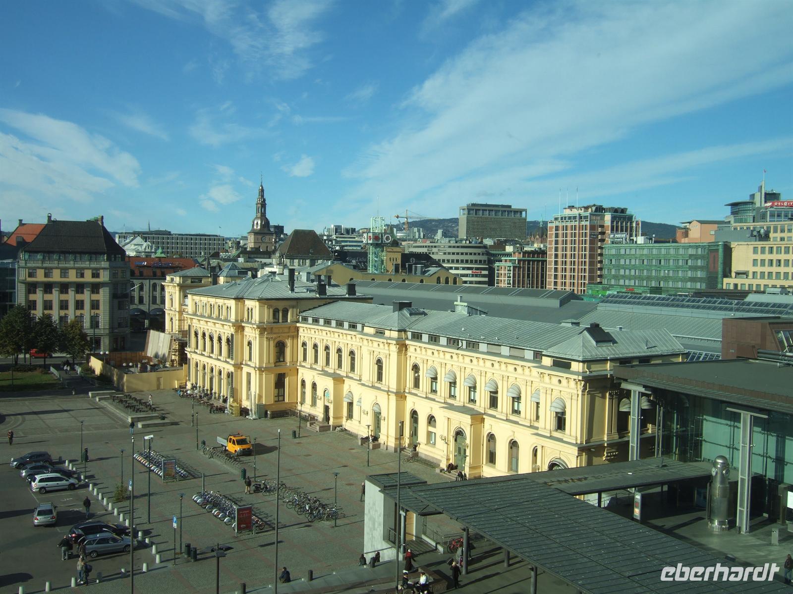 Unser Zug steht schon fast bereit, als wir eintreffen und nach kurzer Freizeit begeben wir uns zum Bahnsteig 2 und nehmen unsere reservierten Plätze im Zug nach Oslo ein. Eine knapp siebenstündige Zugfahrt und circa 485 Kilometer liegen vor uns. Die Dovrebahn führt über das Dovrefjell und durch das legendäre Drivdal. Je weiter wir uns in dem bequemen Zug von Trondheim entfernen, desto schöner wird das Wetter, auch wenn noch in der ersten Station bereits tiefer Winter herrscht. Der Herbst zeigt sich einmal mehr von seiner schönsten Seite und lässt uns die Ausblicke genießen. Wir kommen pünktlich in Norwegens Hauptstadt an, die uns erneut mit Sonnenschein begrüßt. Nach einem kurzen