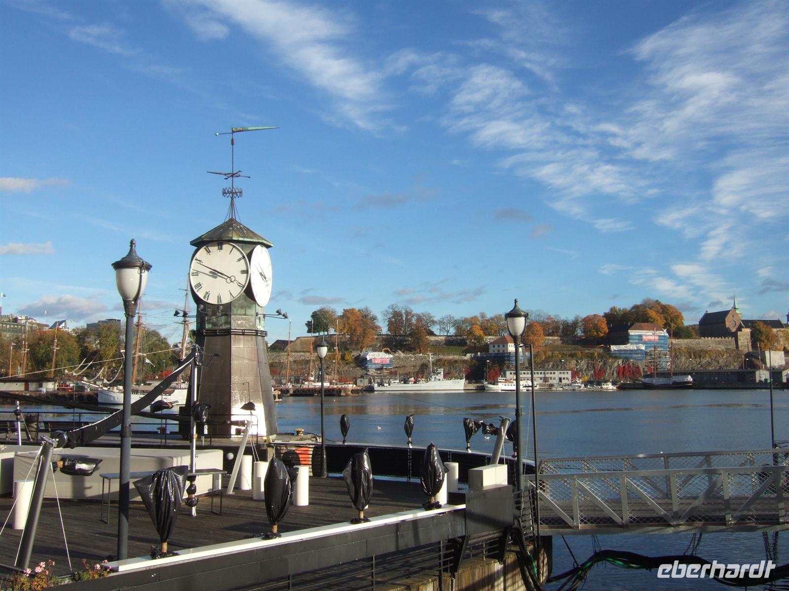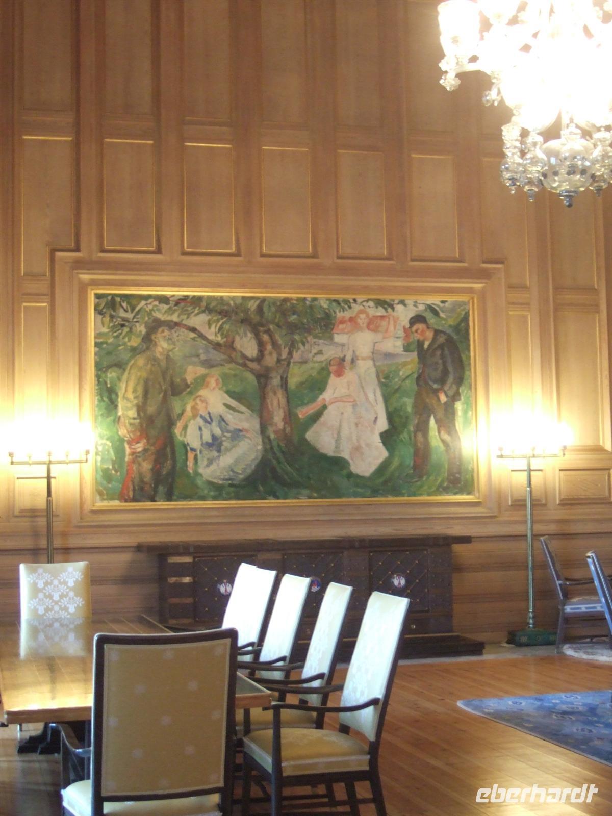 Bei herbstlichen Temperaturen, aber strahlendem Sonnenschein genießen wir den Bummel durch die Einkaufsstraße mit Blick aufs Königliche Schloss, bevor wir am Nationaltheater Richtung dem Stadtteil „Aker Brygge“ abbiegen. Unser erstes Ziel, das 1950 eröffnete Rathaus, erreichen wir bald und besichtigen die großzügigen Räume und Wandgemälde. Es bietet sich uns auch ein herrlicher Blick auf den Oslofjord, bevor wir sogar die Gelegenheit bekommen, den Sitzungssaal zu durchschreiten. Zudem dürfen wir eine Sammlung von Gastgeschenken aus vielen Teilen der Erde bewundern und Olympiamedaillen von 1952. In jedem Jahr wird in diesem Gemäuer am 10. Dezember, dem Todestag von Alfred Nobel, der Friedensnobelpreis im Osloer Rathaus verliehen. Aber in diesem Jahr ist noch nicht sicher, wer den Preis entgegennehmen wird. Anschließend setzen wir unseren Spaziergang fort und laufen durch den Park an der Festung Akershus, weiter