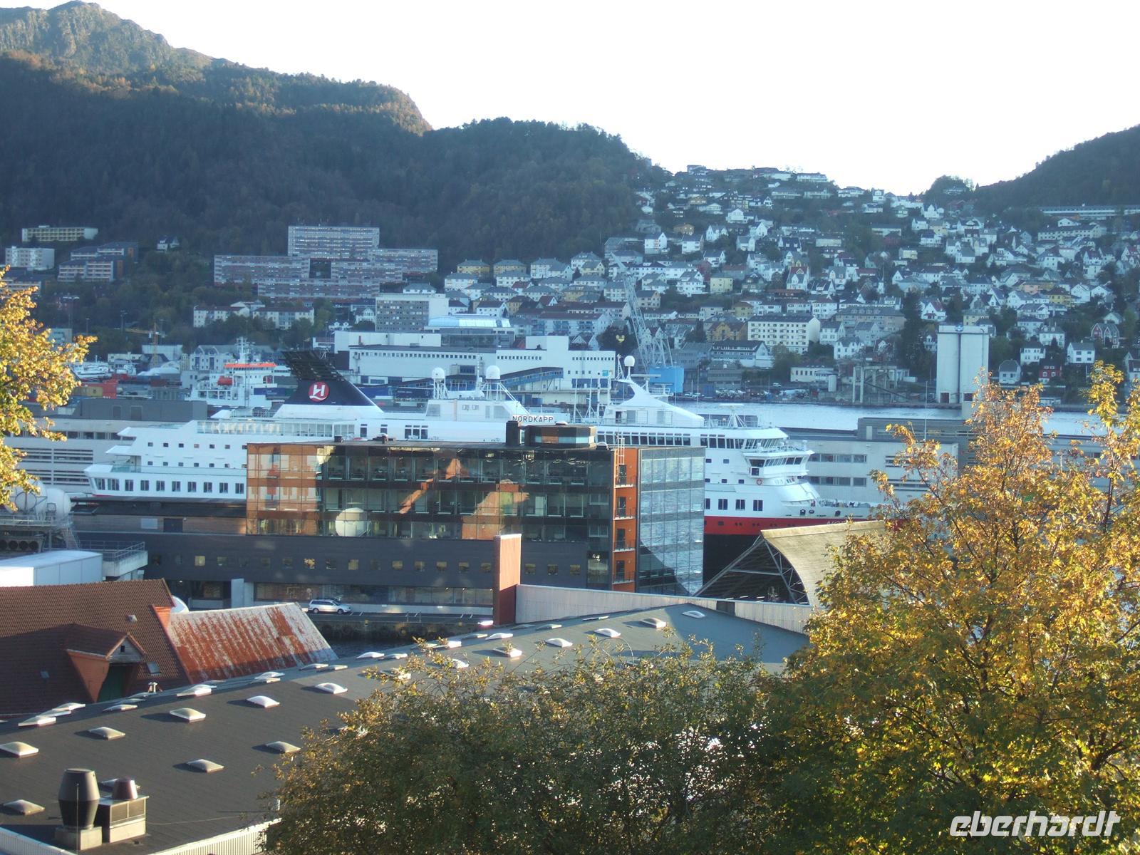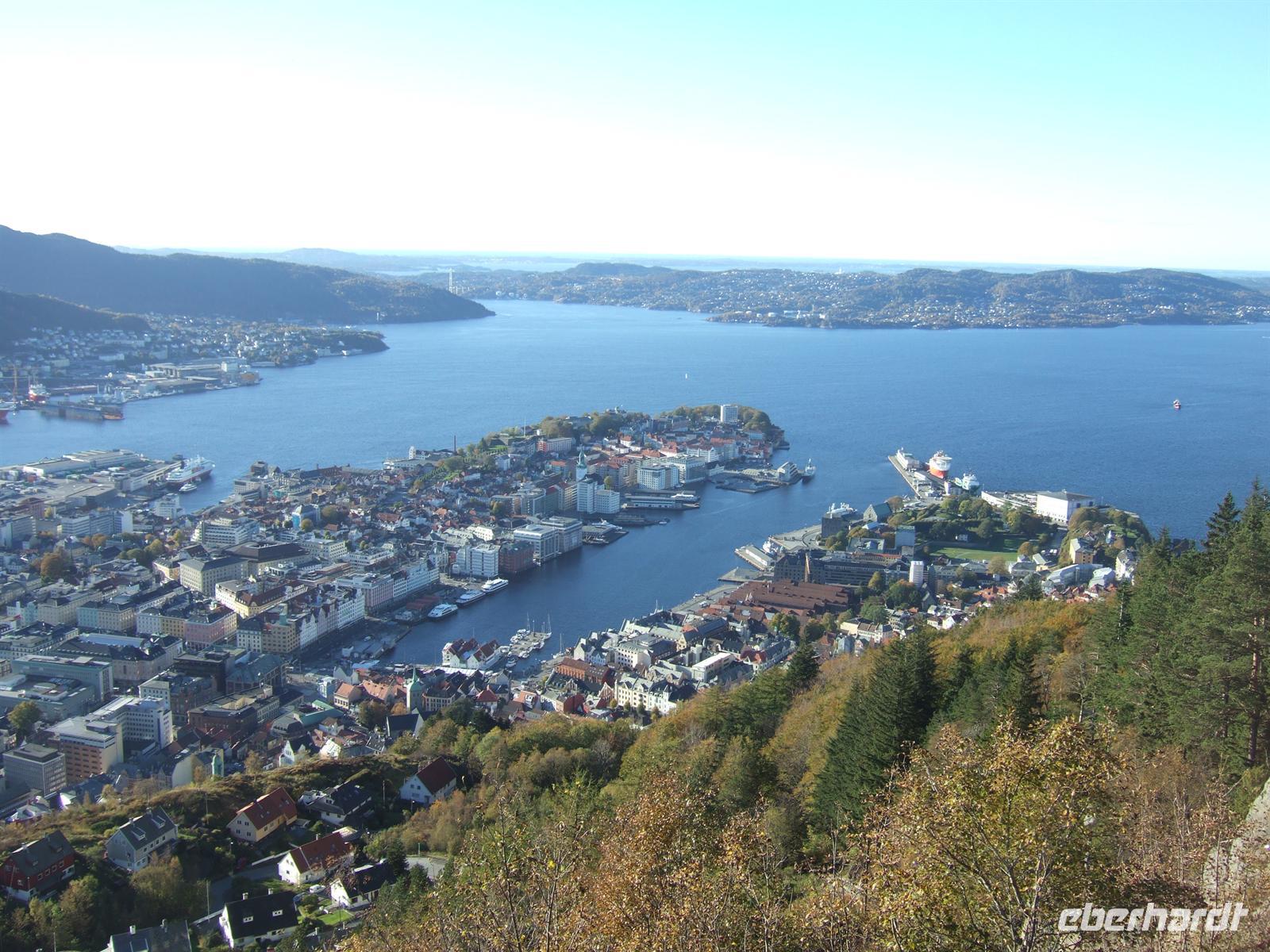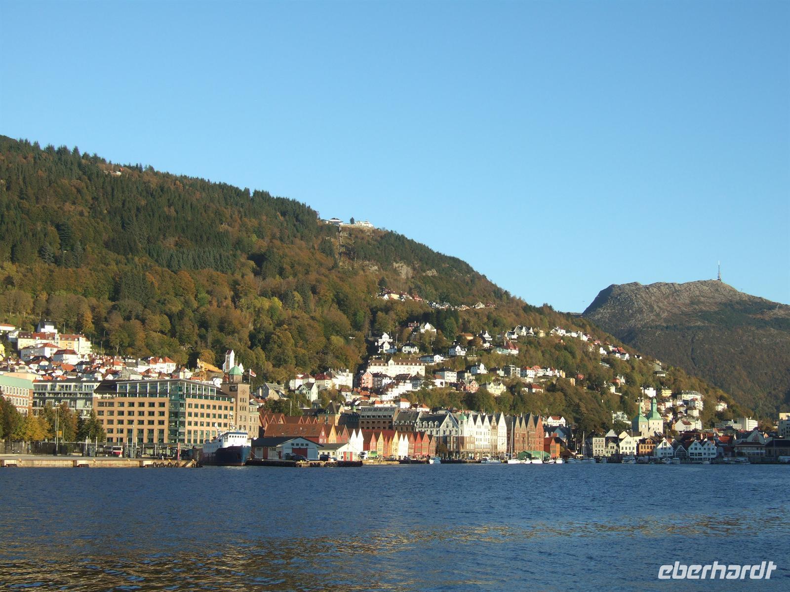 Am Nachmittag kommen wir pünktlich in Bergen an, wo bereits Reiseleiterin Malfrid auf uns wartet. Bei wiederum traumhaftem Herbstwetter starten wir unsere Stadtrundfahrt und passen das Programm diesem herrlichen Tag an. Nach Zustimmung aller Gäste entscheiden wir uns nach einem kurzen Bummel über den berühmten Fischmarkt für eine Fahrt mit der Floyenbahn (Zusatzkosten 56 NOK), die uns auf den Hausberg der Stadt Bergen bringt.