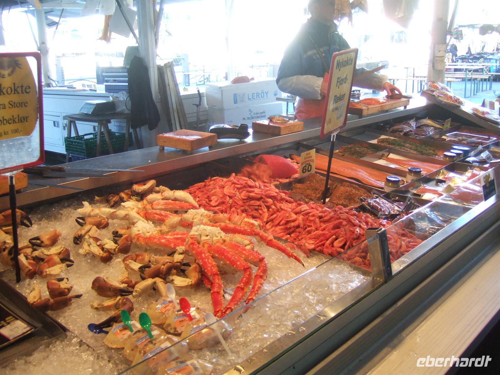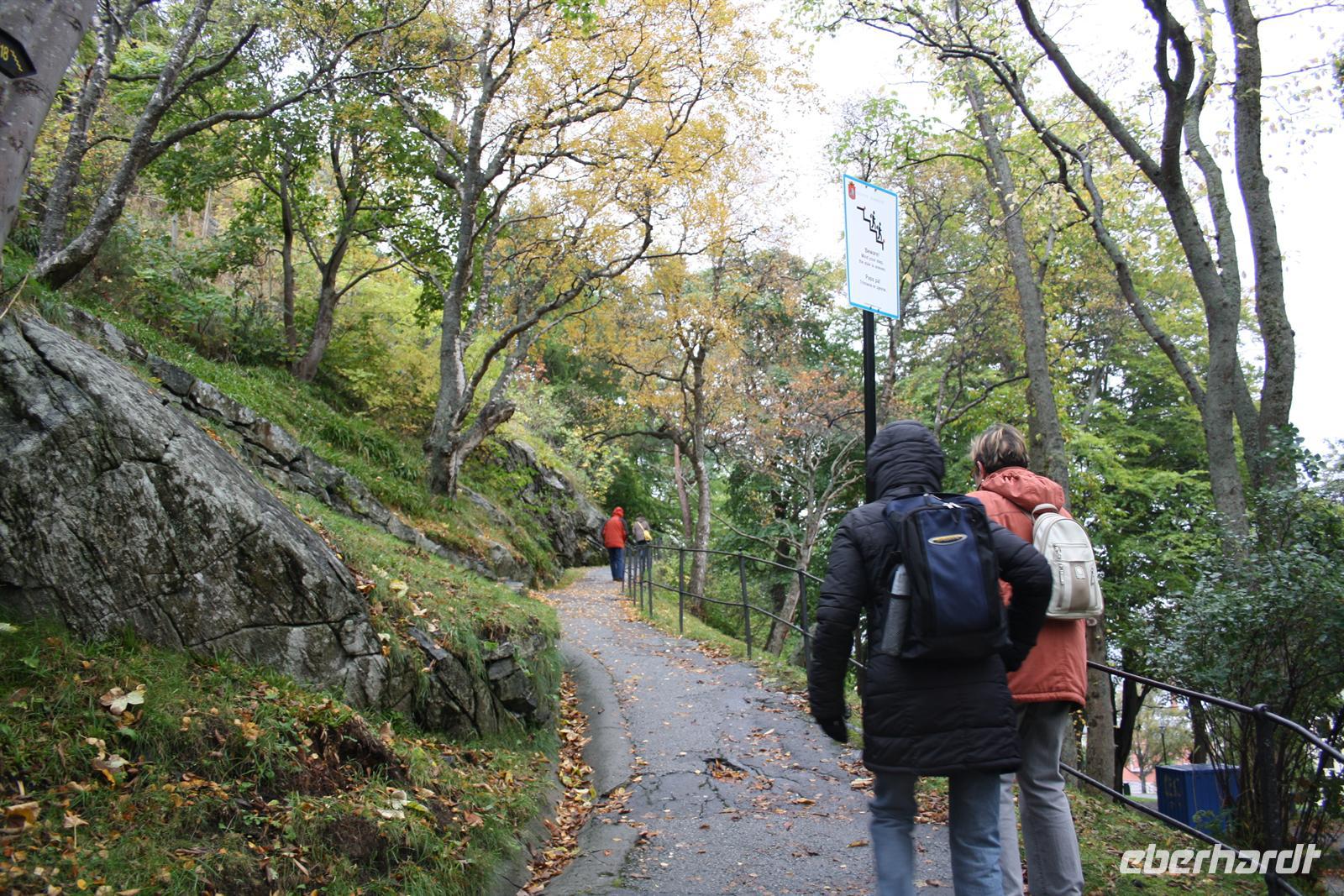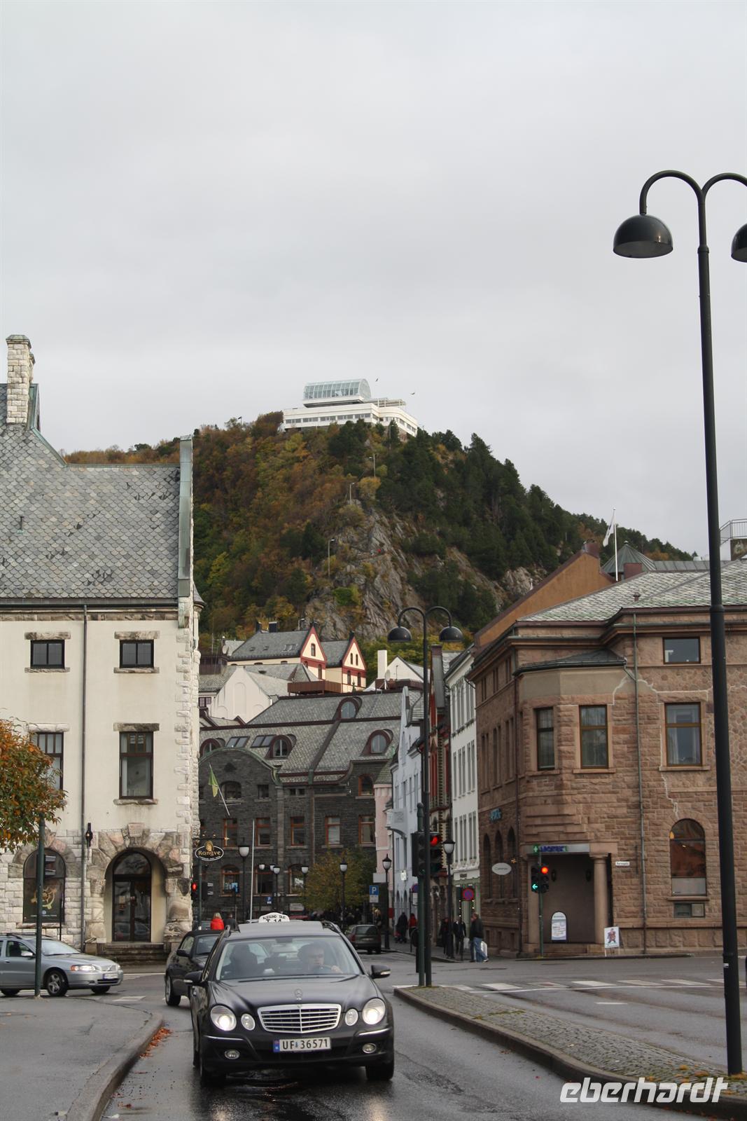 Am Nachmittag kommen wir pünktlich in Bergen an, wo bereits Reiseleiterin Malfrid auf uns wartet. Bei wiederum traumhaftem Herbstwetter starten wir unsere Stadtrundfahrt und passen das Programm diesem herrlichen Tag an. Nach Zustimmung aller Gäste entscheiden wir uns nach einem kurzen Bummel über den berühmten Fischmarkt für eine Fahrt mit der Floyenbahn (Zusatzkosten 56 NOK), die uns auf den Hausberg der Stadt Bergen bringt.