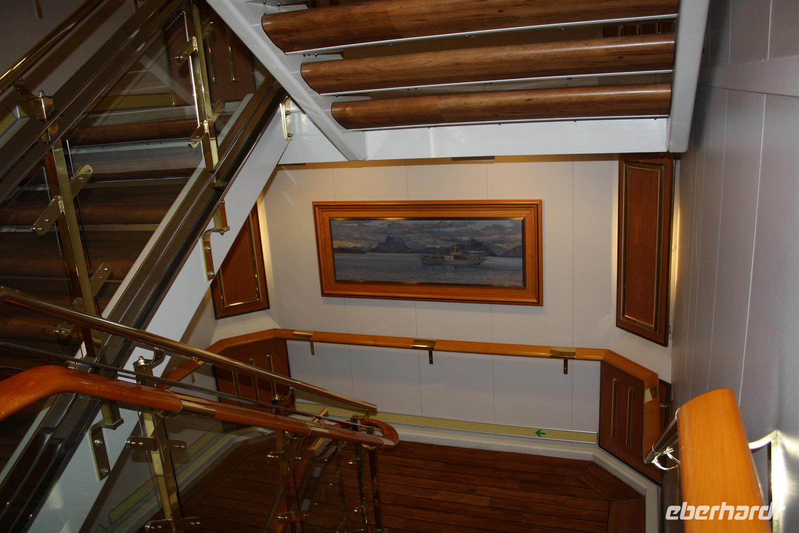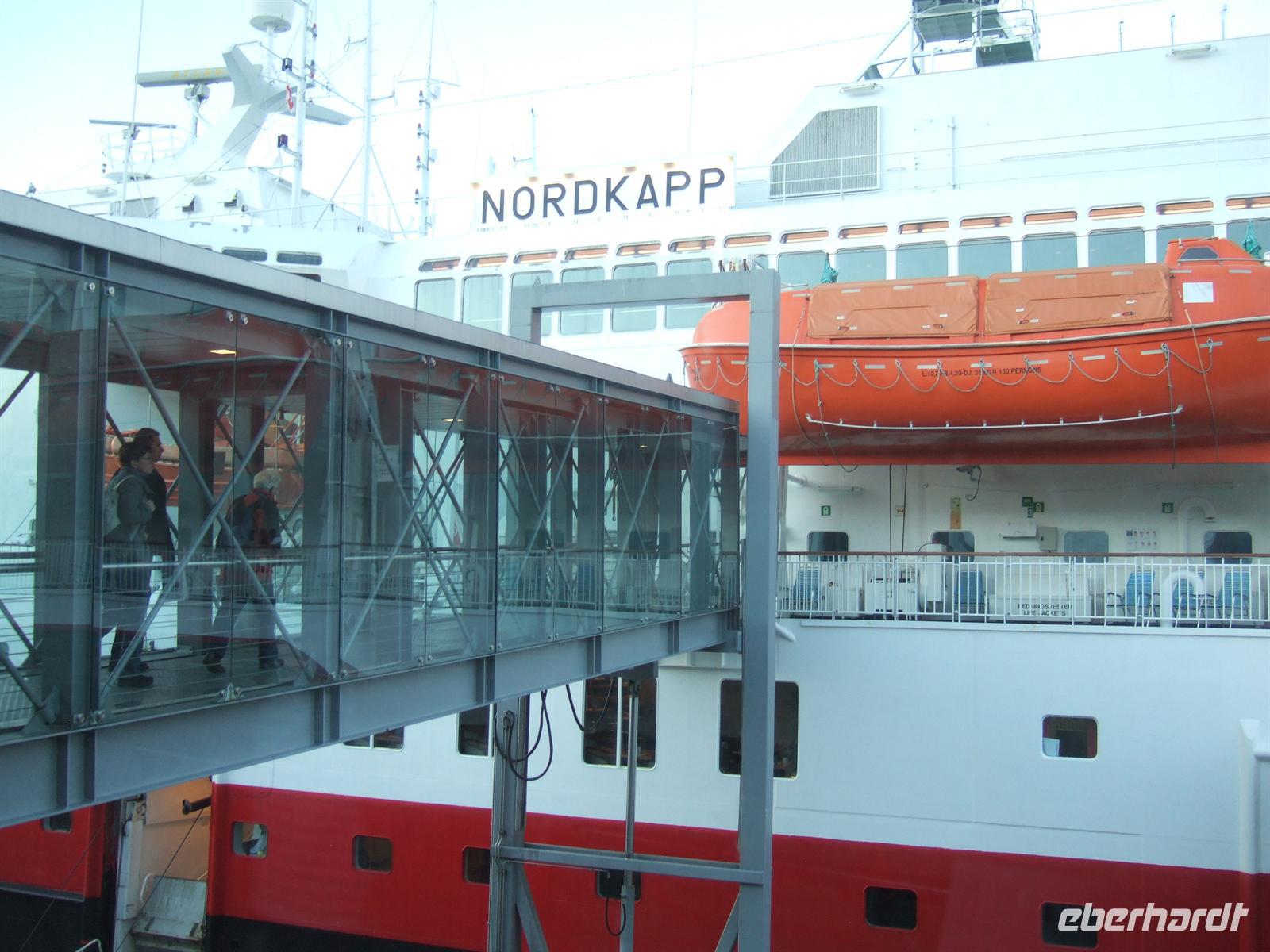 Unsere Rundfahrt endet am Hurtigrutenterminal, mitten in Bergen, wo der Check-In kurz und schmerzlos verläuft. Jeder Gast erhält einen Umschlag, der u.a. die Bordkarte enthält sowie ein Eberhardt-Schlüsselband zum Umhängen, welches sich als sehr nützlich erweisen wird. Auf dem Umschlag stehen ebenfalls die Essenszeiten und unsere reservierten Tische, die ab dem Abendessen am 2. Tag gelten werden. Nach einer kurzen Fahrt mit der Rolltreppe und einem ersten Registrieren der Bordkarte machen wir uns über Deck 5 auf den Weg an Bord der MS „Nordkapp“.