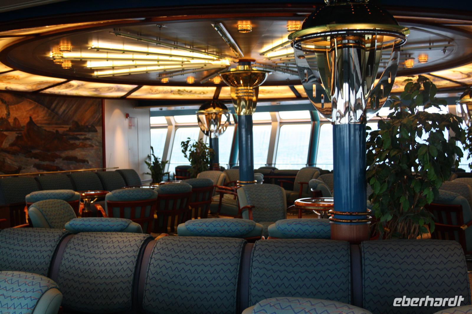 Die riesige Fähre verfügt über insgesamt 15 Decks, ist 224 Meter lang und fasst ca. 2600 Gäste. Im Herzen der „Color Fantasy“ befinden sich mehrere Bars, Cafés und Boutiquen, die zum Einkehren einladen. Einen tollen blick verspricht die Observation Lounge auf Deck 15, von wo man einen traumhaften Blick aufs Meer genießt. Einige Gäste nutzen die Möglichkeit an Bord, Norwegische Kronen einzutauschen. Trotzdem bleibt auch Zeit, ein wenig die Augen zu schließen und wieder Energie zu tanken. Um 18:00 Uhr verabreden wir uns vor dem Buffet-Restaurant auf Deck 6, wo für unsere Gruppe eine Tafel für 12 Personen reserviert ist. Das Buffet hält viele Leckereien für uns bereit, von Vorspeisen über Hauptgänge bis hin zu Desserts. Entscheiden müssen wir uns zwischen allerlei Krabben, einer Hummersuppe, Wildfrikadellen, Lachs, und zu guter Letzt süßen Desserts wie Eis oder Kuchen und Früchten. Die Wahl fällt nicht leicht! Nachdem wir uns reichlich gestärkt haben, wird eine Show in der Fantasy Show Lounge angeboten. Um 19:00 Uhr sowie um 21:00 Uhr heißt es Vorhang auf für „Oh, what a day!“ mit vielen bekannten Melodien. Danach bleibt außerdem Zeit, zu tanzen oder einen Drink in der Bar zu genießen.
