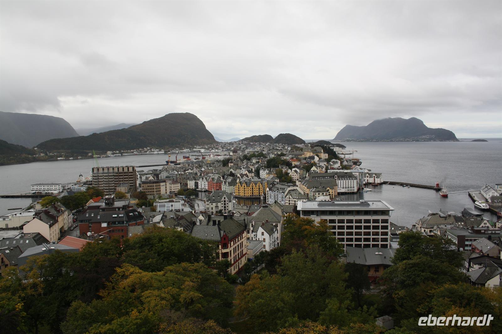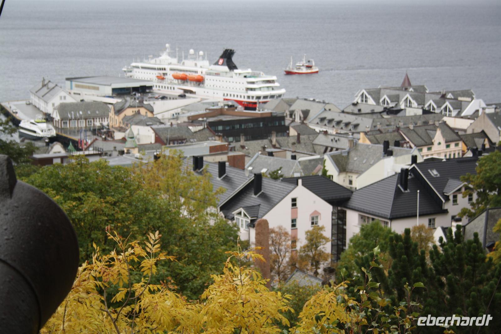 Bereits in den frühen Morgenstunden legen wir in den kleinen Häfen Floro und Maloy an, was aber die meisten von uns gar nicht mitbekommen, da sie noch friedlich schlummern. Während sich unsere Gruppe beim Frühstück stärkt, überquert MS „Nordkapp“ erstmals auf dieser Reise ein längeres Stück offenes Meer. Die Dühnung ist relativ stark und so merken wir schnell, dass wir auf einem Schiff unterwegs sind. Für die Gäste, denen die unruhige See zusetzt, helfen Seekrankheitstabletten, die in der Caféteria käuflich zu erwerben sind. Gegen 10:15 Uhr erreichen wir Torvik und das Schiff liegt ruhig im Hafen, als wäre nichts gewesen;-) Unser erster längerer Stopp ist mit Alesund bald erreicht, wo wir von 12:00 bis 15:00 Uhr liegen. Nach einem frühen Mittagessen verabredet sich die Hälfte unserer Gruppe, um gemeinsam den Hausberg „Aksla“ zu besteigen. Als wir das Schiff verlassen, regnet es in Strömen. Aber da wir nicht aus Zucker sind, machen wir uns trotzdem auf den Weg.