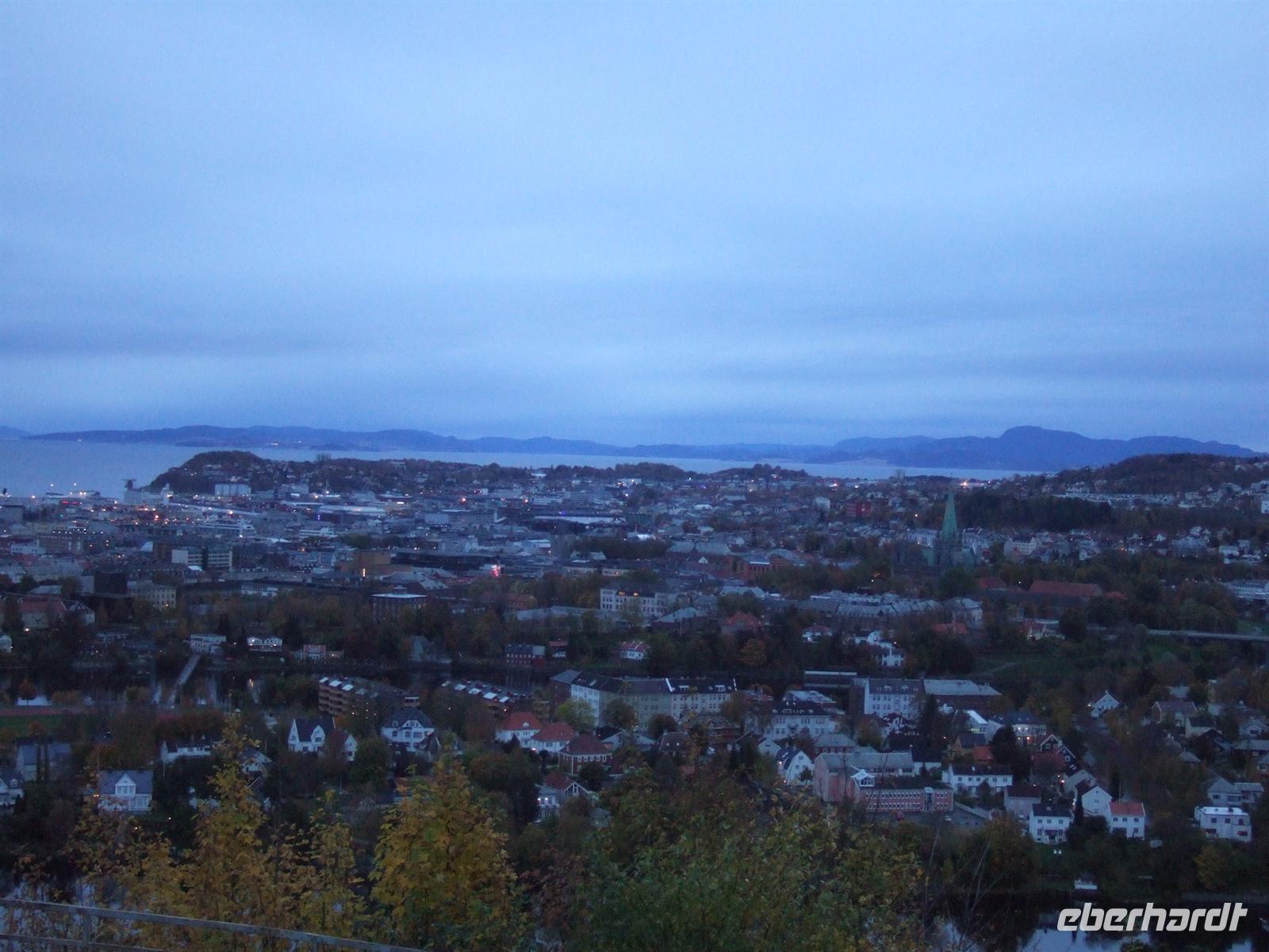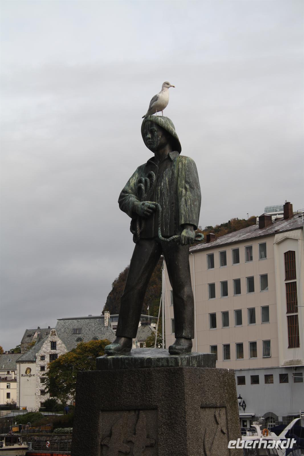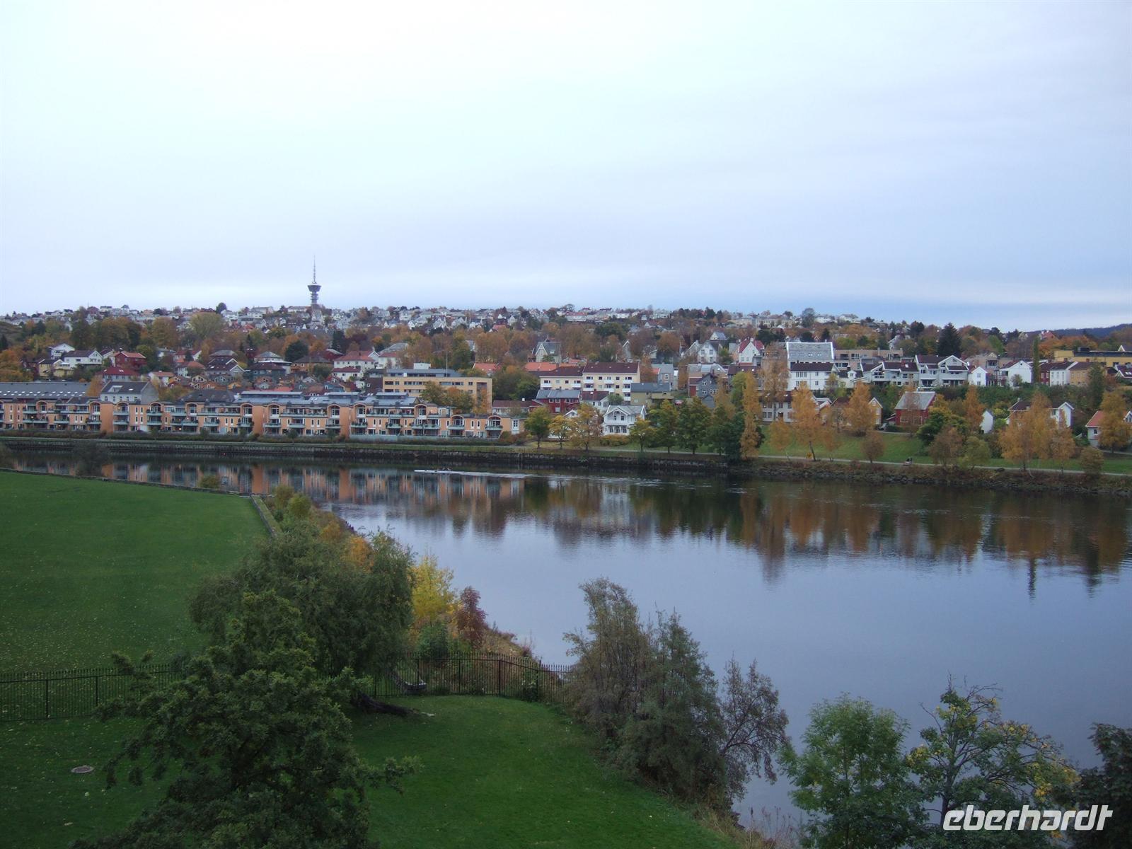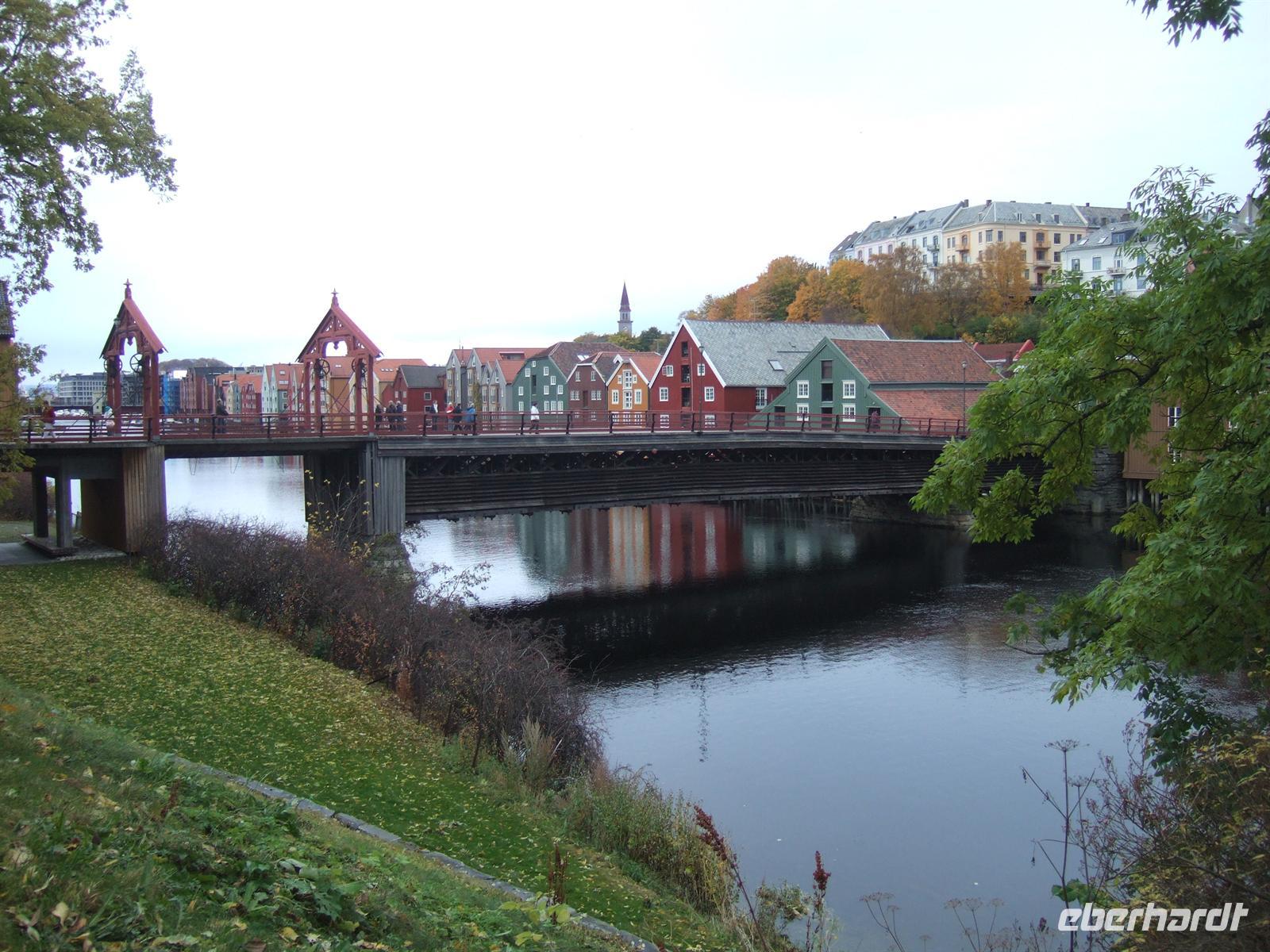 Nachdem das Gebäude über die Jahre von fünf verheerenden Bränden heimgesucht worden ist, konnte der Dom erst Mitte des 19. Jahrhunderts - dank des norwegischen Nationalbewusstseins - wieder restauriert werden. Der Dom beherbergt zwei Orgeln, wovon eine aus dem Brandenburgischen stammt. Klänge dieser Orgel begleiten uns ins Freie, da bereits für den sonntäglichen anstehenden Gottesdienst geprobt wird. Im Anschluss an die Führung steht uns frei, den Bus zum Hafen zu nehmen oder zurück zu spazieren. Da noch ca. zwei Stunden verbleiben, überlegen wir nicht lang und entscheiden uns für den Spaziergang. Am Fluss Nidelva entlang, führt uns der Weg durch eine bunte Herbstlandschaft zur Alten Stadtbrücke, von wo uns ein schöner Blick auf die bunt bemalten Lagerhäuser erwartet. Nach einer kurzen Stippvisite auf der anderen Seite der Brücke, deren Häuser und Gässchen uns in die mittelalterliche Zeit versetzen, gehen wir in Richtung Innenstadt. Von Weitem erkennen wir die den Marktplatz zierende Granitsäule mit der Statue des Stadtgründers Olav Tryggvason.
