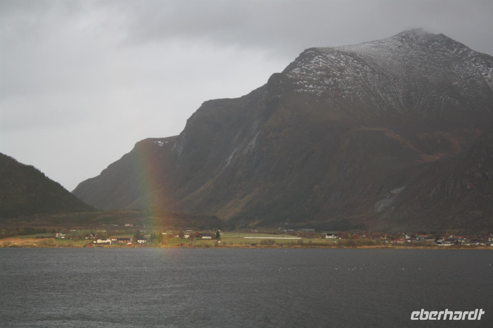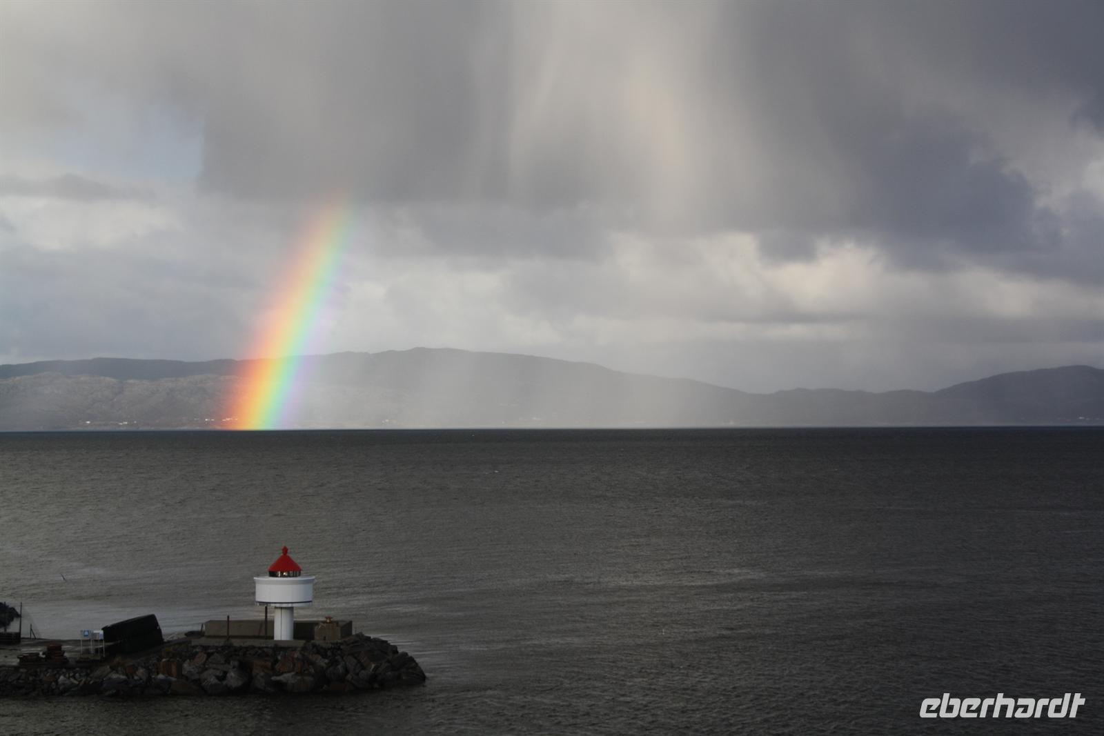 erreichen wir erneut den Globus, der den Polarkreis markiert. Bevor Stopps in Nesna und Sandnessjoen auf dem Routenplan stehen, treffen die in Trondheim abreisenden Gäste Peter, den Tour Manager, welcher Abreiseinformationen preisgibt. Da wir leider dazugehören, erfahren wir, dass unsere Koffer bis spätestens 24:00 Uhr vor die Kabine gestellt werden sollen, von wo sie dann von Matrosen aufs Autodeck gebracht werden. Zudem teile ich nochmals den Zeitplan für den kommenden Tag mit und beantworte offene Fragen. Nachdem wir die kleine Stadt Sandnessjoen verlassen haben, zeigt sich uns ein farbenfroher Regenbogen von eindrucksvoller Intensität, der natürlich auf dem Foto festgehalten werden muss.