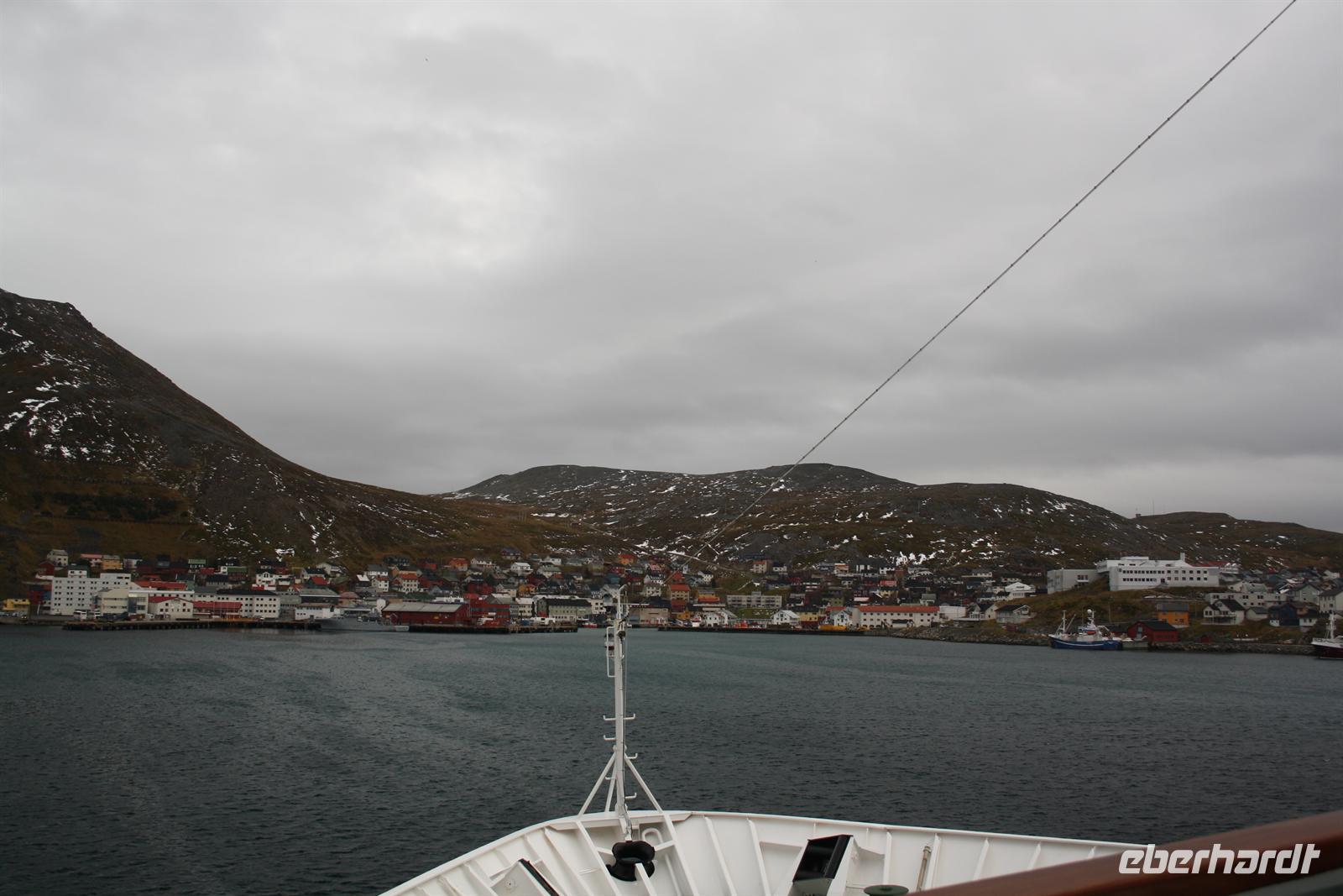 Momentan wird leider der Sockel am Globus überholt, so dass man zum Teil die Holzverkleidung auf dem Foto sehen wird. Aber solche Reparaturarbeiten sind nur in der Nebensaison machbar, denn zu welch anderem Zeitpunkt kommen nur zwei Busse pro Tag hierher? Danach bleibt genügend Zeit um die Nordkap-Hallen zu erkunden, die man in den Fels hat sprengen lassen. Sie beherbergen auf vier Stockwerken u.a. eine Caféteria, einen Postschalter sowie einen riesigen Souvenirshop, eine Kapelle, einen weiteren Aussichtspunkt mit Bar sowie ein Kino. Hier wird auf einer Breitleinwand alle 30 Minuten ein Film über die Schönheiten der Nordkap-Gemeinde mit musikalischer Untermalung gezeigt, welcher ca. 15 Minuten Länge hat und sehr sehenswert ist. Es bleibt noch etwas Zeit, um Karten zu schreiben und sie direkt einzuwerfen, damit diese den begehrten Nordkapstempel erhalten. Anschließend begeben wir uns bereits wieder auf die Rückfahrt zum Schiff. Unsere Reiseleitung erinnert uns daran, dass der nördlichste Punkt des europäischen Festlands, das weiter westlich gelegene Kap Knivskjellodden ist, welches sich exakt 1380 Meter nördlicher als das Nordkap befindet. Allerdings gibt es da keinen Parkplatz und es tut dem Zauber des Nordkaps keinen Abbruch! Für die Leckermäulchen unter uns, wird nach Eintreffen an Bord heiße Schokolade und Waffeln oder Plunderteilchen verkauft, während sich MS „Nordkapp“ bereits auf den Weg nach Kjollefjord macht, wo wir nur kurz halten. Der Folgehafen Mehamn, den wir während unseres Abendessens anlaufen, ist der nördlichste Hafen unserer Reise. Berlevag bildet an diesem Tag den Abschluss unserer Stopps, der aber auch nur kurz ausfällt.