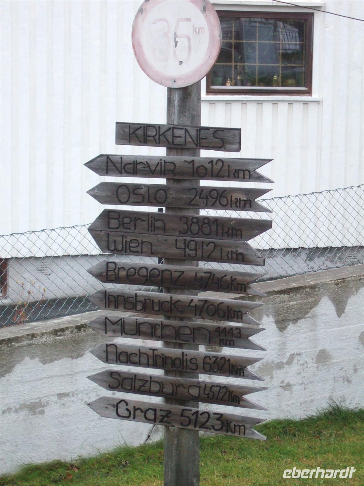 Doch Kirkenes ist heute der Haupthafen, den wir am Mittag erreichen und ist zugleich Endpunkt der nordgehenden Route. Einige Mitreisende verlassen uns bereits heute, so dass die ohnehin überschaubare Passagierzahl noch weiter schrumpft. Zwei Gäste nehmen an dem angebotenen Ausflug per Bus teil. Nach einer Stadtrundfahrt durch das Zentrum geht die Busfahrt weiter durch die fruchtbare Landschaft bis zur Grenzstation Storskog. Am Übergang zwischen Norwegen und Russland kann man in dem kleinen Kiosk Mitbringsel aus beiden Ländern erwerben. Einige Gäste unserer Gruppe machen sich trotz Nieselregens zu Fuß auf den Weg in die Innenstadt von Kirkenes. Dieser 3.300 Einwohner zählende Ort wurde erst Anfang des 20. Jahrhunderts gegründet und während des Zweiten Weltkrieges als Basis für den Angriff auf das russische Murmansk zur Festung Kirkenes ausgebaut. Der wichtigste Versorgungshafen Russlands konnte dennoch nicht eingenommen werden, stattdessen wurde Kirkenes neben Malta das meist bombardierte Ziel im Zweiten Weltkrieg. Vorbei an Supermärkten und Straßenschildern mit norwegischer und russischer Aufschrift legen wir einen kurzen Stopp an einem Wegweiserschild aus Holz ein, wo die Entfernungen in einige europäische Städte angezeigt werden (z.B. Berlin 3881 km).