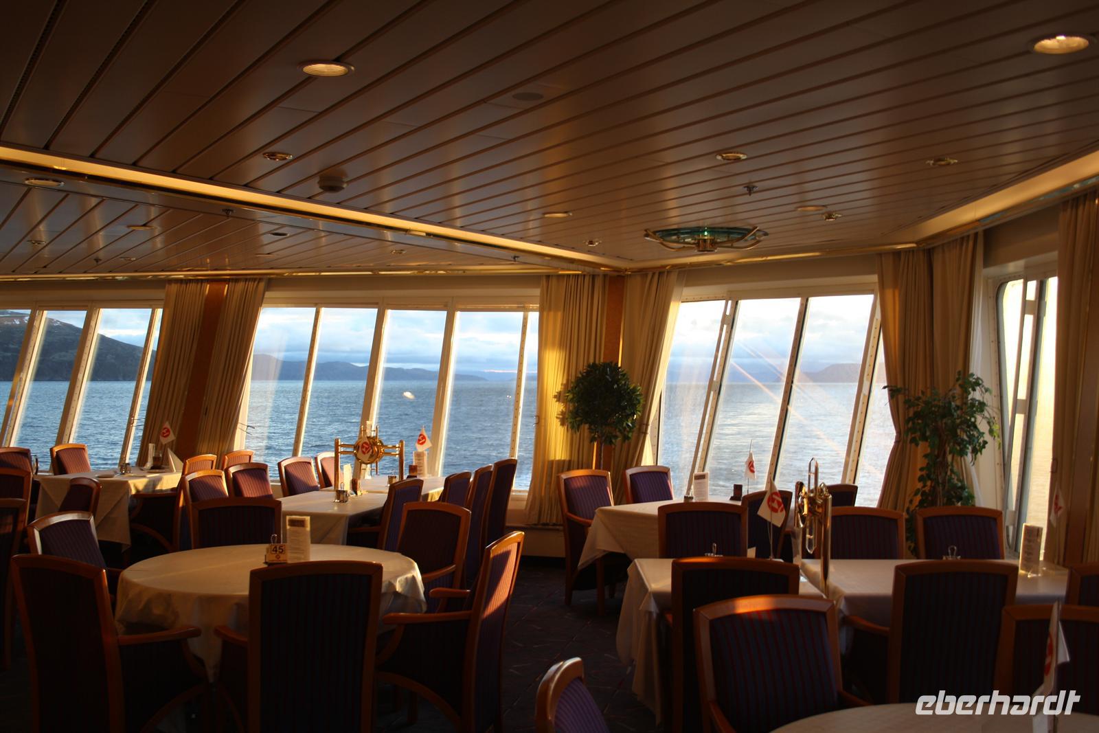 Zurück an Bord, freuen wir uns auf das Mittagsbuffet und lassen uns Suppe, Fisch in vielen Variationen und nicht zu vergessen die Süßspeisen schmecken. Nach dem Mittagessen haben wir uns ein Schläfchen verdient, bevor 16:15 Uhr die Durchsage ertönt, dass MS „Nordkapp“ in Kürze in den engen Stokksund einfahren wird.
