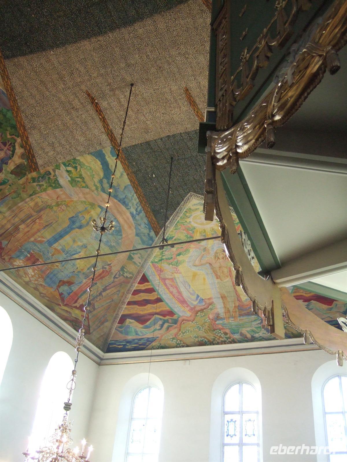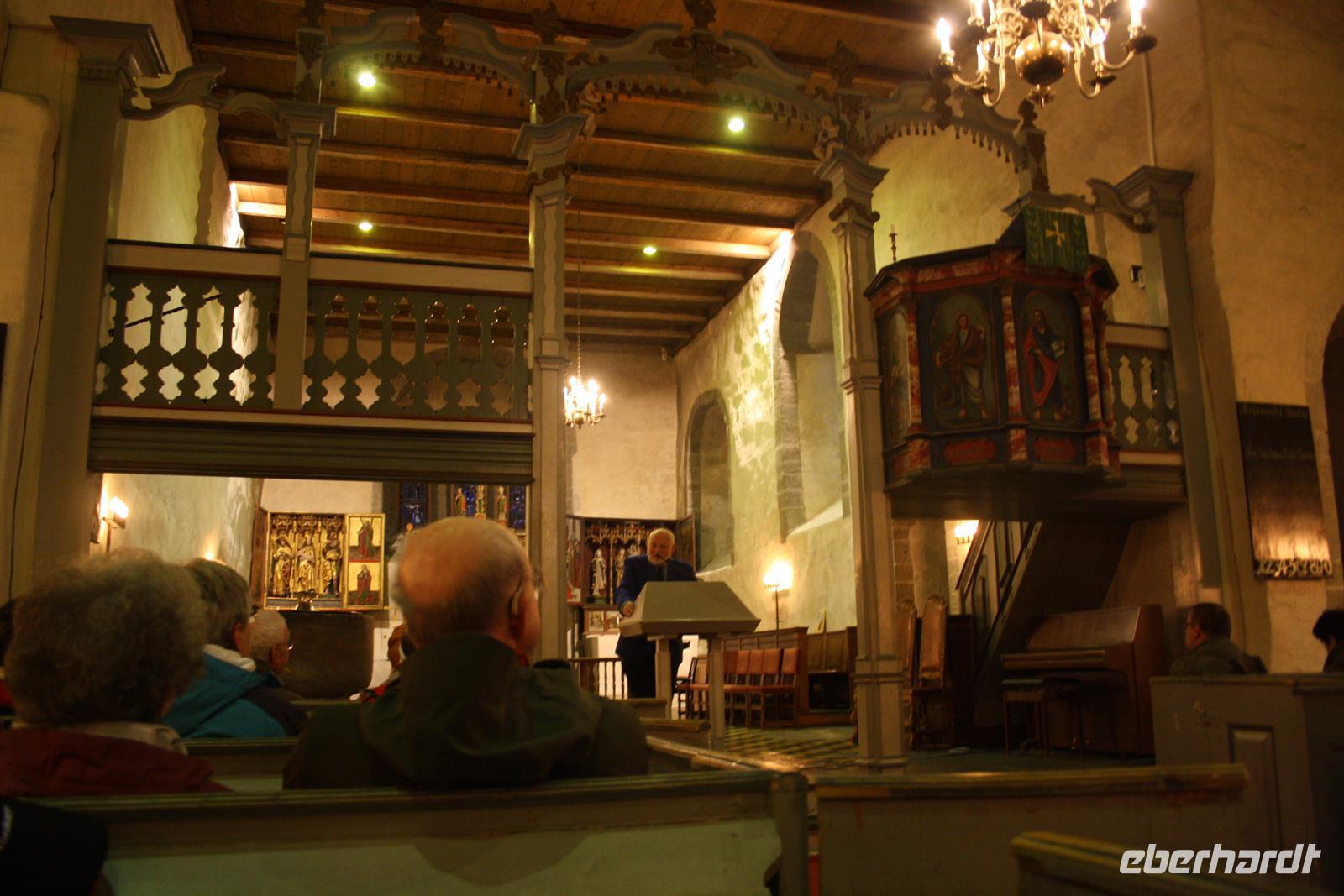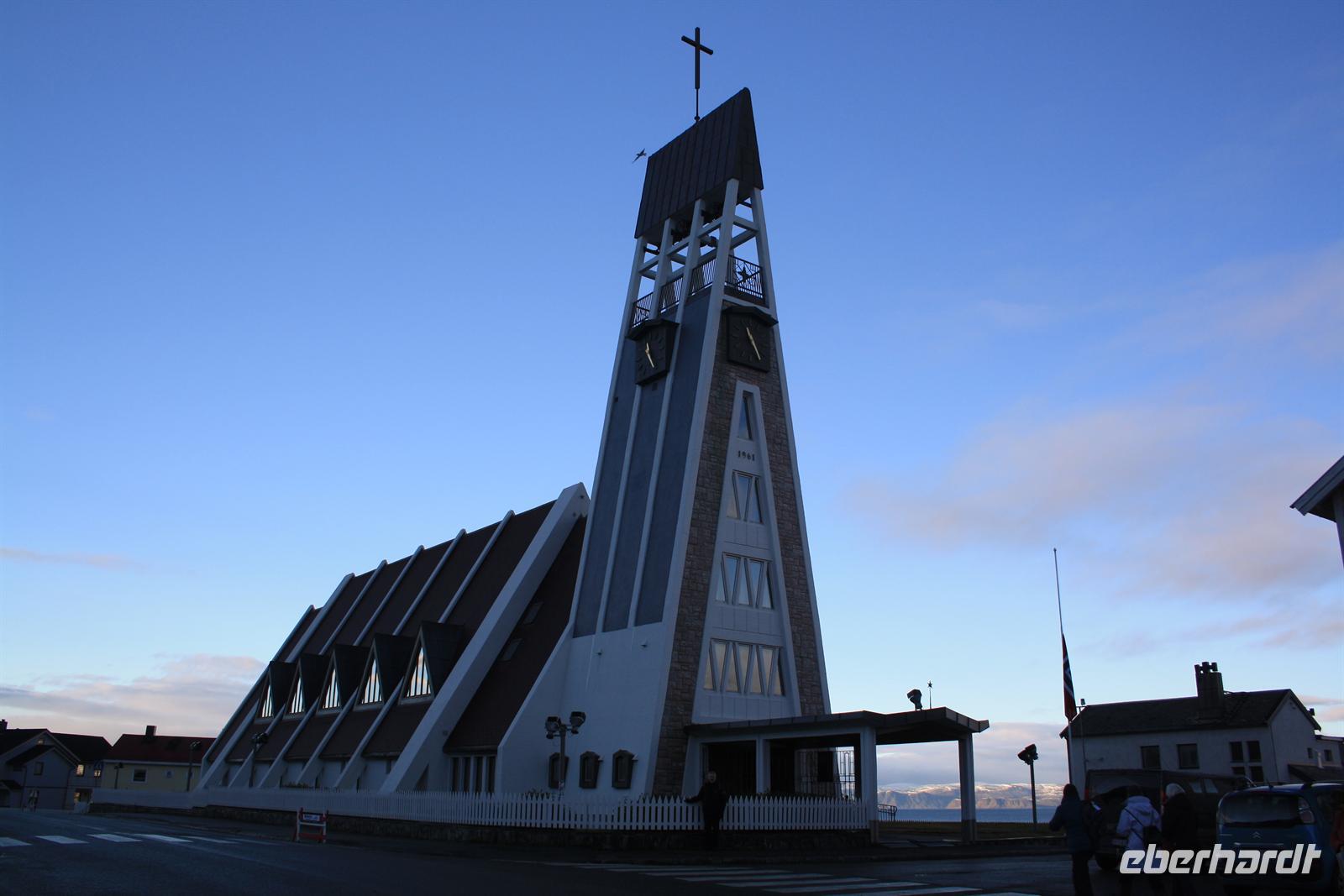 Doch dann ist es soweit und das heute ca. 6.800 Einwohner zählende Hammerfest zeigt sich an diesem Vormittag in einem besonders schönen Licht. Die Sonne scheint, der Himmel könnte blauer nicht sein, macht sich unsere Gruppe auf den Weg zur Hammerfest-Kirche. Der Weg führt uns am Wiederaufbau-Museum vorbei, welches anschaulich über die Zwangsevakuierung der Bevölkerung, das Niederbrennen und vor allem den Wiederaufbau der Stadt sowie Region nachdem Zweiten Weltkrieg informiert. Nicht weit entfernt liegt unser erstes Ziel und wir erreichen die Kirche, die zwar nüchtern eingerichtet ist, aber mit einem dreieckigen mit Glasmalereien verzierten Fenster von 8 Meter Kantenlänge beeindruckt.