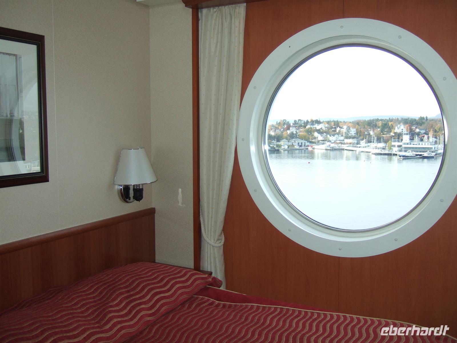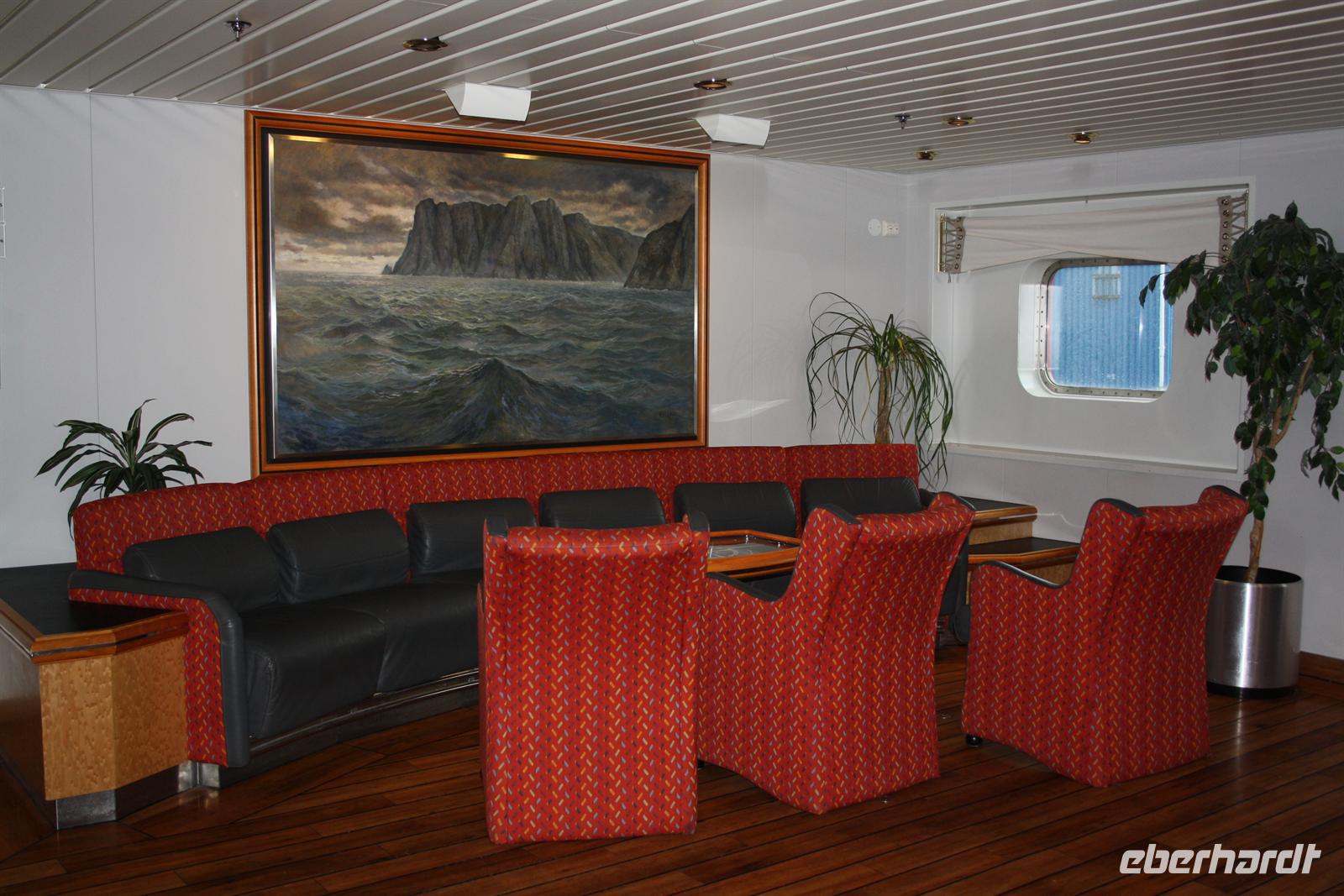 Die erste Zahl der Kabinennummer verrät immer das Deck, so dass sich schnell jeder Gast zurecht findet. Vor den Kabinen warten bereits unsere Koffer, die demnächst ausgepackt werden wollen. Aber zuerst stärken wir uns im Restaurant „Nessekongen“ beim Abendessen, welches am ersten Abend traditionell in Buffetform gereicht wird. Bevor wir uns in der Kabine einrichten, entdecken wir die Annehmlichkeiten des Schiffes MS „Nordkapp“: Svalbard Salon und Panorama Lounge „Polarsirkelen“ auf Deck 7, Ut-Rost-Café, eine Boutique, Bibliothek sowie Internetecke auf Deck 4, zudem einen Fitnessraum und eine Sauna auf Deck 2. Insgesamt verfügt das Schiff über 218 Kabinen und fasst 691 Passagiere. Doch uns ruft am ersten Abend noch die Pflicht, denn um 20:30 Uhr bekommen wir eine Sicherheitseinweisung im Konferenzraum auf Deck 4, wo auch die Offiziere vorgestellt werden.