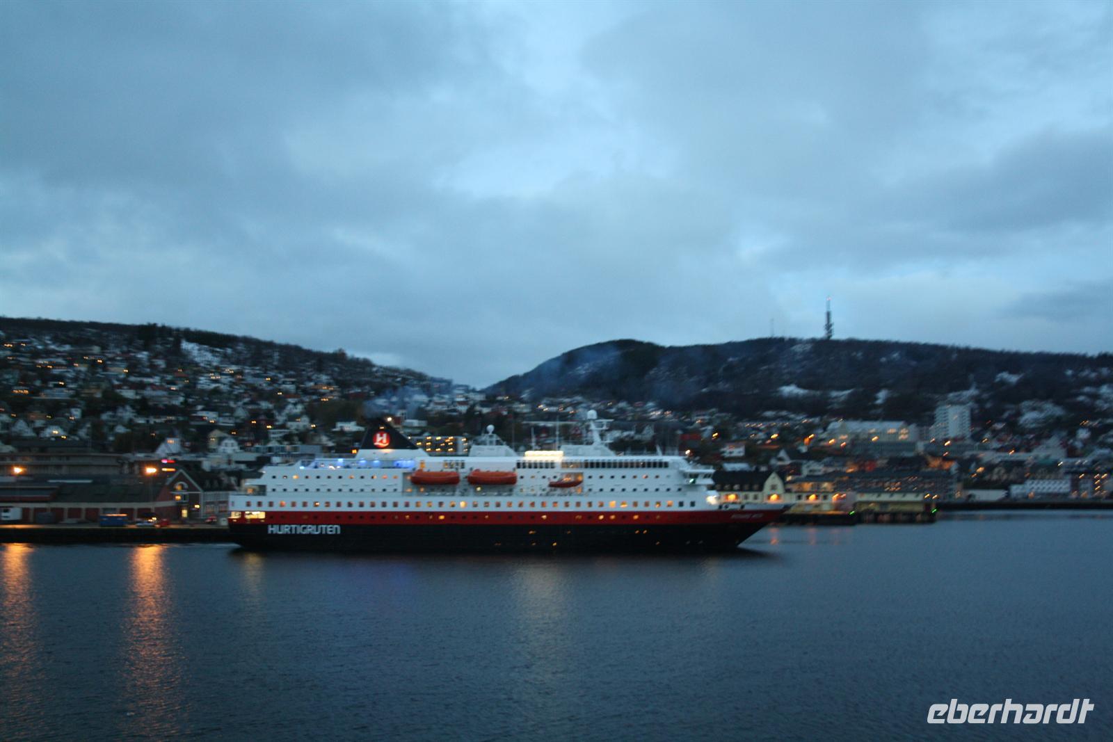 Unterwegs finden sich immer wieder tolle Fotomotive. Nach einem ca. 2 Stunden dauerndem Stück auf offenem Meer, legen wir während des Abendessens in Skjervoy an. Dann rappelt es ganz schön und zum Teil müssen die Gläser und Teller gut festgehalten werden, damit sie nicht vom Tisch fallen. Gegen 21:15 Uhr passieren wir die nordwärtsgehende Hurtigrute MS „Nordlys“, bevor wir ca. 2 Stunden später zum zweiten Mal Tronsö erreichen. Diesmal schneit es nicht, aber es ist ein schön anzuschauendes Lichtermeer, welches wir gegen Mitternacht ansteuern.