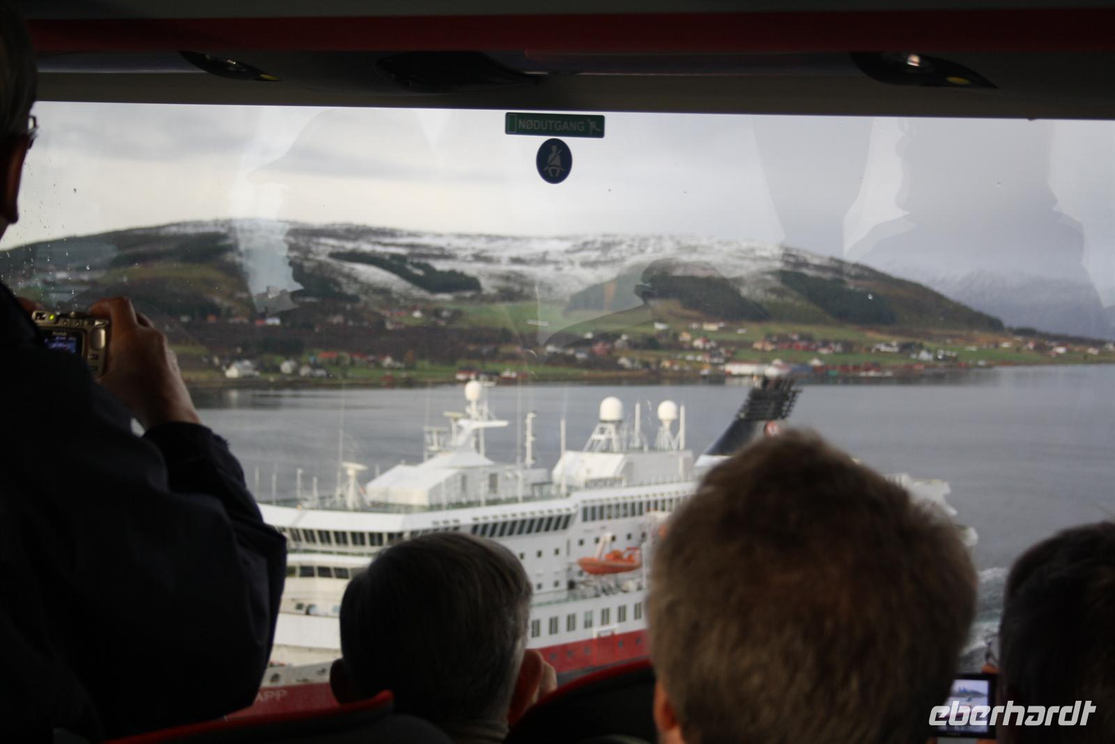 Nachdem alle Gäste im Ausflugsbus sitzen, beginnt die Tour mit einer Rundfahrt durch Harstad, heutzutage ein wichtiges Handels- und Verkehrszentrum in Nordnorwegen. Auf der Halbinsel Trondenes angekommen, hat zunächst die Ausfahrt von MS „Nordkapp“ aus dem Hafen Harstad höchste Priorität, bildet sie doch ein schönes Fotomotiv.