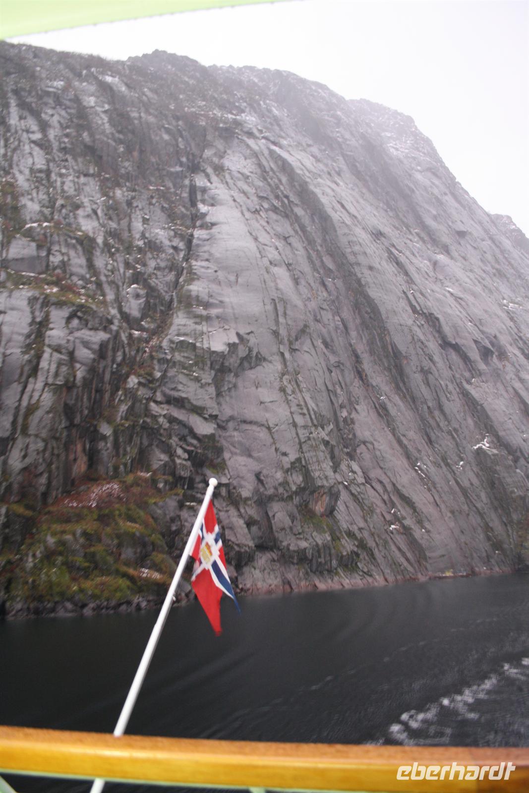 Nachdem wir den Hafen verlassen haben, fahren wir bald in den 26 Kilometer langen Raftsund, der die beiden Inselgruppen Vesteralen und Lofoten voneinander trennt. Heute biegen wir in den nur 1 Kilometer kurzen, aber sehr beeindruckenden Trollfjord ein, wo die Ein- und Ausfahrt nur 100 Meter schmal ist. Das Wetter ist eher mystisch, aber dennoch hat man das Gefühl, die links und rechts aufragenden Felswände problemlos berühren zu können.