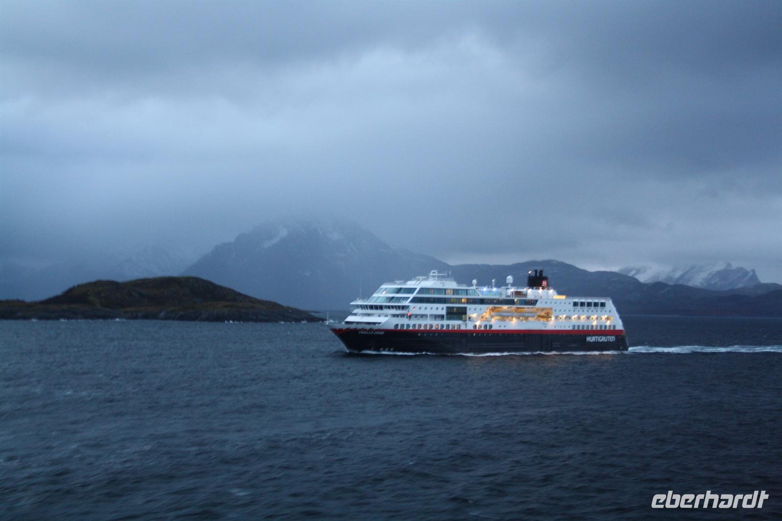 Bevor am heutigen Tag erneut der Polarkreis überquert wird, begegnen wir der nordwärtsgehenden Hurtigrute MS „Trollfjord“. Während wir uns das Frühstück schmecken lassen,