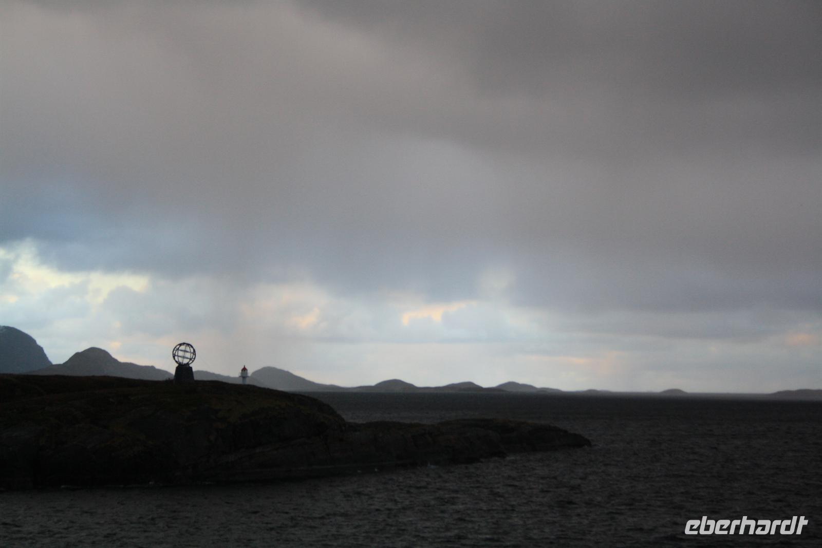 Während die meisten Gäste noch selig schlummern, legt MS „Nordkapp“ bereits am frühen Morgen für kurze Zeit in den Häfen Bronnoysund, Sandnessjoen und Nesna an. Zwischen 06:30 Uhr und 08:00 Uhr steht am heutigen Tag die Polarkreisüberquerung auf dem Programm. Bis zum Vorabend durfte geraten werden, zu welcher Zeit der Polarkreis überquert wird. Eine englischsprachige Mitreisende war bis auf 10 Sekunden sehr nahe dran, denn um 07:14:50 Uhr war es soweit. Es stellte sich als sehr vorausschauend heraus, den kleinen Globus zu beleuchten, der auf der imaginären Linie des Polarkreises auf einem kleinen Felssockel steht, denn es ist noch sehr dunkel, als wir ihn bei Regen passieren. Während wir mit Ornes den nächsten Hafen gegen 09:15 Uhr anlaufen, sitzen dann die meisten Gäste im Restaurant und lassen sich das Frühstück schmecken.