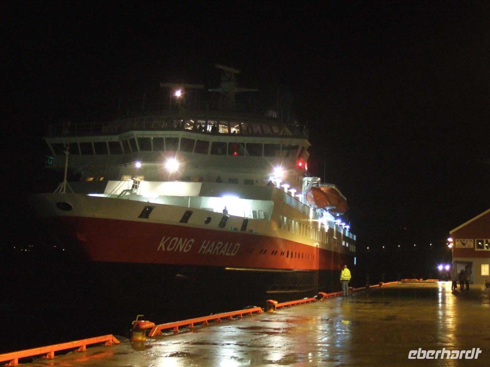 erneut in Rorvik an und haben dort die Möglichkeit, die nordwärtsgehende Hurtigrute MS „Kong Harald“ zu besichtigen, welche zunächst auf sich warten lässt. Der Kapitän bestätigt, dass stürmisches Wetter auf der Strecke herrscht und somit das Schiff etwas Verspätung haben kann. In dem Moment ist uns nicht wirklich bewusst, dass wir ja in diese Richtung weiterfahren. Also es ist, wie es kommen muss, während unserer letzten Nacht an Bord, schaukelt das Schiff etwas mehr als sonst und wir lassen uns in den Schlaf schaukeln.