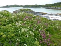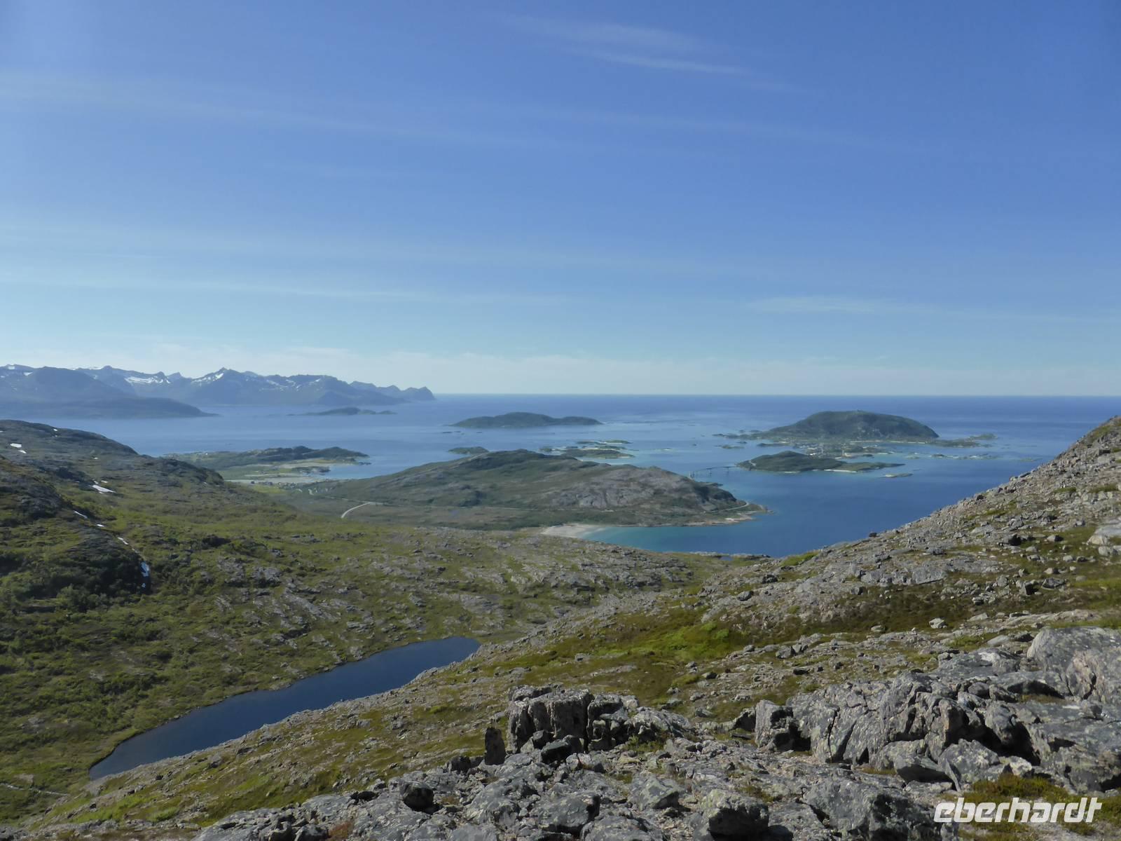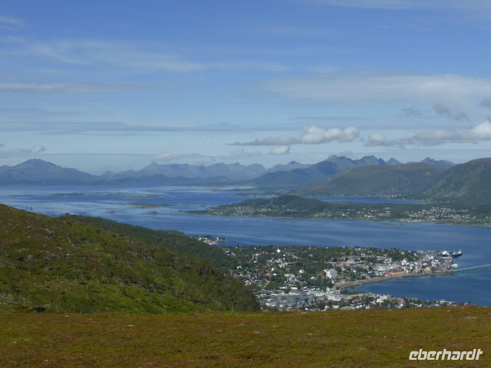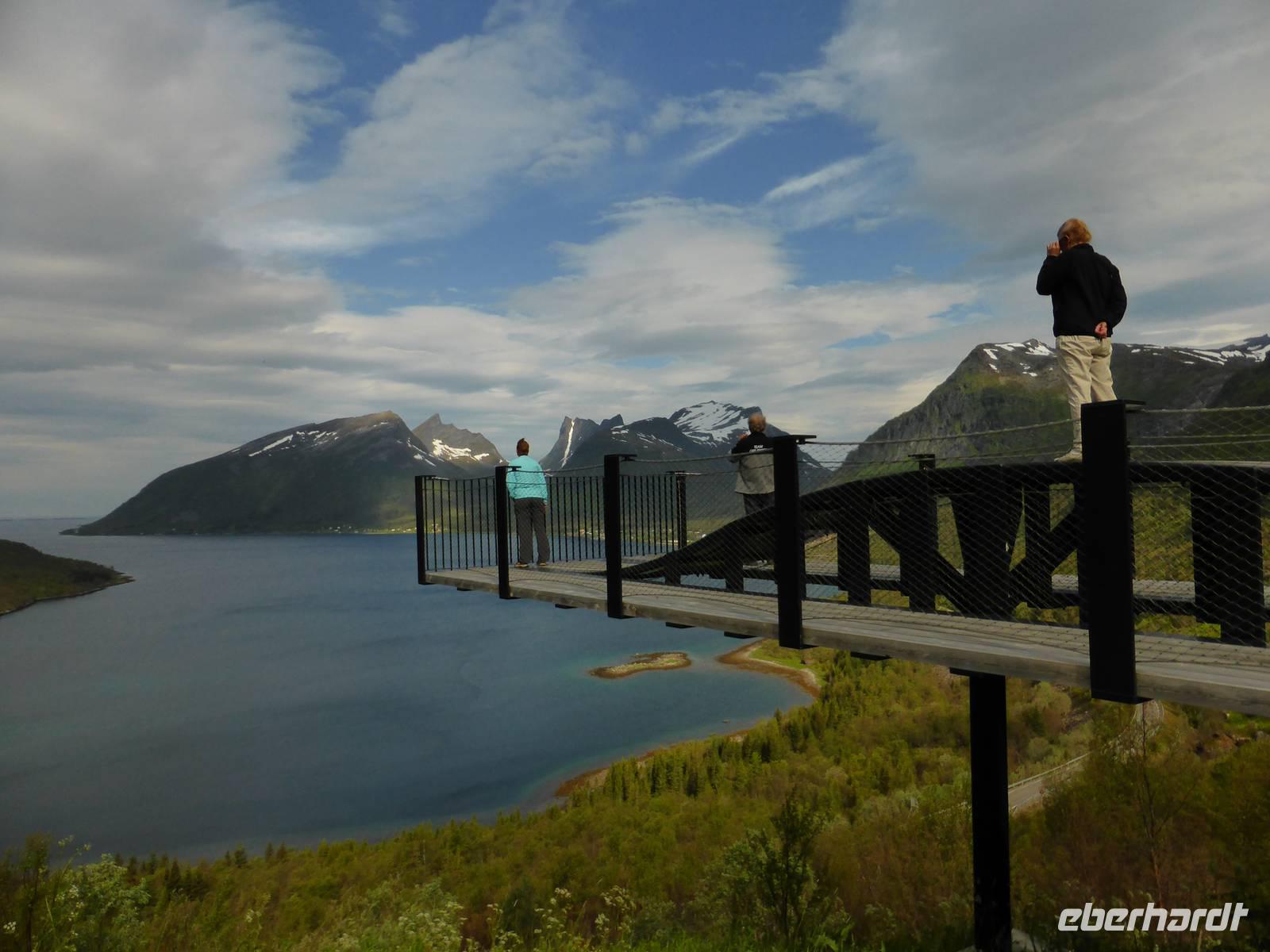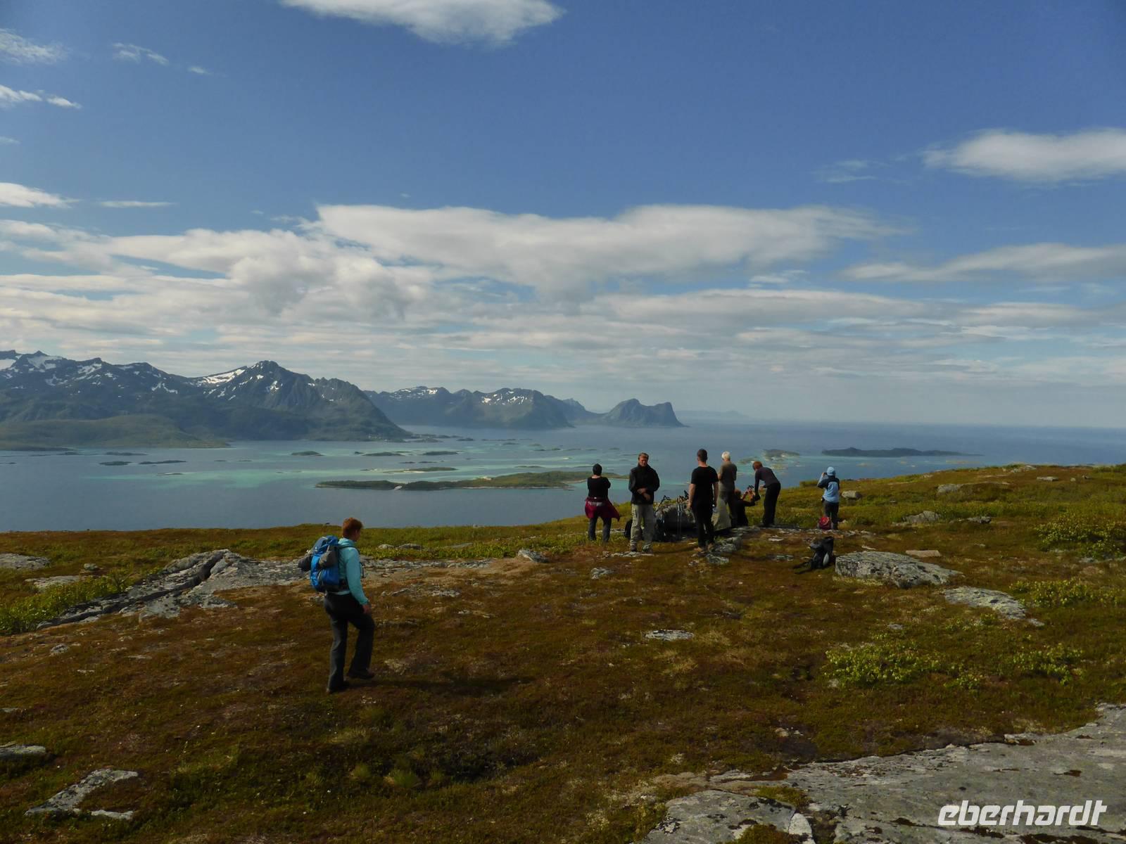 An unserem ersten vollen Tag auf der Insel Senja stand eine Wanderung zum Husfjellet auf dem Programm. Am Morgen war der Himmel noch etwas bedeckt, aber im Verlauf des Tages wurde das Wetter immer besser und die Sonne kam wieder heraus. Wir fuhren mit dem Bus zur modernen Aussichtsplattform „Bergsbotn" mit schönem Blick über den Bergsfjord. Anschließend ging es zur Ortschaft Skaland. Am Supermarkt des Ortes stellten wir unseren Bus ab. Der Aufstieg zum Husfjellet war nicht so anstrengend wie die Anstiege zuvor und je höher wir kamen, desto fantastischer war die Aussicht auf den Bergsfjord mit seinem traumhaften Insel-Archipel, den gewaltigen Bergketten im Hintergrund und die weite Sicht auf das offene Meer. Oben, auf dem Fjell, war trotz der vergangenen trockenen Tage das Moos immer noch sehr nass, so dass wir aufpassen mussten, wohin wir den nächsten Schritt setzten. Unsere Socken und Füße sind glücklicherweise nicht nass geworden. Auf dem Bergsattel angekommen, legten wir unsere Mittagspause ein. Dabei störten uns große Bremsen, die uns auch hin und wieder stachen, aber den grandiosen Blick über die Landschaft und unsere gute Laune konnten sie nicht verderben. Nach dem langsamen Abstieg und der Ankunft am Bus fuhren wir zum Krakeslott (Krähenschloss). Das Krähenschloss ist ein ehemaliges Fischerhaus, welches heute als Domizil für Künstler dient. Der Inhaber lädt jedes Jahr im Juli Künstler aus aller Welt ein und versucht dadurch ein kleines Kunstfestival zu organisieren. Wir wurden bei unserer Ankunft eingeladen, das Schatten-Theater, welches in der oberen Etage aufgeführt wurde, zu besuchen. Der Star des Theaters „Dondolo" war die Sängerin Elsa Hofmann, eine Garnelen-Marionette, welche uns Zuschauer durch eine grandiose Arie begeisterte. Am beeindruckendsten waren allerdings die technische Apparatur, welche hinter der Bühne zu sehen war, und der Einsatz der drei im Hintergrund agierenden Marionetten-Spieler, welche die Schatten-Figuren ins rechte Licht setzten. Nach dem Besuch des kleinen Theaters tranken wir an den Brandungssteinen neben dem „Krähenschloss" noch einen Kaffee und fuhren anschließend zu unserer Wohnanlage zurück. Hier gingen wir wie auch bereits am Vortag nach dem Abendessen noch ein paar Schritte bis zum Lichthaus, um die Mitternachtssonne zu genießen und Delfine zu beobachten.