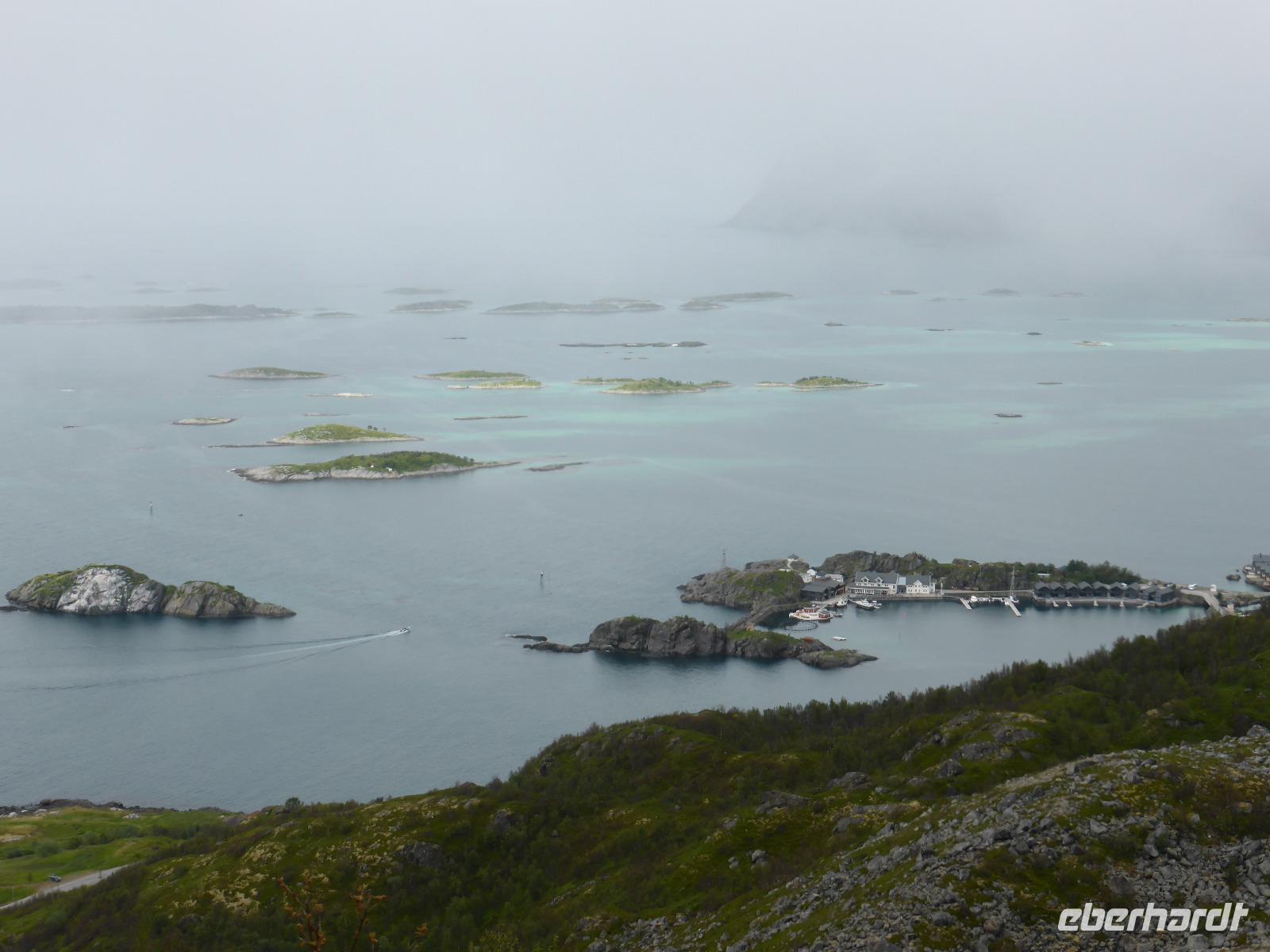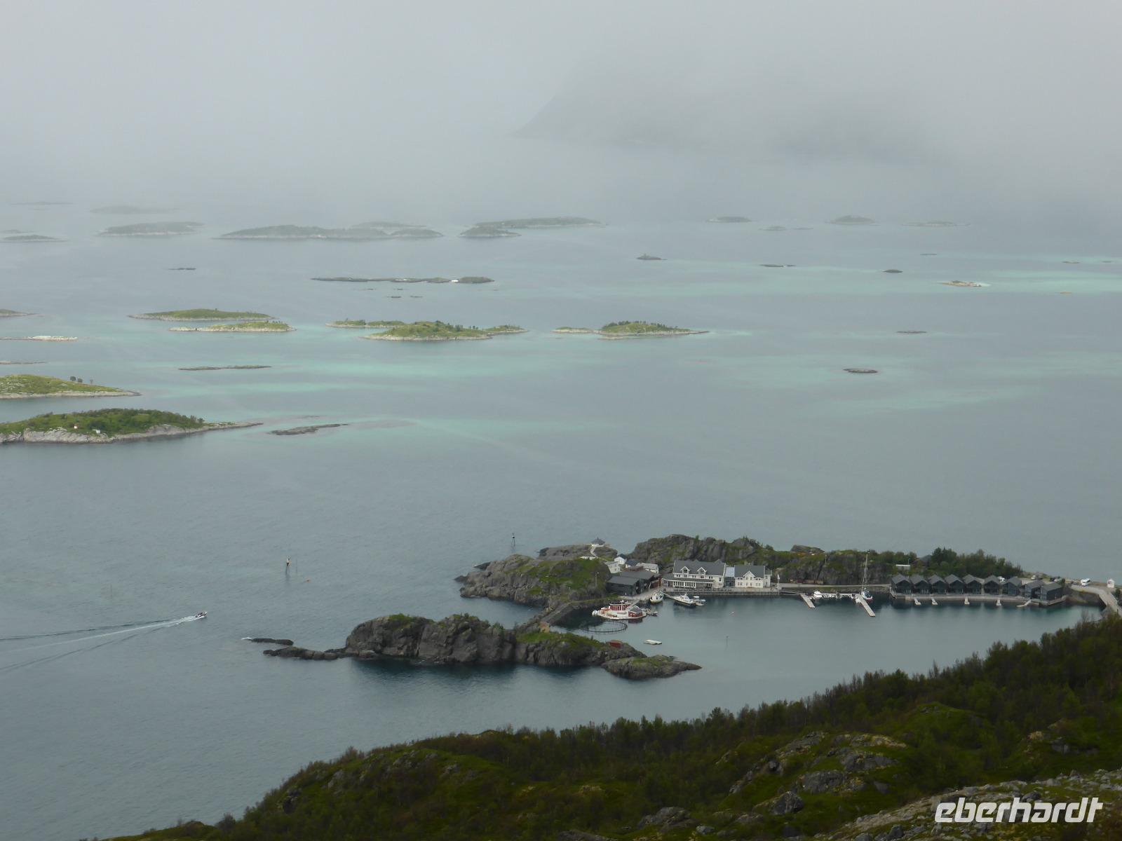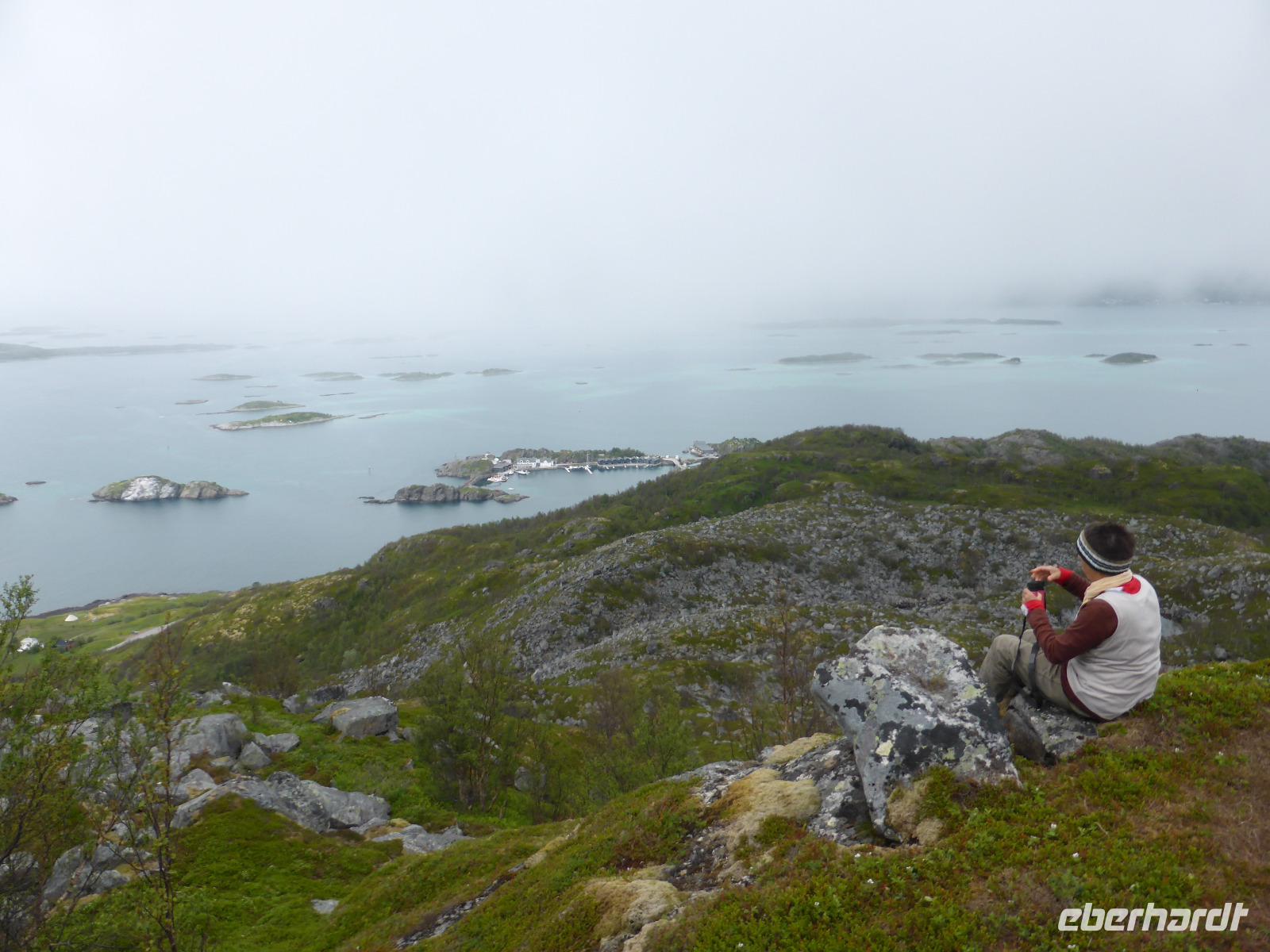 auf den Hausberg von Hamn i Senja. Der Aufstieg lohnte sich, denn der Blick auf den Insel-Archipel, auf unsere Hotelanlage und auf das offene Meer war beeindruckend!