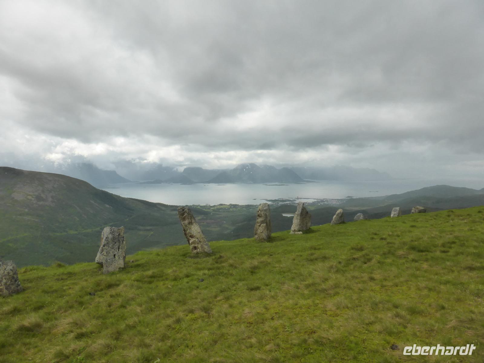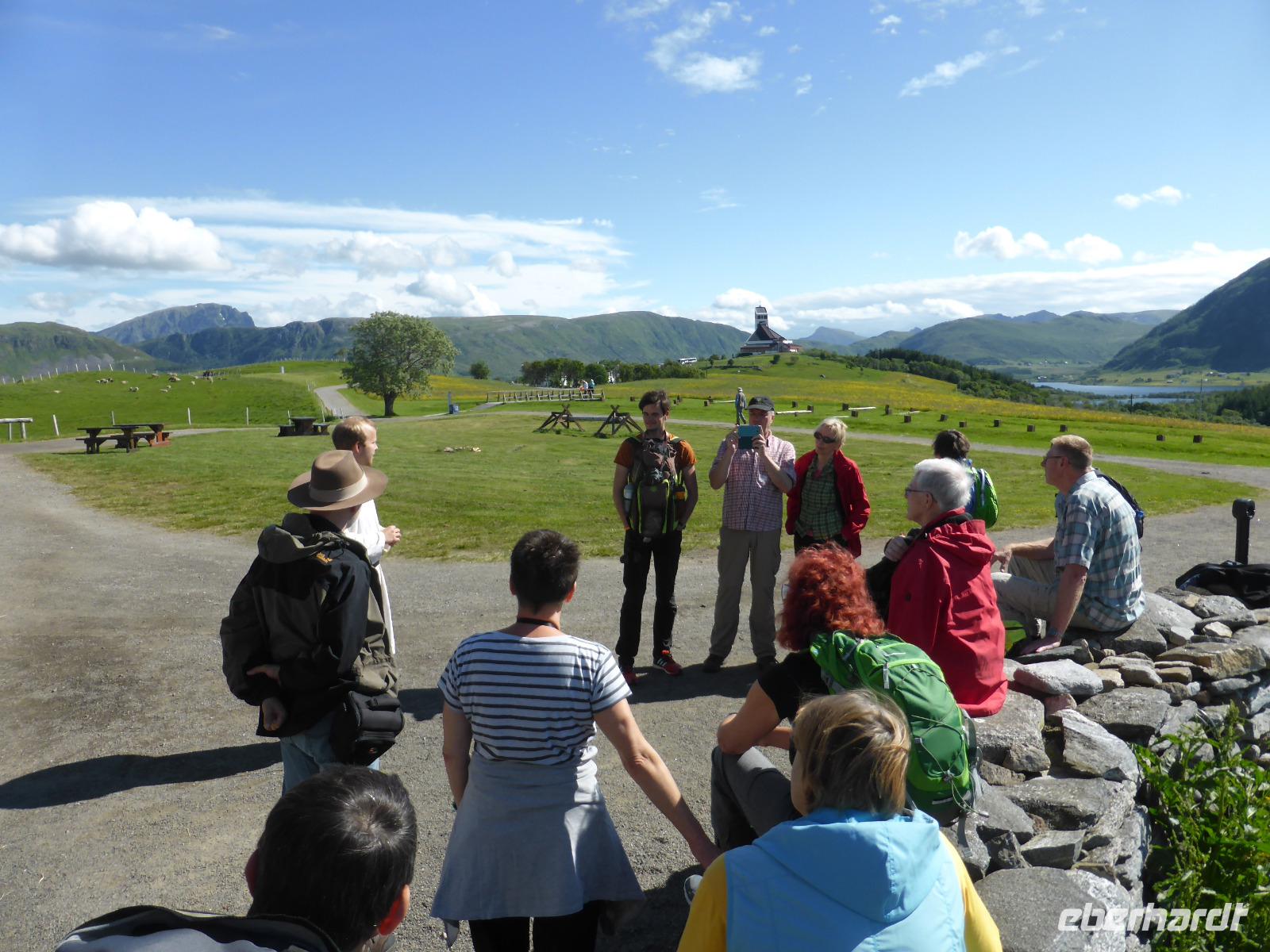 An unserem zweiten Tag auf der Insel Senja stand eine Wanderung zum Husfjellet auf dem Programm. Am Morgen war der Himmel bedeckt, doch es sollte bis zum Ende unserer Wanderung trocken bleiben. Einen ersten Fotostopp legten wir an der Aussichtsplattform „Bergsbotn" ein, mit schönem Blick über den Bergsfjord. Anschließend ging es zur Ortschaft Skaland, wo wir am Supermarkt unseren Bus abstellten. Der Aufstieg zum Husfjellet war nicht ganz so anstrengend wie die Anstiege zuvor und je höher wir kamen, desto fantastischer war die Aussicht auf den Bergsfjord und seinem traumhaften Insel-Archipel, auf die gewaltigen Bergketten im Hintergrund und auf das offene Meer. Oben auf dem Fjell war das Moos immer noch sehr nass, so dass wir aufpassen mussten, wohin wir den nächsten Schritt setzten. Trotzdem blieben nicht alle Füße trocken. Auf dem Bergsattel angekommen, legten wir unsere Mittagspause ein und genossen den grandiosen Blick auf die Landschaft. Nach dem Abstieg und der Ankunft am Bus ging es zum Strand von Broevaer und zum Krakeslott (Krähenschloss), einem ehemaligen Fischerhaus, dessen Inhaber jedes Jahr im Juli Künstler aus aller Welt einlädt und dadurch ein kleines Kunstfestival organisiert. Im ersten Stock sahen wir mechanische Installationen eines jungen belgischen Künstlers. Auf Ständern hat er jeweils ein kleines Windrad angebracht, welches elektrisch gesteuert werden kann und durch die Drehbewegung ein kleines Trommelwerk in Bewegung setzt. Dieses trifft mit den kleinen Schlägeln auf ein Klangholz. Insgesamt hat der Künstler drei afrikanische Musikstücke programmiert. Wir standen begeistert im Raum und bewunderten die Technik und die verschiedenen Klangmelodien. Im Erdgeschoss waren an den Wänden jeweils zwei Bilder zu sehen, die zu einem einzigen dreidimensionalen Bild wurden, sobald wir sie durch eine besondere Brille betrachteten. Auch von dieser Idee waren wir fasziniert. Anschließend fuhren wir mit dem Bus zu unserer Unterkunft zurück.