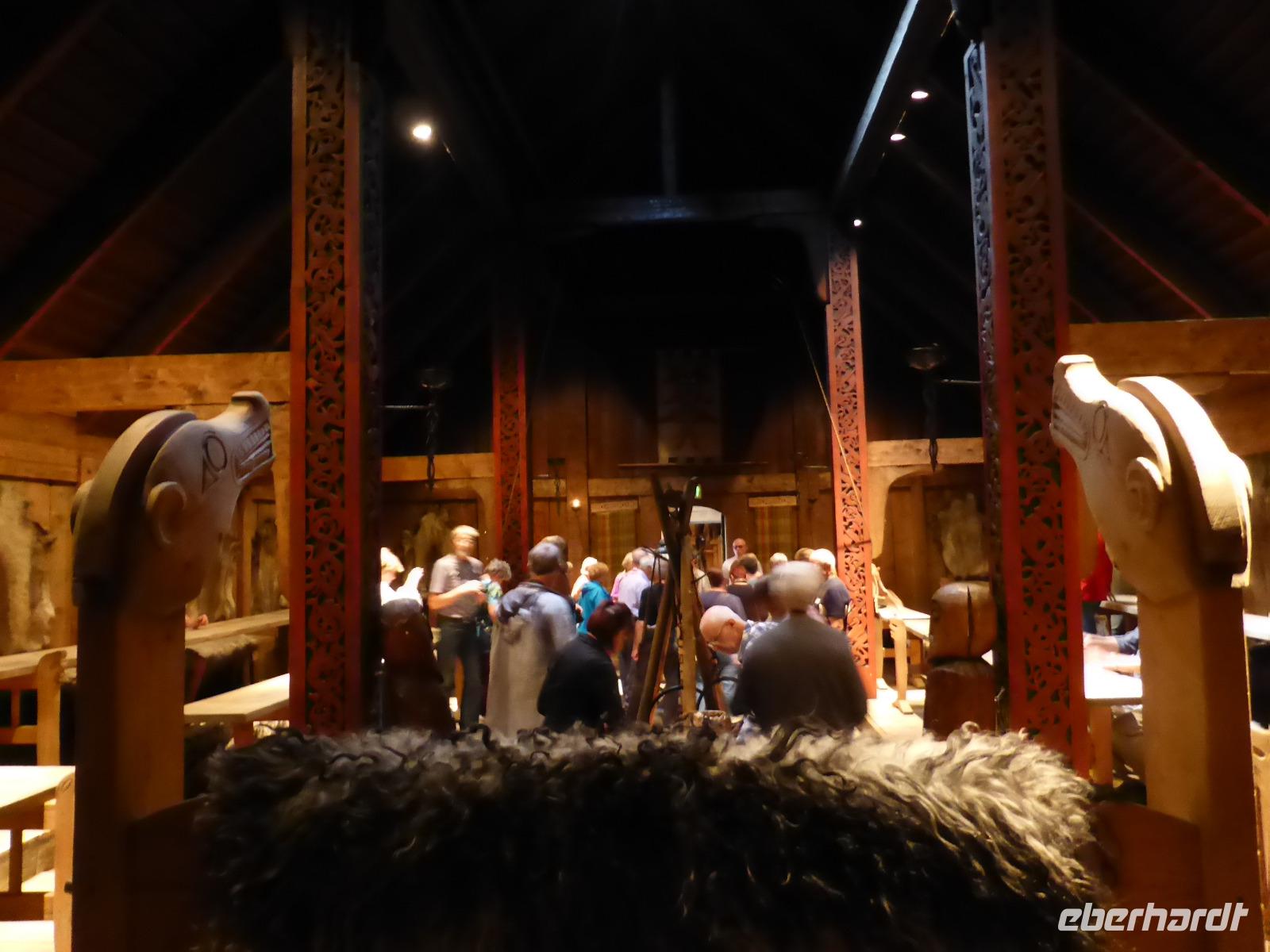 Nach dem Frühstück fuhren wir zum Wikinger-Museum „Lofotr" in Borg, bei dem es sich um einen originalgetreuen Nachbau eines Häuptlingshauses aus der zweiten Hälfte des 1.Jahrtausends unserer Zeitrechnung handelt. Ein Bauer entdeckte beim Pflügen seines Ackers Glasscherben und brachte dadurch die Archäologen auf die richtige Spur. Die Ausmaße des Hauses sind mit 83 x 12 Metern gewaltig! Zuerst besuchten wir das Museum, in dem ausführlich über die Entdeckung und Bedeutung des Fürstenhofes informiert wird, und anschließend sahen wir uns einen Film über die Geschichte der hier lebenden Wikinger an. Danach ging es zum Häuptlings-Haus, in welchem wir weitere interessante Details, z.B. über die nordische Götterwelt, erfuhren und in welchem wir Helme und Waffen anlegen konnten. Nach dieser Besichtigung spazierten wir zum See hinunter, wo sich noch eine Schmiede, ein Bootshaus und ein Wikingerschiff befinden.