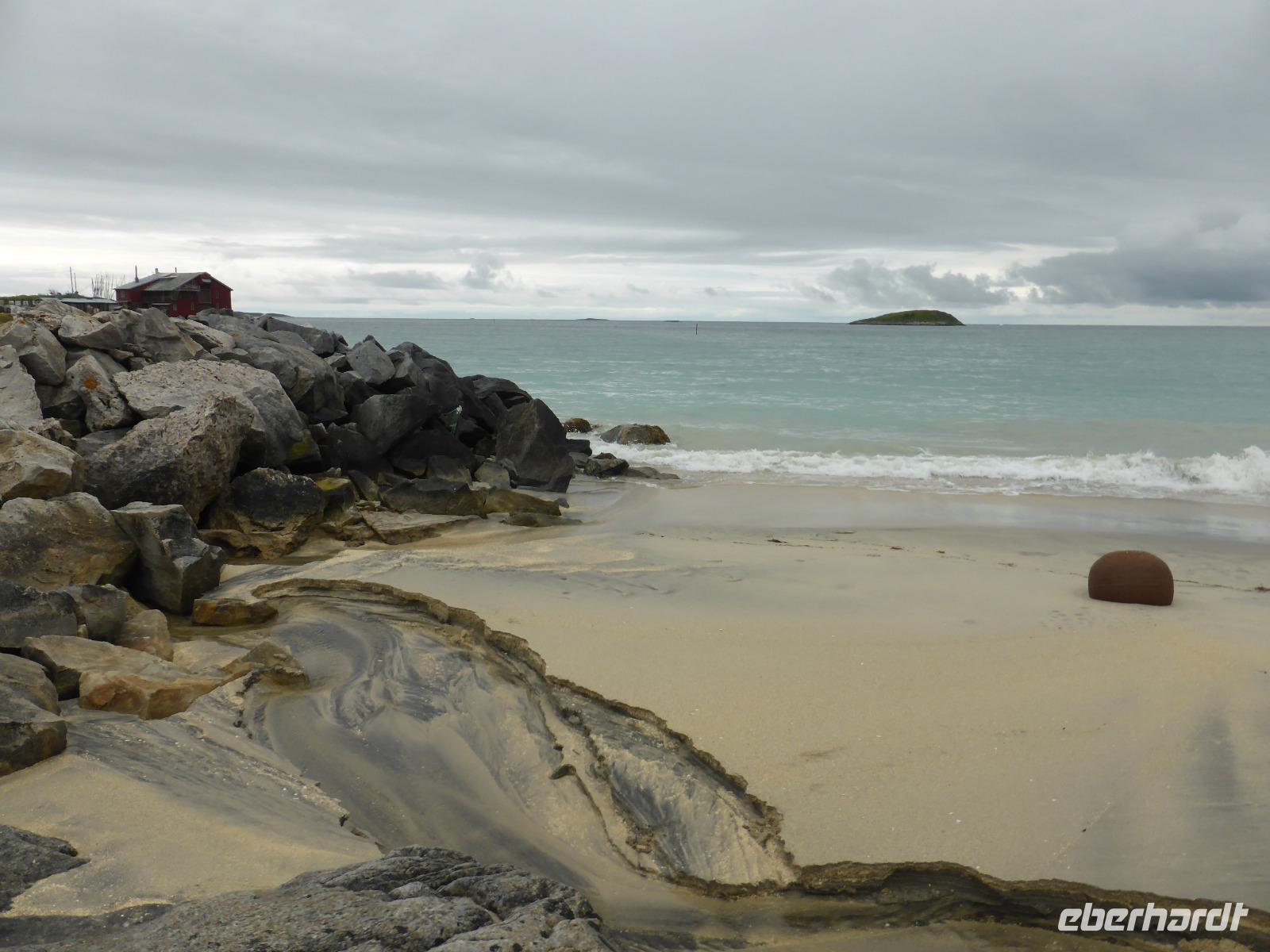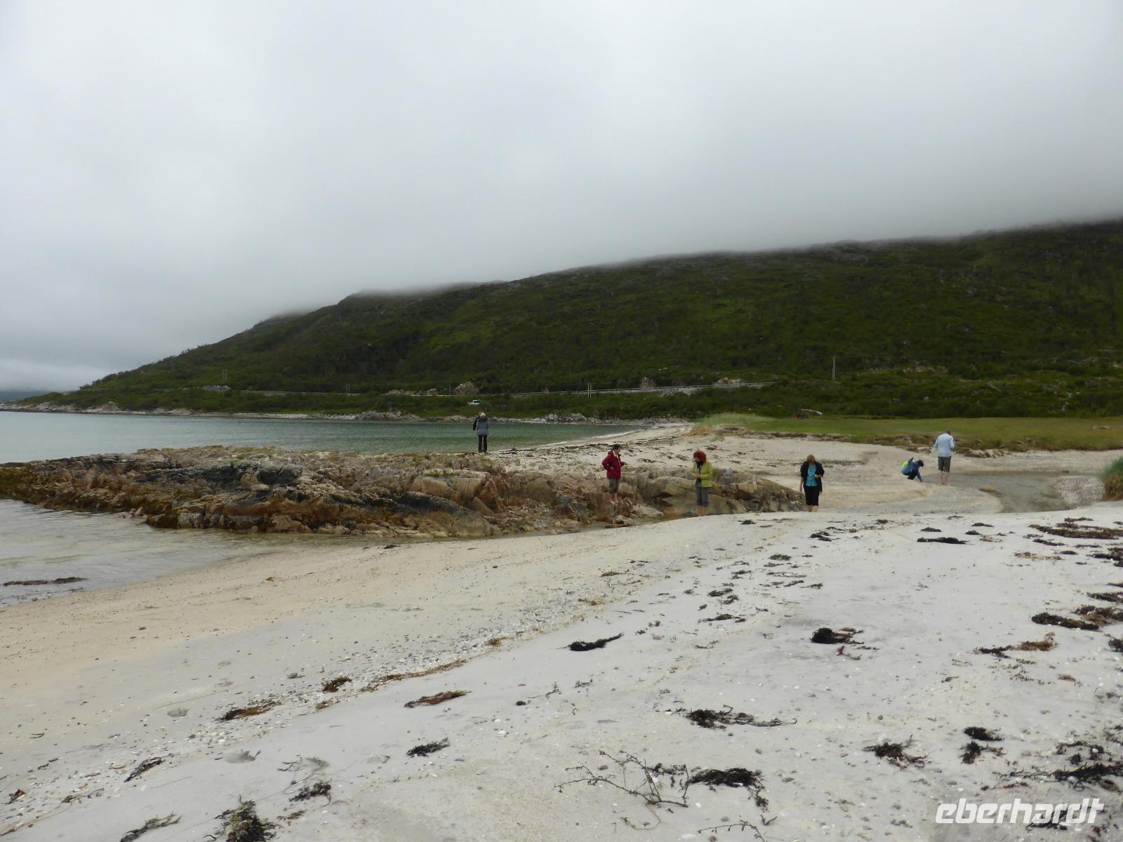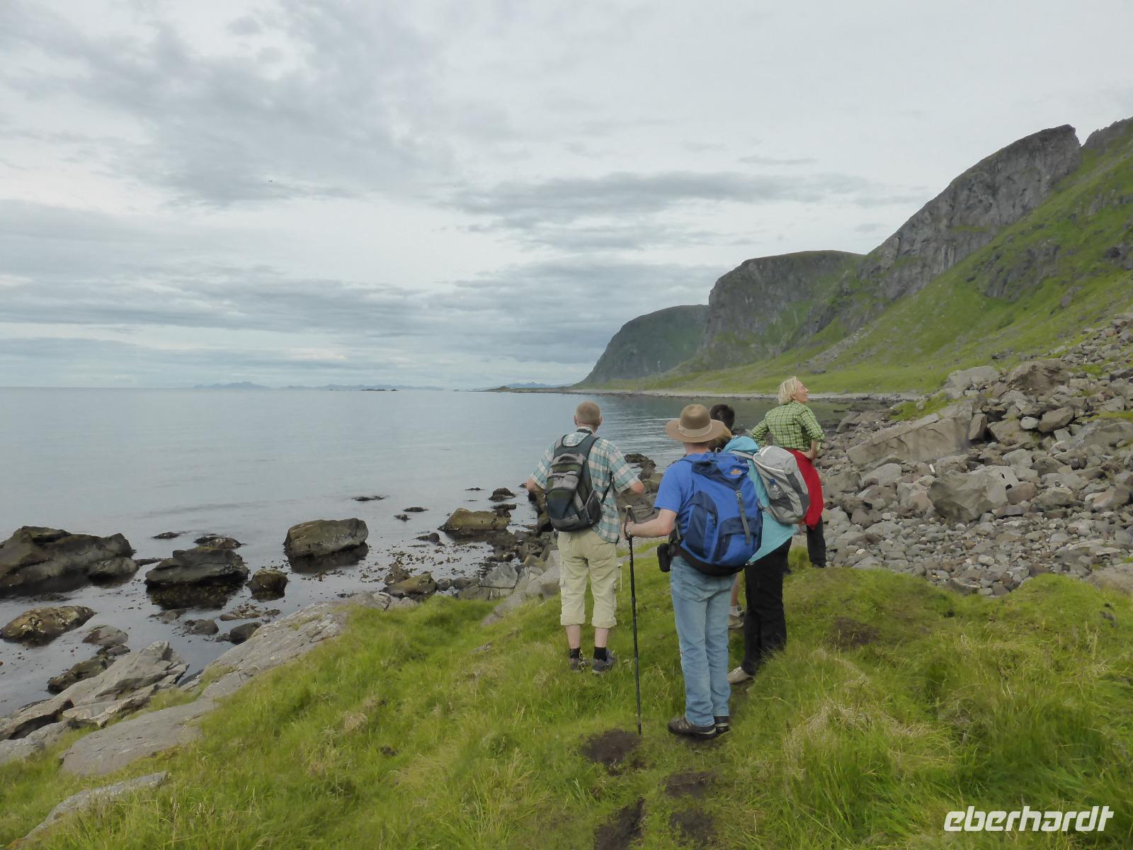 Vom Wikinger-Museum in Borg ging es nach Eggum, einer kleinen Küstensiedlung und Ausgangspunkt unserer Wanderung entlang der Küste. Das Wetter war gut und wir folgten einem Trampelpfad parallel zum Steinstrand. Nur hin und wieder wurde dieser von sandigen Abschnitten unterbrochen. An einer Stelle mit angespültem Strandgut legten wir unsere Picknickpause ein und verewigten uns in einer Art „Etappenbuch", welches wir in einem Briefkasten fanden, welcher an einem ausgeblichenen Baumstamm hing. Am Ende der Wanderung wurde der Weg immer steiniger und nach einem teilweise recht steilen Anstieg kamen wir in Unstad an. Von dort holte uns unser Fahrer Sveinung mit dem Bus wieder ab.