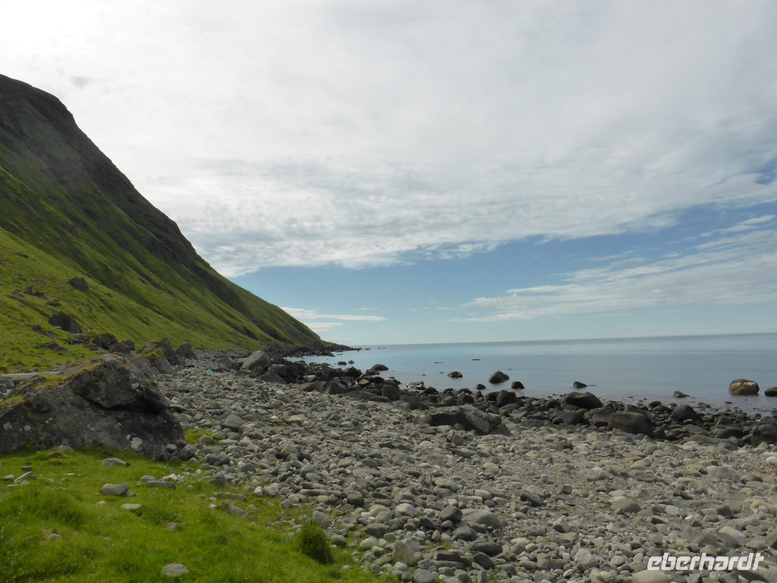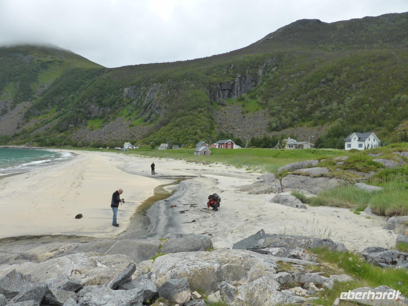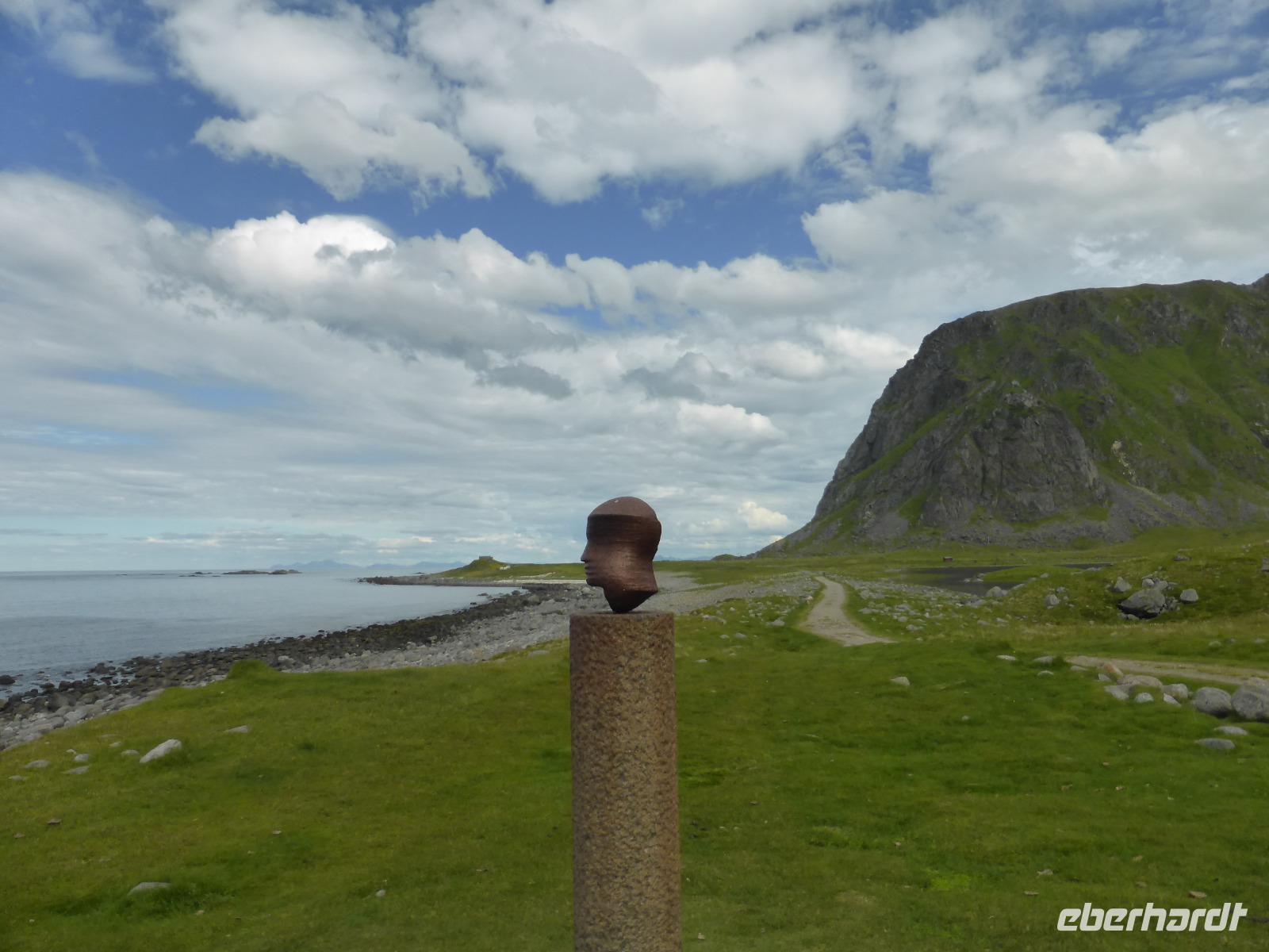 Vom Wikinger-Museum in Borg ging es nach Eggum, einer kleinen Küstensiedlung und Ausgangspunkt unserer Wanderung entlang der Küste. Das Wetter war gut und wir folgten einem Trampelpfad parallel zum Steinstrand. Nur hin und wieder wurde dieser von sandigen Abschnitten unterbrochen. An einer Stelle mit angespültem Strandgut legten wir unsere Picknickpause ein und verewigten uns in einer Art „Etappenbuch", welches wir in einem Briefkasten fanden, welcher an einem ausgeblichenen Baumstamm hing. Am Ende der Wanderung wurde der Weg immer steiniger und nach einem teilweise recht steilen Anstieg kamen wir in Unstad an. Von dort holte uns unser Fahrer Sveinung mit dem Bus wieder ab.