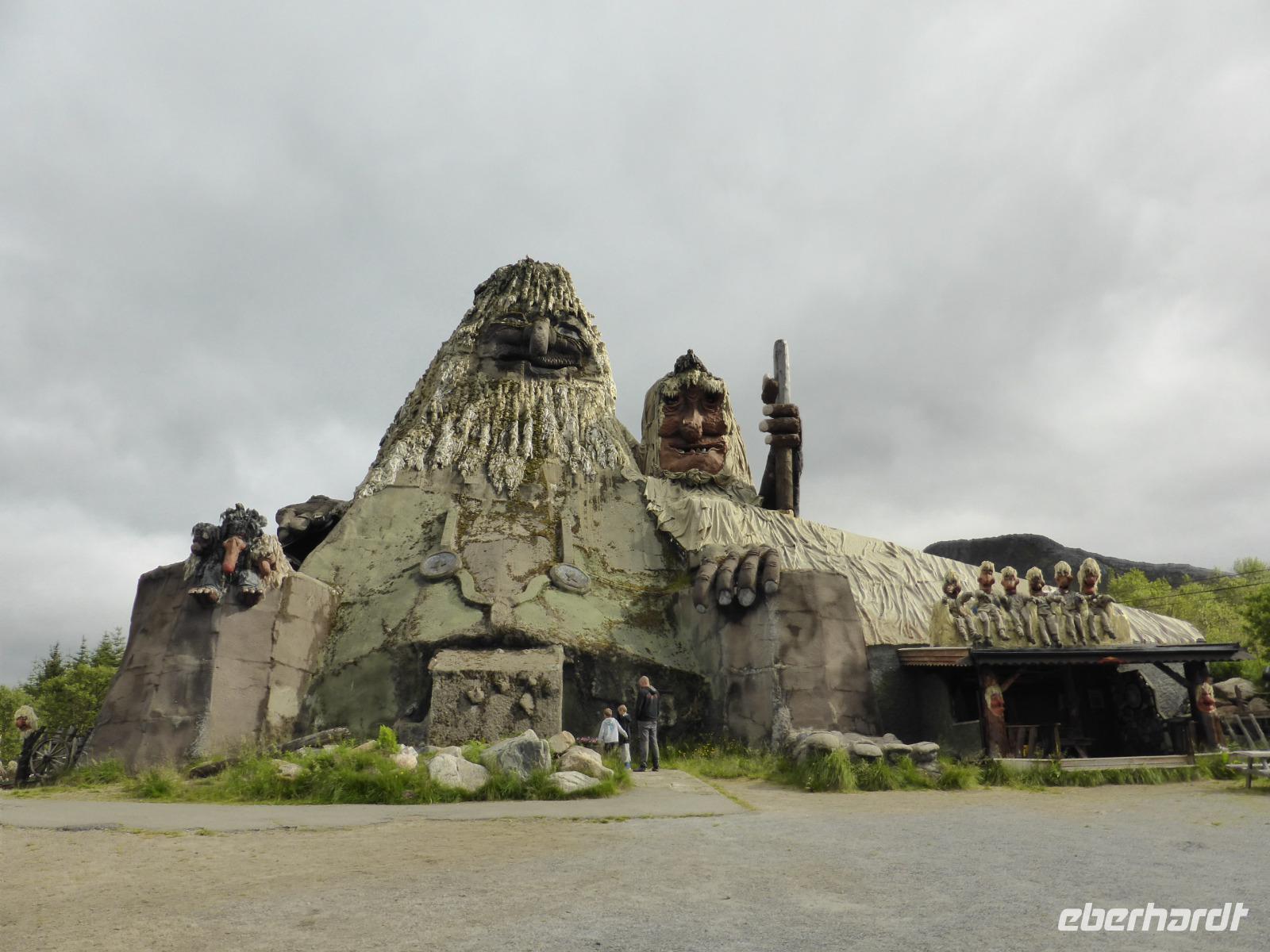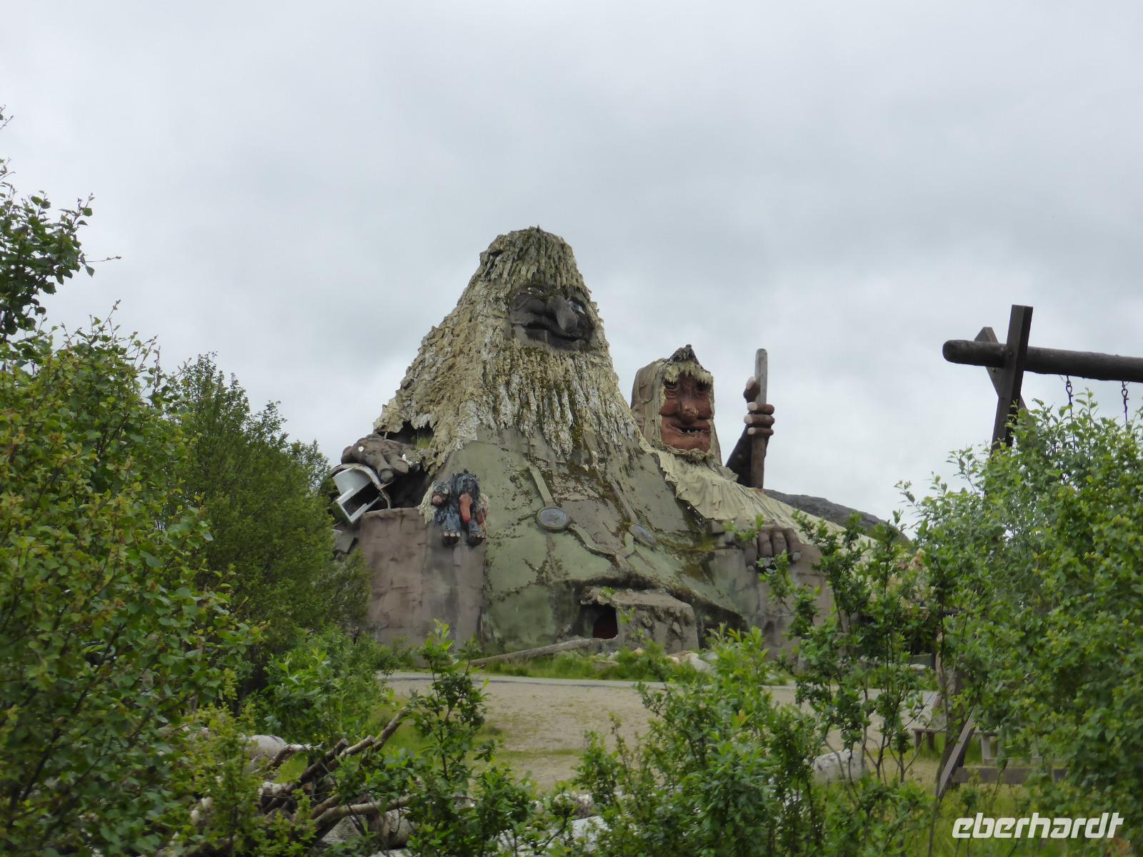 Nach dem Frühstück hieß es Abschied nehmen von Stokmarknes und Weiterfahrt über die Sortlandsund-Brücke zur Insel Hinnoya. Hier fuhren wir die Küste entlang und über die Brücke des Risoysunds. Die anschließende Fahrt entlang der Westküste auf der Insel Andoya war eines unserer schönsten Erlebnisse auf der Reise. Traumhafte Sandstrände und hübsche, gepflegte Ortschaften machten die Fahrt zu etwas ganz Besonderem. Leider meinte es das Wetter nicht gut mit uns und es regnete die ganze Zeit. Die Straße entlang der Westküste Andoyas endet in der ehemaligen Walfänger-Stadt Andenes. Wir hielten am Cafe einer Bäckerei und stärkten uns bei Kaffee und Kuchen. Anschließend war noch etwas Freizeit für individuelle Streifzüge durch den Ort. In Andenes gibt es ein Walzentrum, welches die großen Säuger erforscht und auch Wal-Safaris mit 100%iger Wal-Sicht-Garantie organisiert. Nach der Freizeit ging es zur Ablegestelle der Fähre, die uns in einer knapp zweistündigen Fahrt über den Andfjord zur Ortschaft Gryllefjord brachte. Obwohl uns die See ruhig erschien, schaukelte das Schiff teilweise recht ordentlich. Dafür hatte der Regen aufgehört, so dass wir an Deck gehen konnten. Nach unserer Ankunft in Gryllefjord ging es zum Senja-Troll, der seit 1993 mit einer Höhe von knapp 18 Metern im Guiness-Buch der Rekorde steht und auf zwei Etagen begehbar ist.