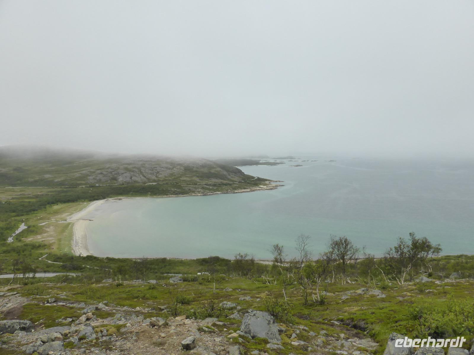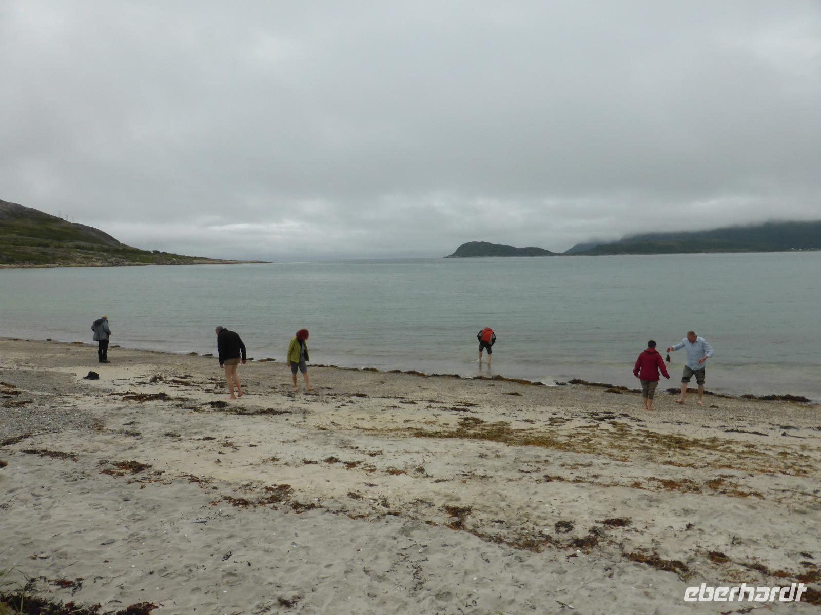 Nach der Ankunft begann unsere Wanderung in Richtung Lakstinden. Das erste Stück des Weges ging es bergauf durch ein kleines offenes Birkenwäldchen und anschließend führte der Weg über eine steinige Gebirgs- und Moorlandschaft. Hinter einem Bergsee legten wir unsere Picknick-Pause ein und kehrten von dort wieder zu unserem Ausgangspunkt der Wanderung zurück. Ein Aufstieg auf den Lakstinden war an diesem Tag nicht möglich, da die Sicht mit 150 Metern einfach viel zu schlecht war und die Bergkette sich fast vollständig hinter den Wolken befand. Am Ausgangspunkt wieder angekommen, nutzten wir die gesparte Zeit für einen ausgiebigen Bummel am Strand von Sandvika. Obwohl das Wasser kalt war, gingen einige von uns bis zu den Waden hinein. Die größte Faszination übte allerdings das Sammeln von Muscheln und Steinen am langen Sandstrand auf uns aus. Anschließend fuhren mit dem Bus zu unserem Hotel „Clarion Edge" in Tromsö. Zum Abendessen verabschiedeten wir unseren norwegischen Fahrer Atle, der uns allen ans Herz gewachsen war, und danach trafen wir uns noch einmal zu einem gemeinsamen Stadtspaziergang.