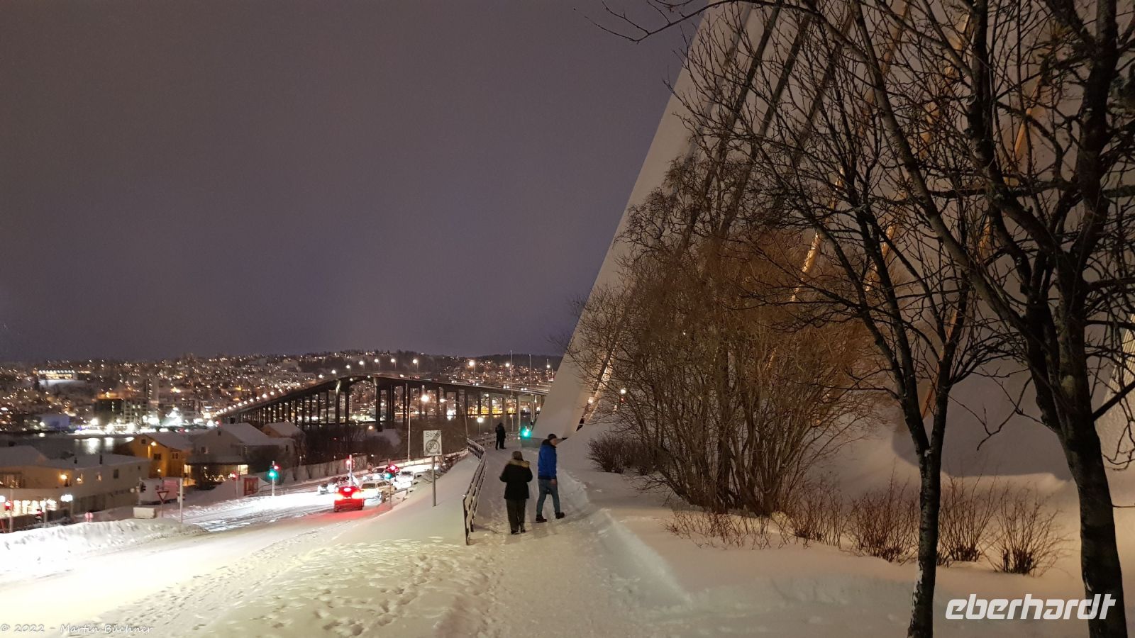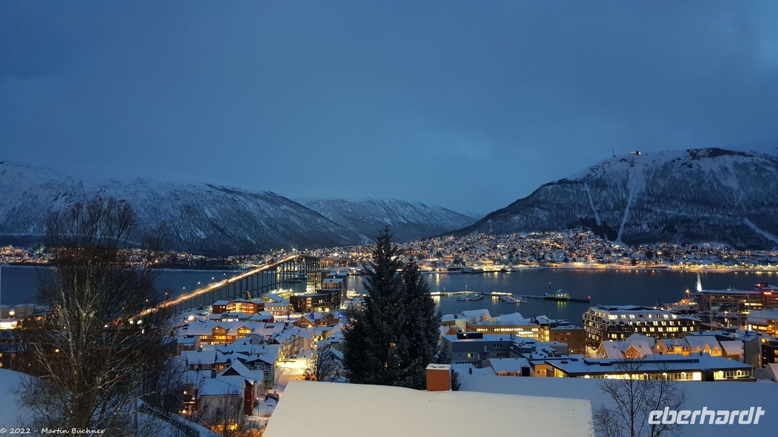 Nach der Ankunft beginnen wir mit einer Stadtrundfahrt. Troms-ø bedeutet die Troms-Insel, sie ist durch optisch eindrucksvolle Brücken sowohl mit dem Festland wie auch mit weiteren Inseln verbunden. Ergänzt werden die Brücken durch eine Reihe von unterseeischen Tunneln.