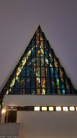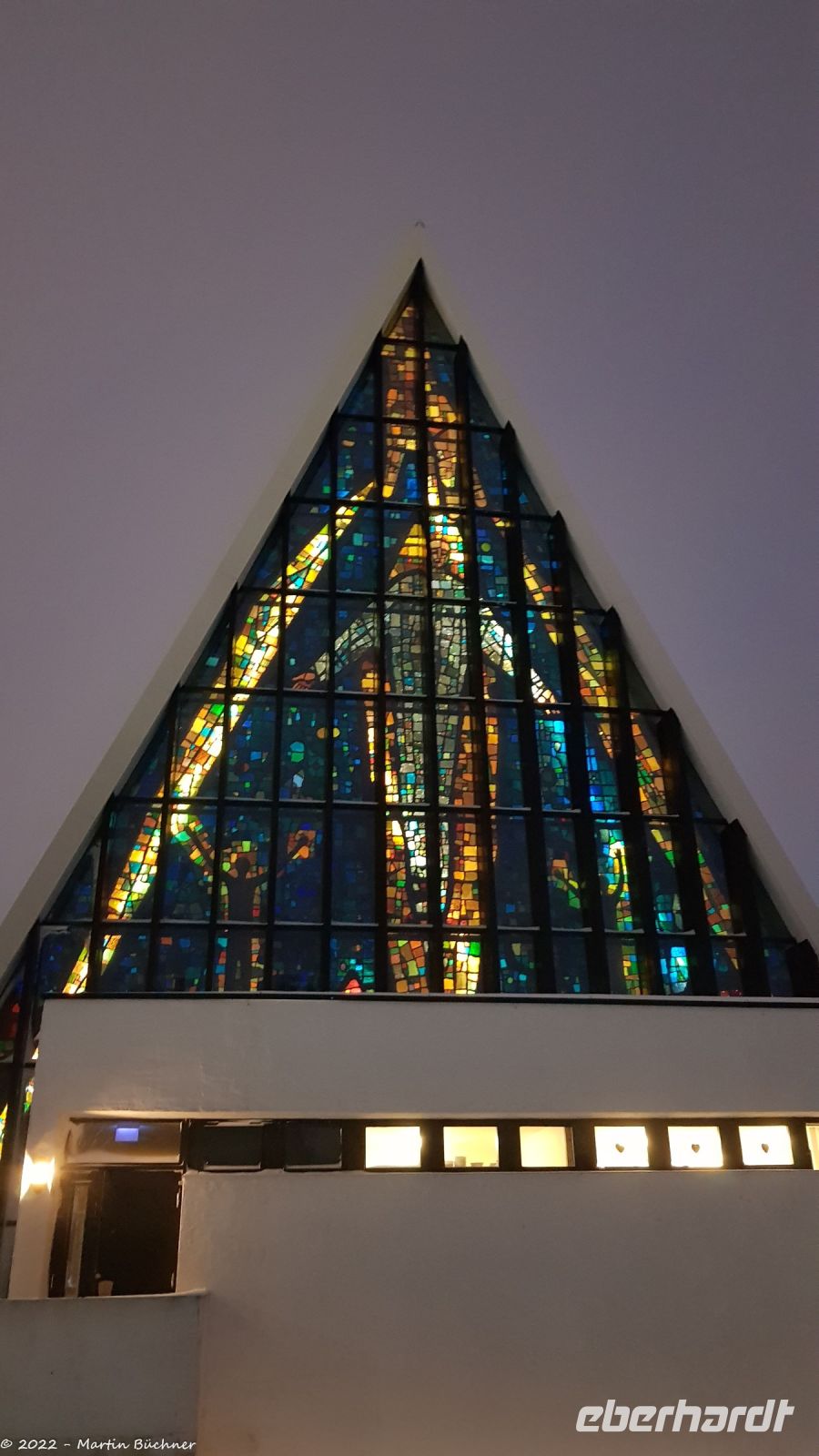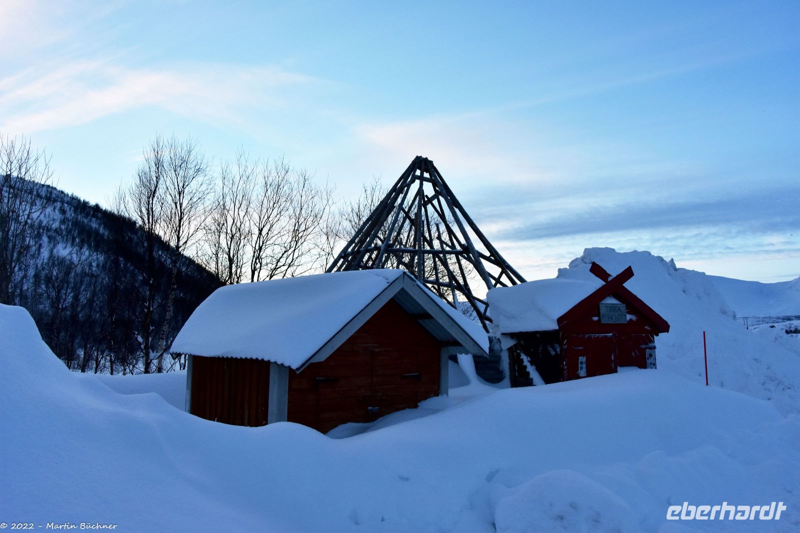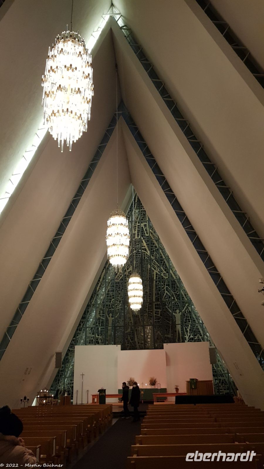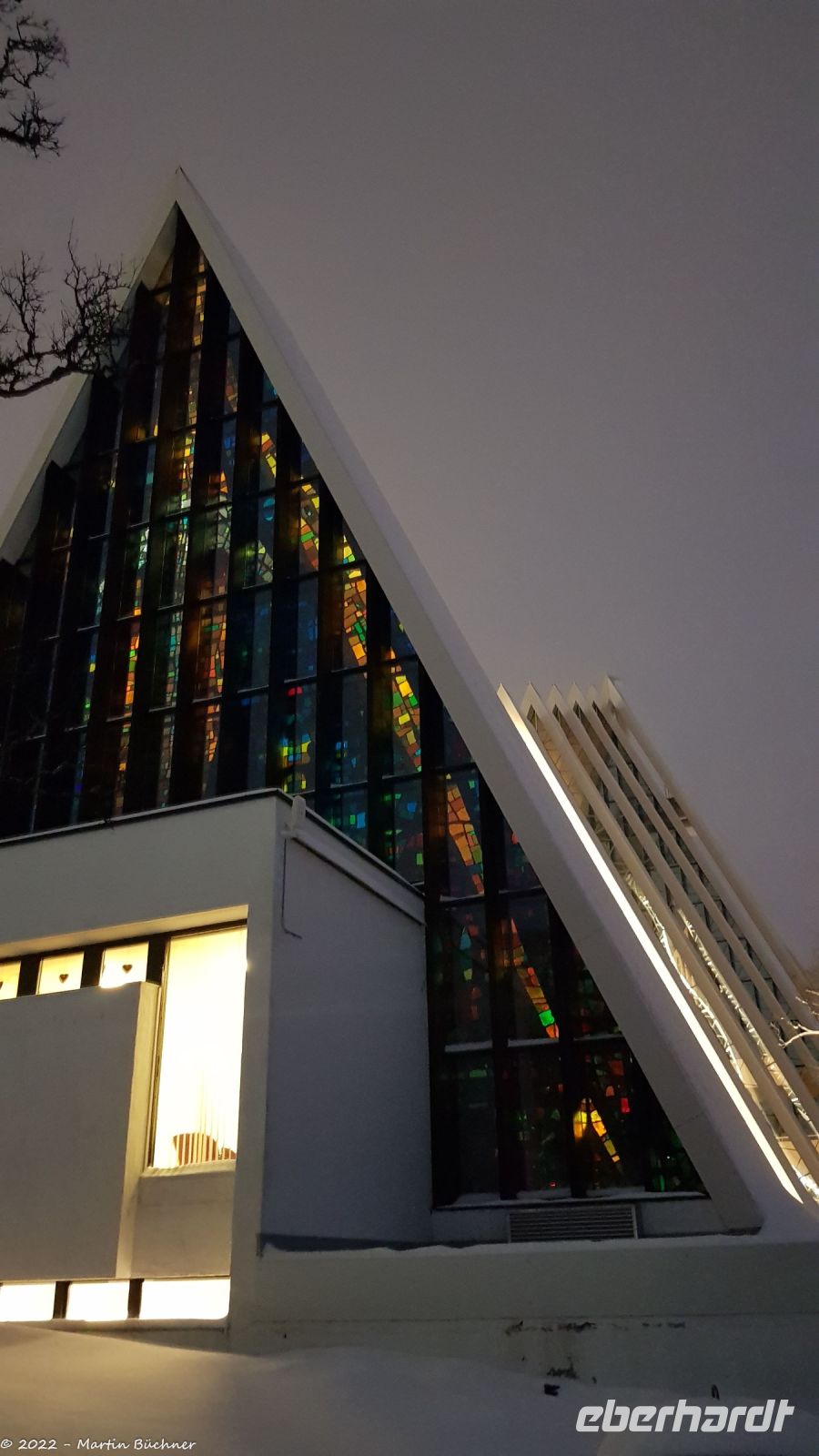 In die Nachkriegszeit fiel die Entscheidung für den Bau der „Tromsdalen kirke“. Heute viel besser bekannt als „Eismeerkathedrale“, fertiggestellt 1965. Sie erinnert an Eisberge oder sich an Land auftürmende Eisschollen. Imposant ist ihr Buntglasfenster, hervorragend die Akustik. Etwas kurios, der Keller der Kirche diente im Kalten Krieg gleichzeitig als Luftschutzbunker – die Spuren sind im zugänglichen Keller auch heute kaum übersehbar.