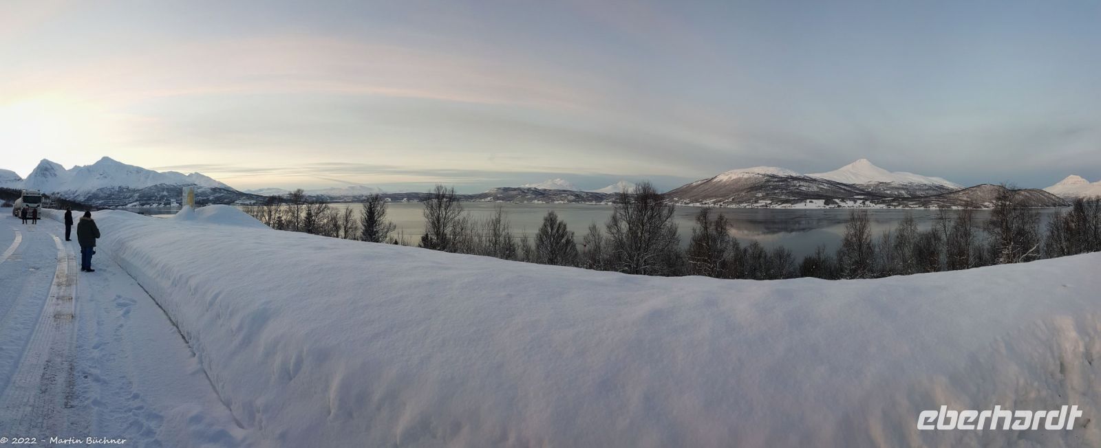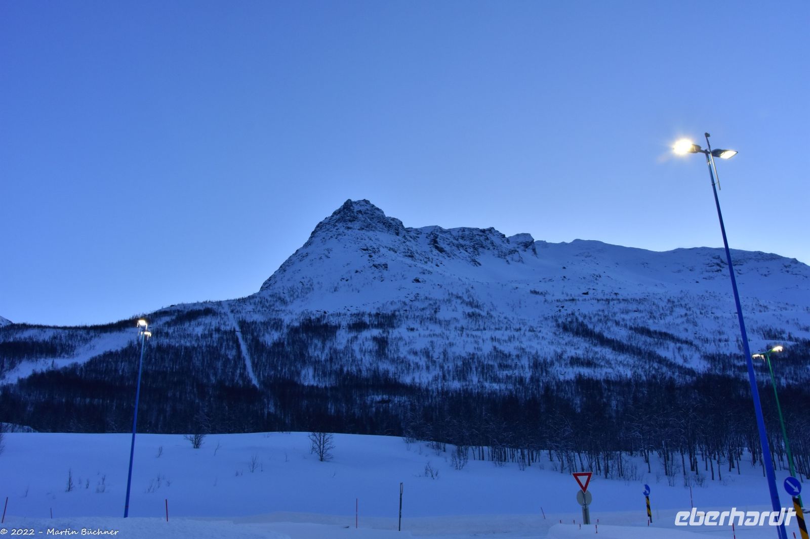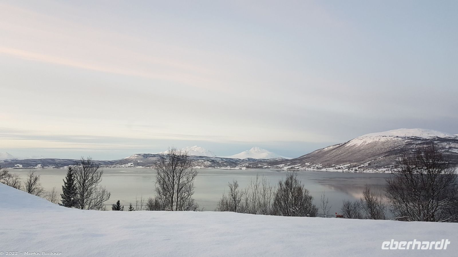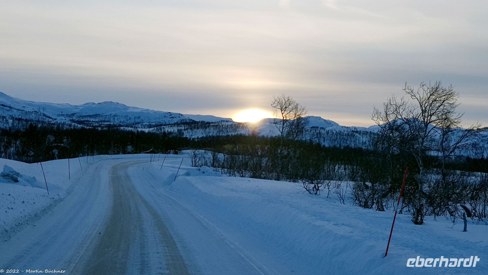 Perfektes arktisches Winterwetter! Atemberaubendes Licht genau an unserem Reisetag nach Kiruna. Wir folgen der E8 nach Süden, zunächst durch das Norddalen entlang des Balsfjords. Hier liegt der ehemalige unterirdische NATO-U-Boot Bunker "Olavsvern". In Nordkjosbotn wechseln wir auf die E6 in Richtung Süden.
