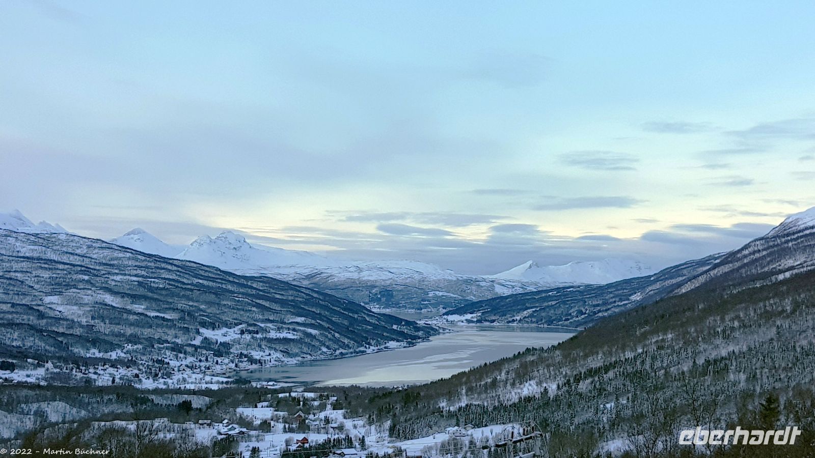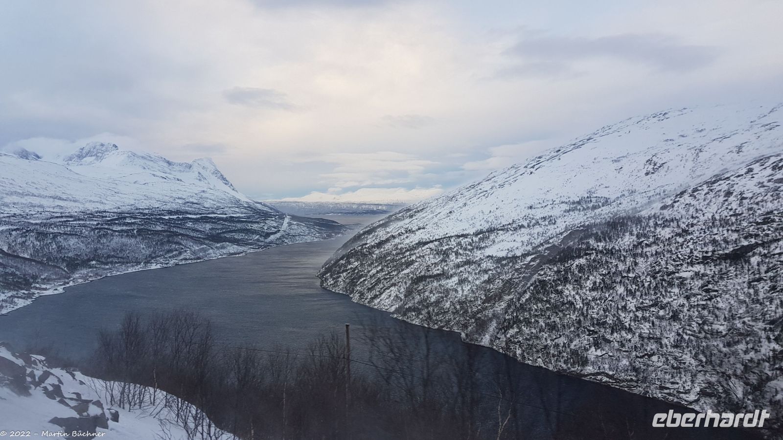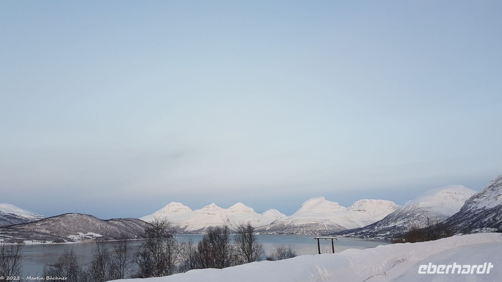 Perfektes arktisches Winterwetter! Atemberaubendes Licht genau an unserem Reisetag nach Kiruna. Wir folgen der E8 nach Süden, zunächst durch das Norddalen entlang des Balsfjords. Hier liegt der ehemalige unterirdische NATO-U-Boot Bunker "Olavsvern". In Nordkjosbotn wechseln wir auf die E6 in Richtung Süden.