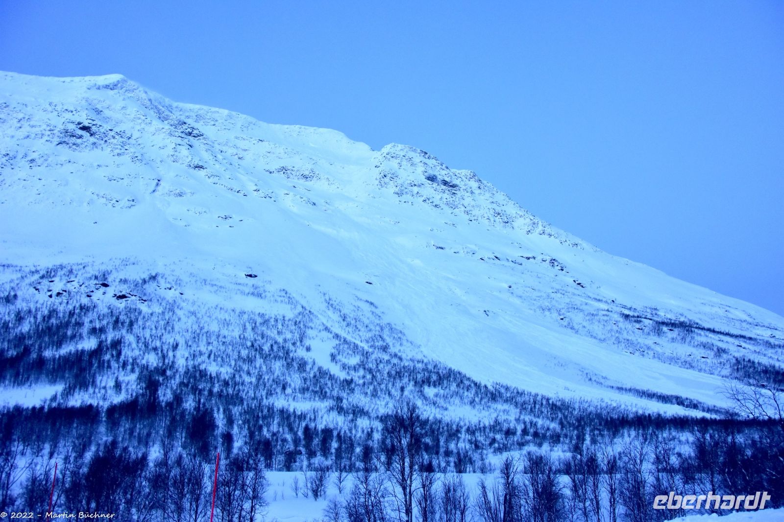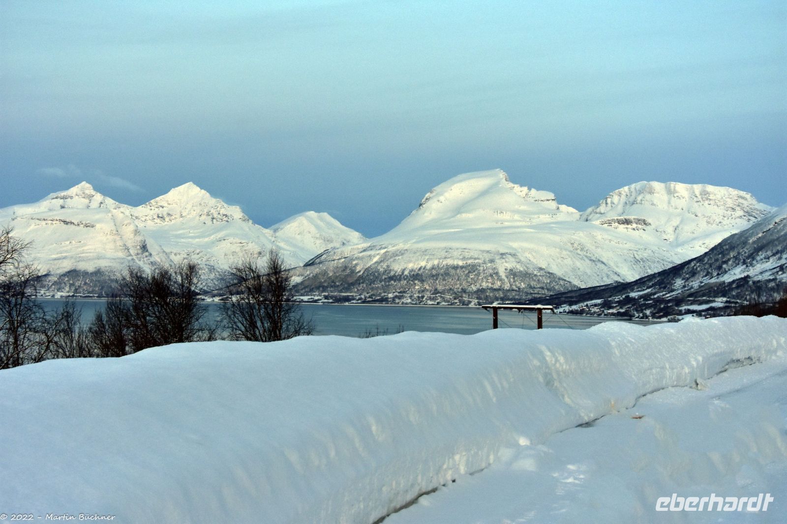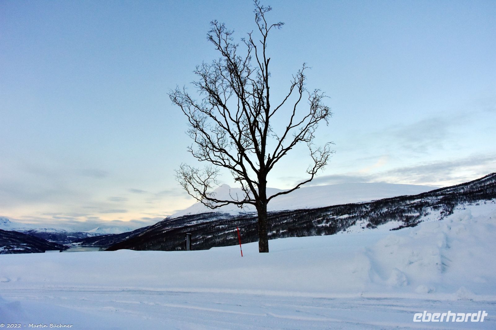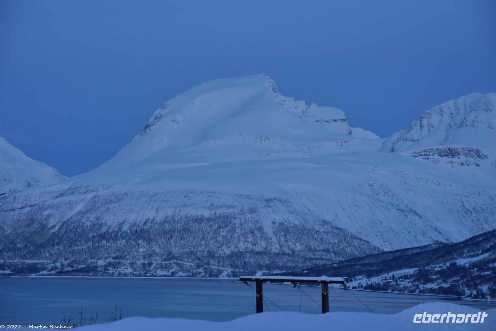Perfektes arktisches Winterwetter! Atemberaubendes Licht genau an unserem Reisetag nach Kiruna. Wir folgen der E8 nach Süden, zunächst durch das Norddalen entlang des Balsfjords. Hier liegt der ehemalige unterirdische NATO-U-Boot Bunker "Olavsvern". In Nordkjosbotn wechseln wir auf die E6 in Richtung Süden.