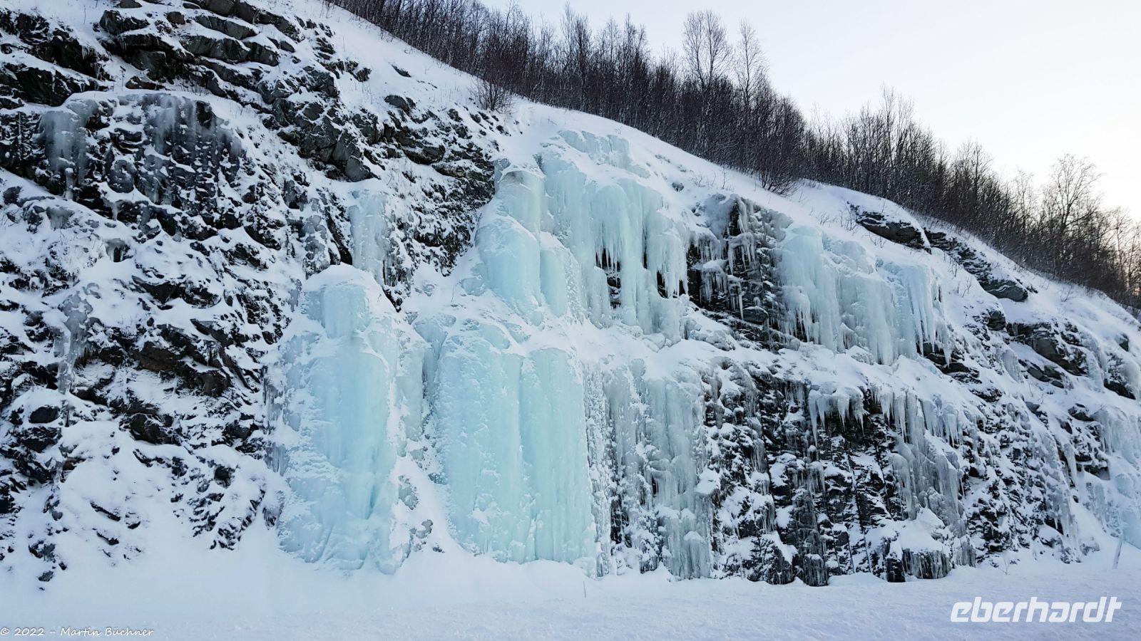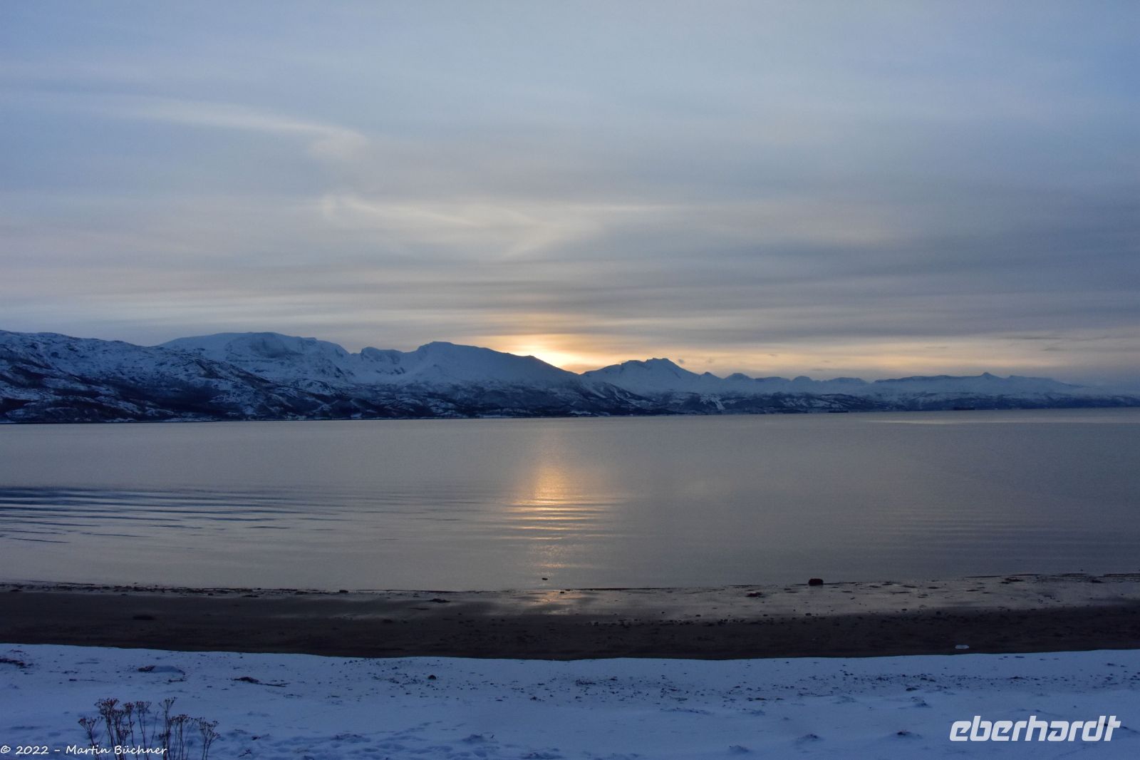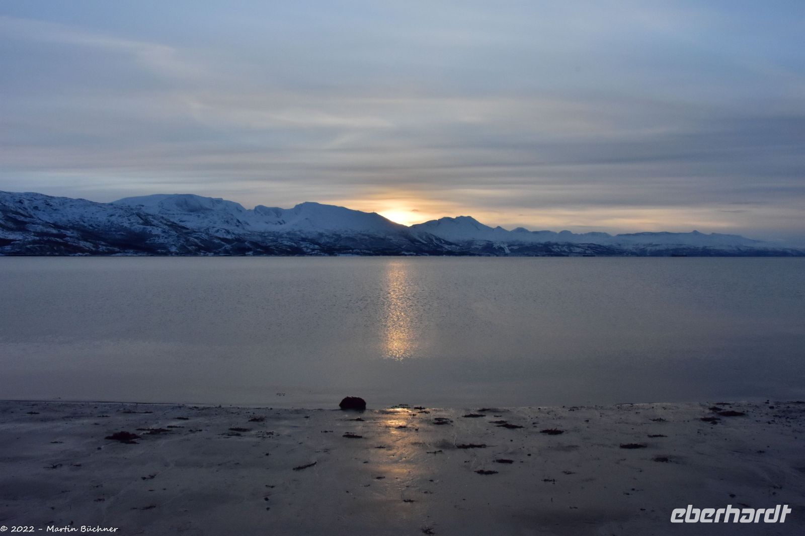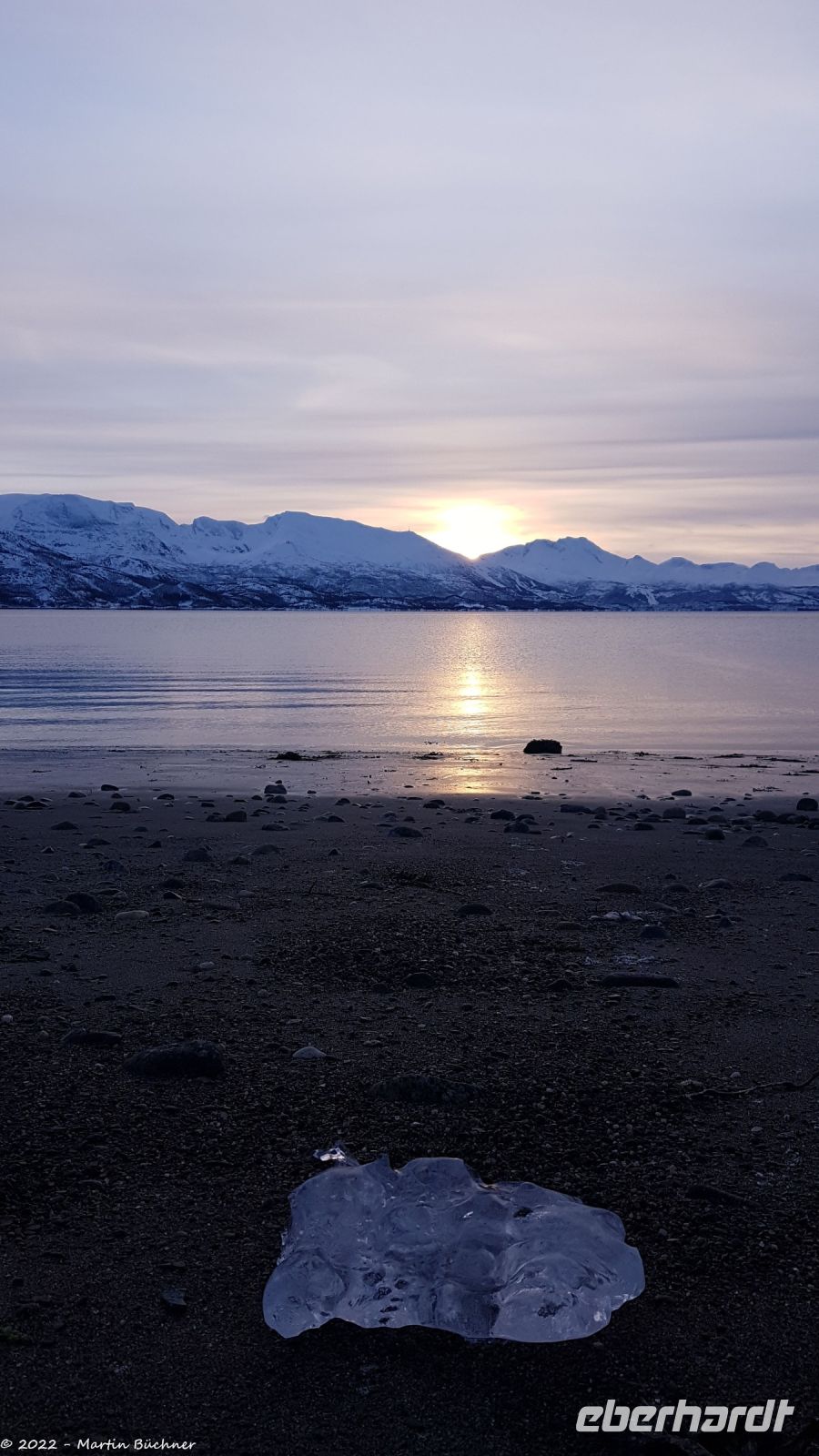 Am Ofotenfjord erleben wir großartige arktische Momente – die Tage mit ihrem Licht sind kurz im Nordland um diese Jahreszeit, denn die Polarnacht ist erst wenige Tage vorüber. So beginnt kurz nach Mittag die Dämmerung. Am Strand hat das Meer Klareis angespült. Eine wunderbare arktische Szenerie mit atemberaubenden Lichtspiel.
