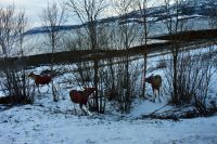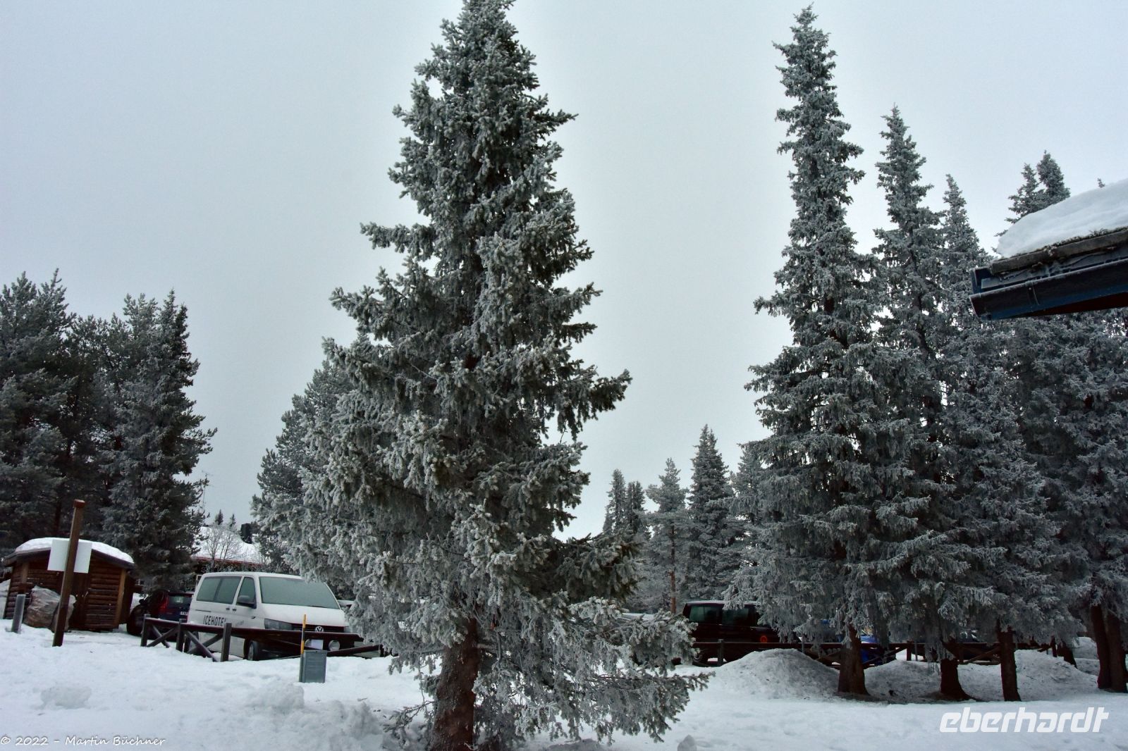 Hier beginnt unsere Schneeschuhwanderung. Temperaturen um die -20 °C schufen hervorragende Bedingungen für eine solche Aktivität. Hart überfrorener Schnee bilden einen perfekten Untergrund für Schneeschuhe.