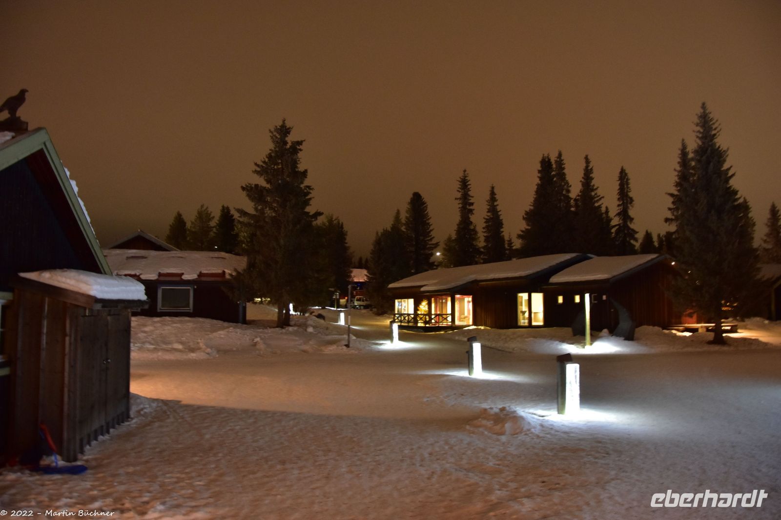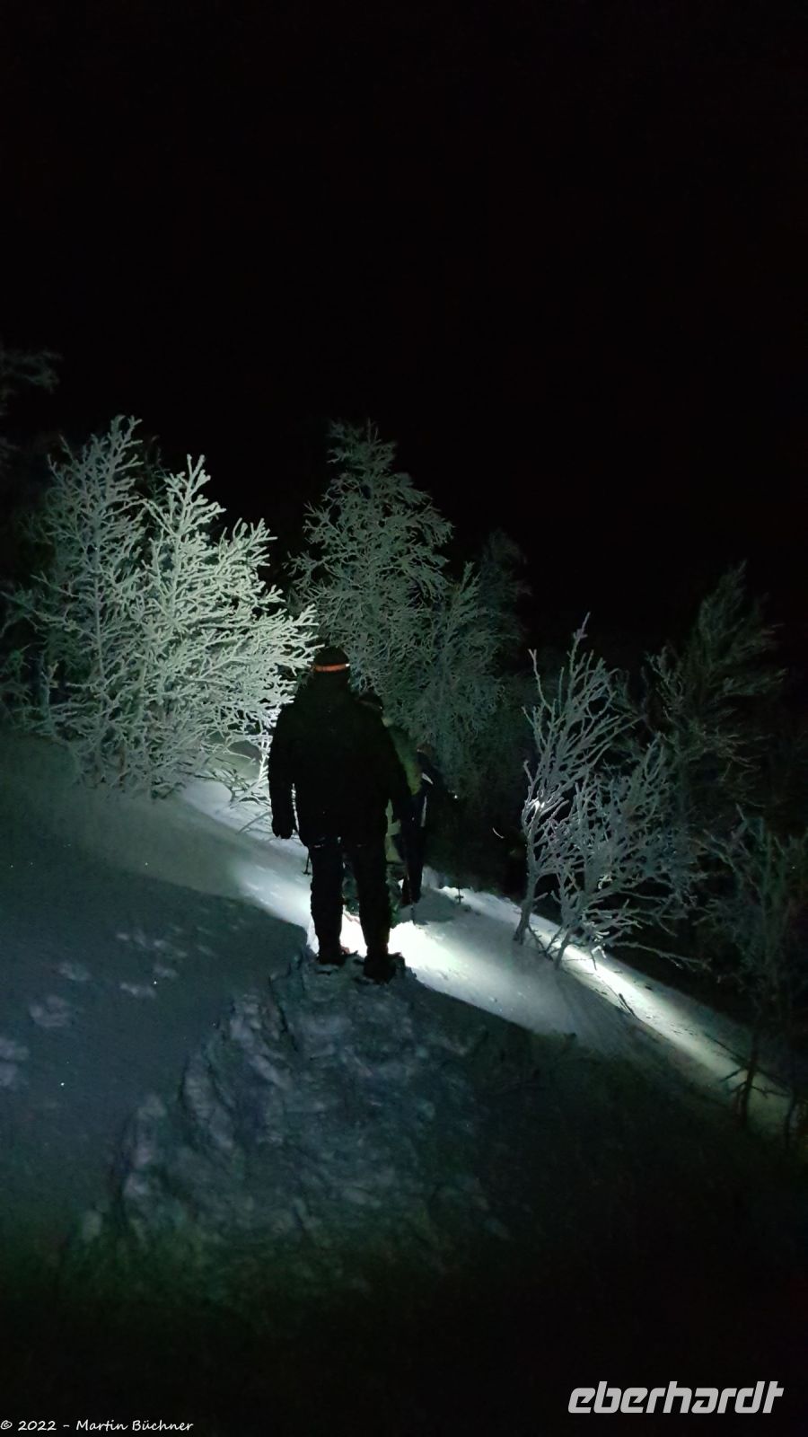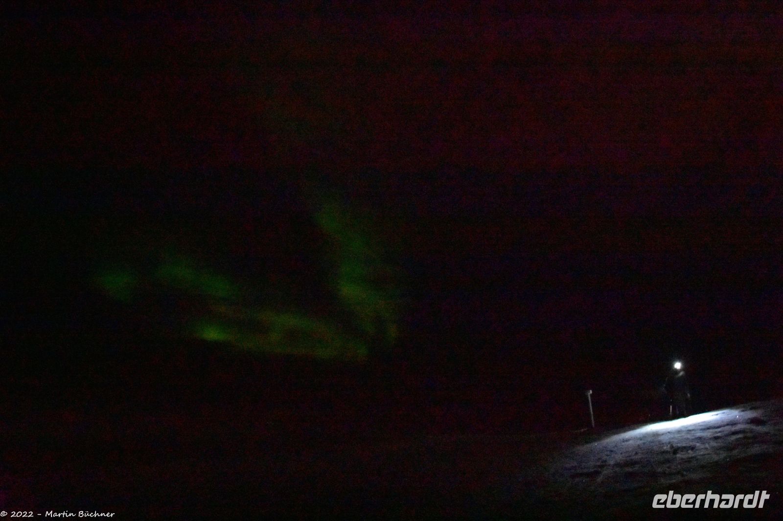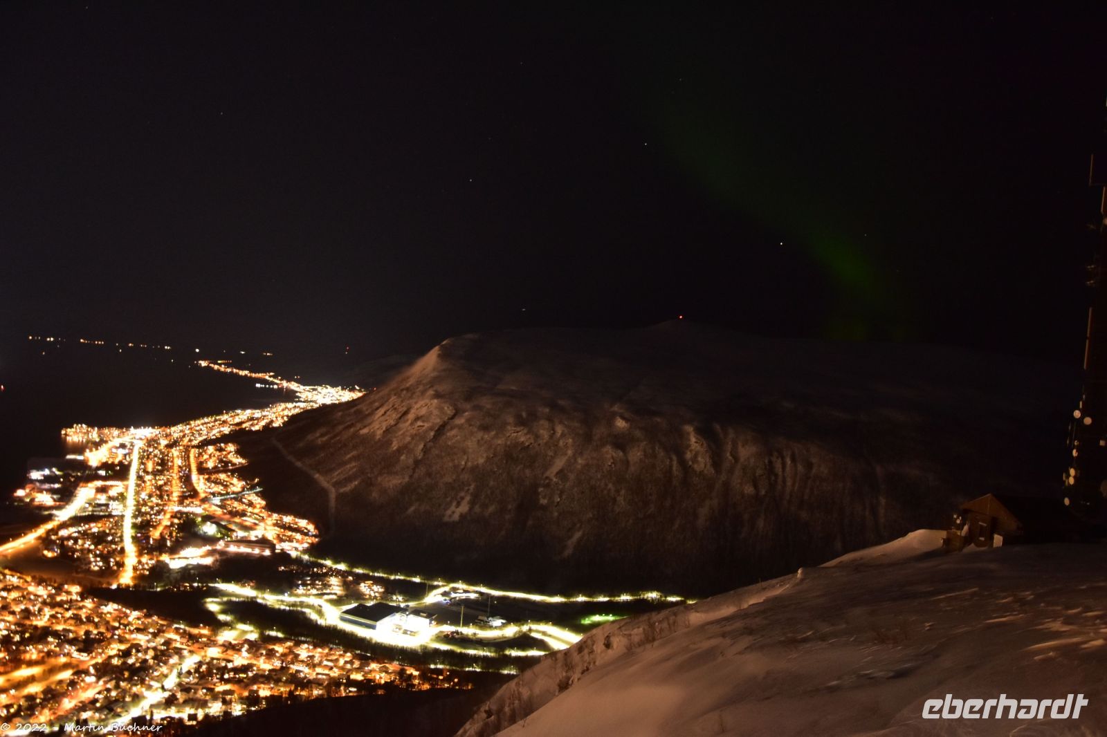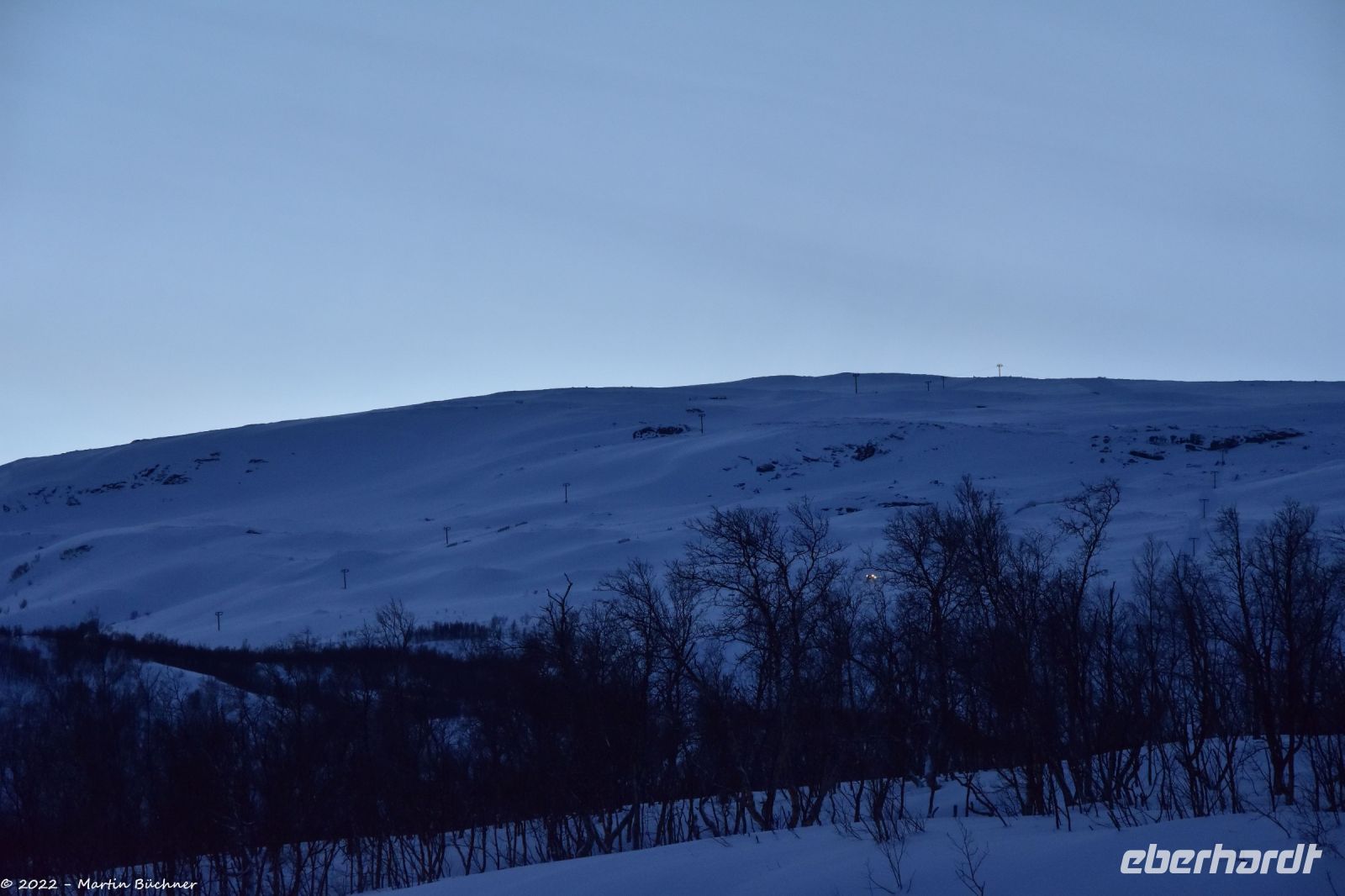 Schnell bewegen wir uns aus dem grellen Lichtkegel der Ski Piste, hinein in die lappländische Dunkelheit. Von der Gipfelregion bietet sich ein fantastischer Blick auf das beleuchtete Kiruna.