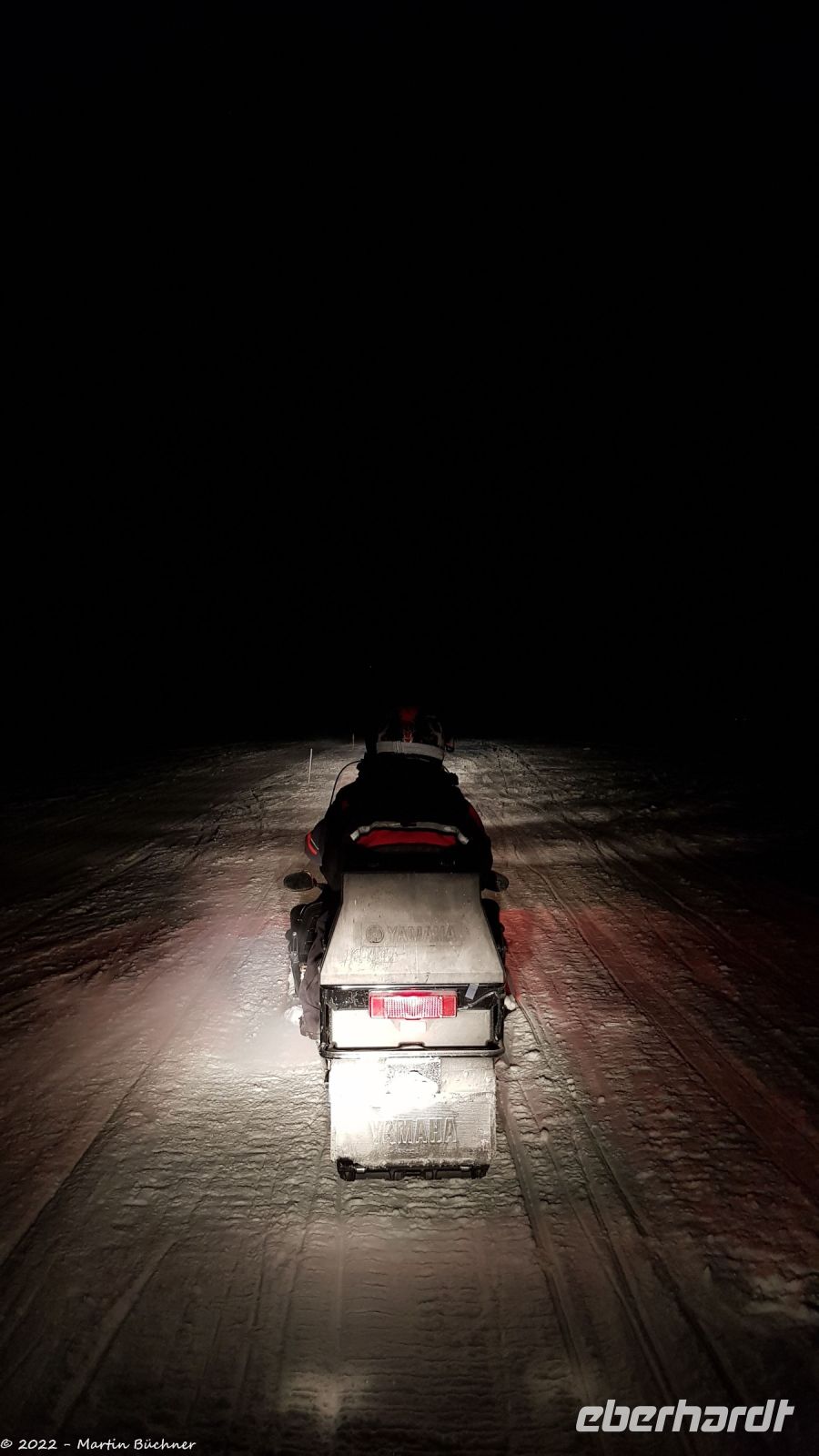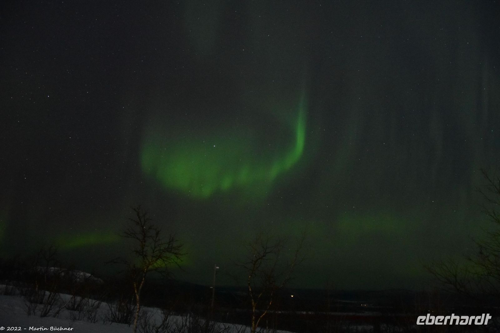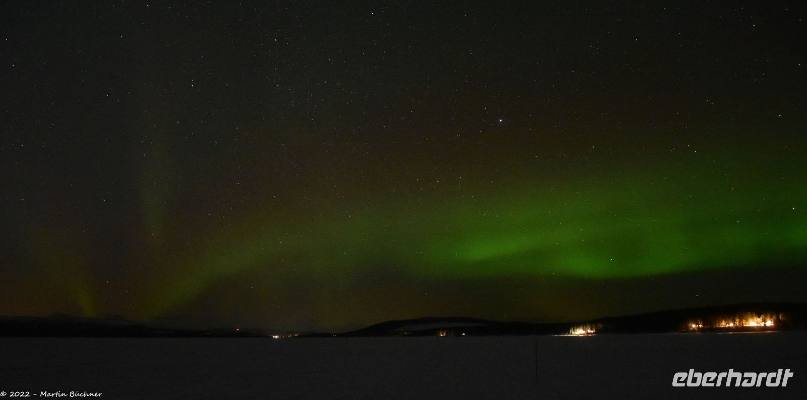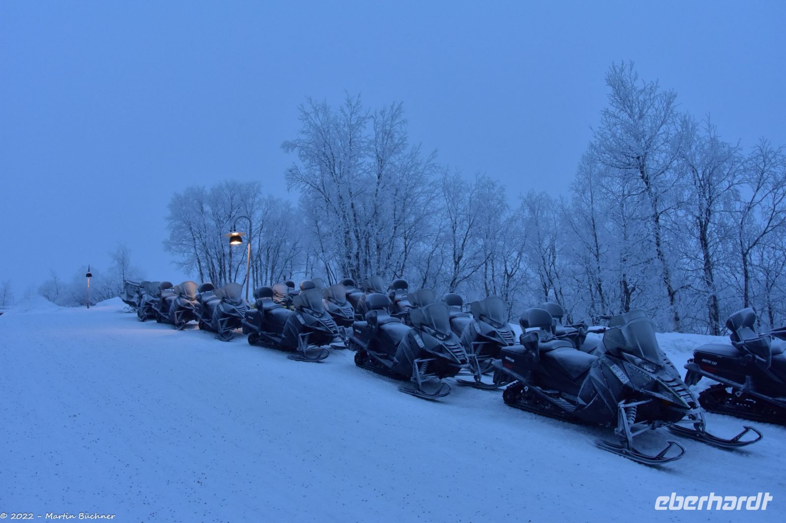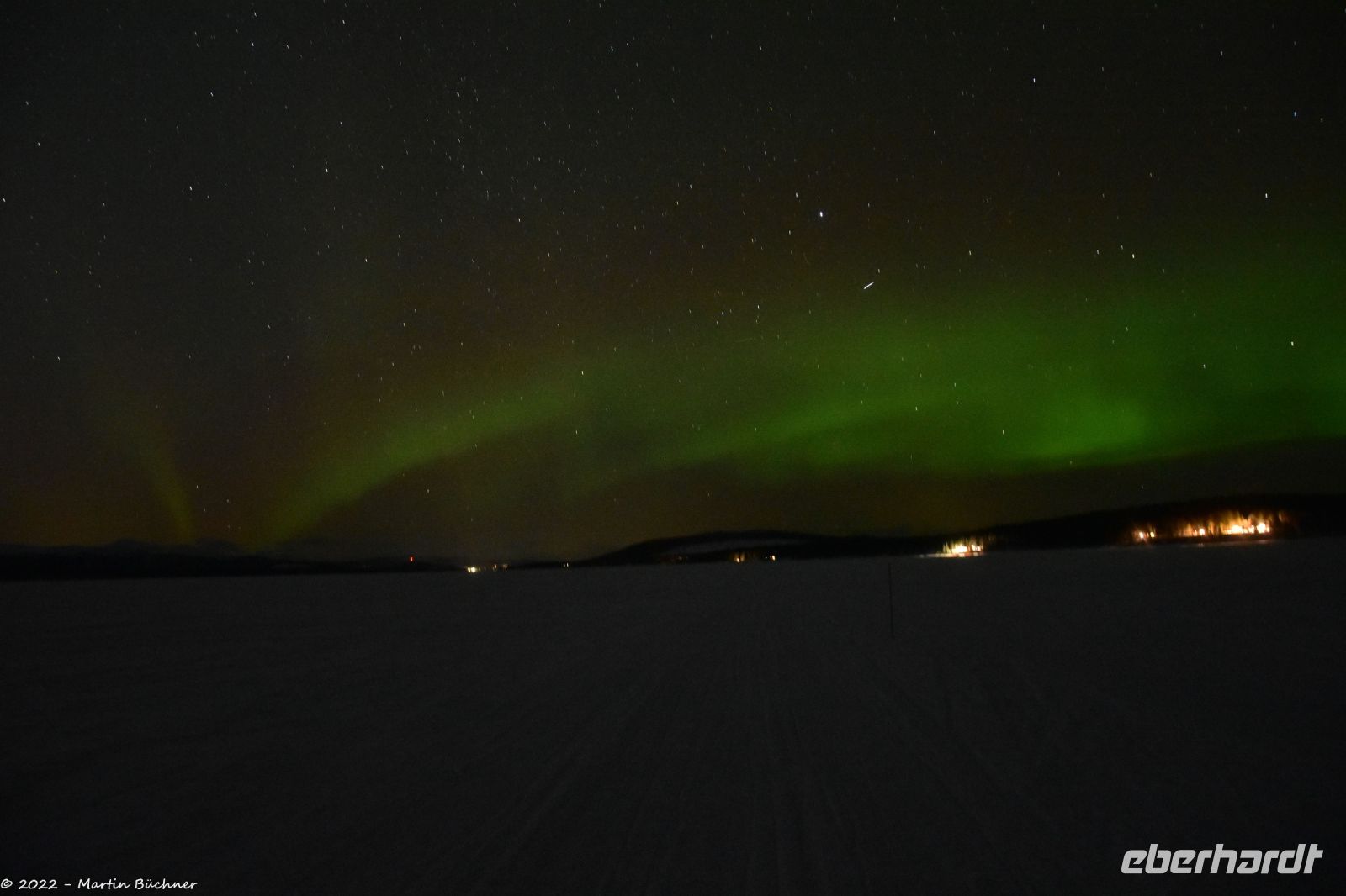 Doch der Tag hat noch mehr zu bieten – am späten Nachmittag starten wir zu unserer Schneemobil-Tour nach Laksforsen. Auch hier werden wir wieder abgeholt und für die Arktis eingekleidet. Auch hier führt der Weg auf einen anderen Teil des Torneälv. Der Himmel ist sternenklar als noch das Polarlicht als Krönung dieser unvergesslichen Szenerie auftaucht.