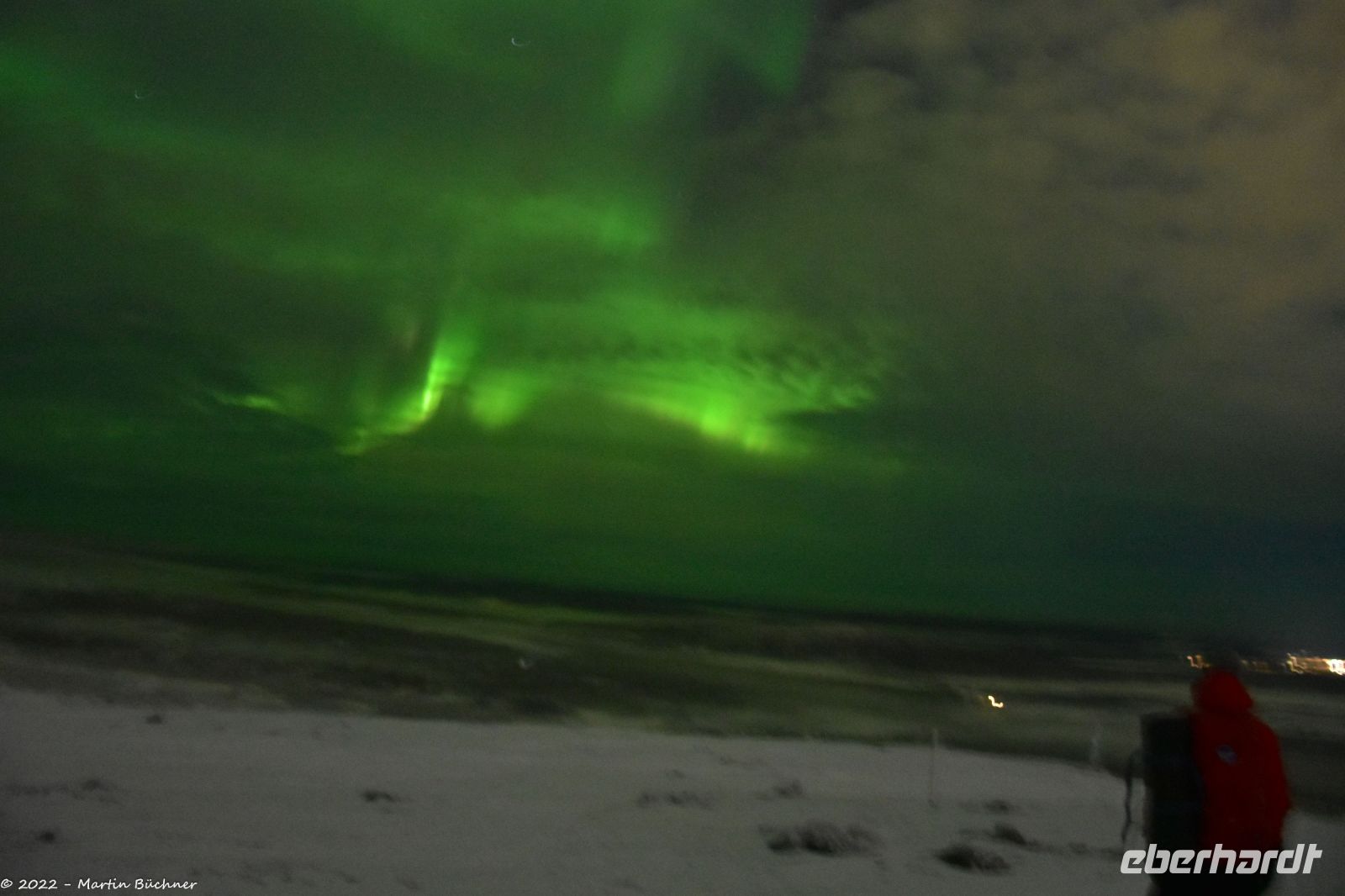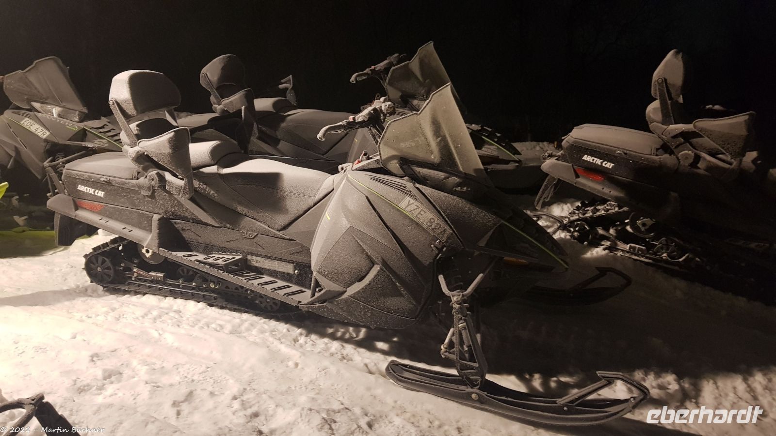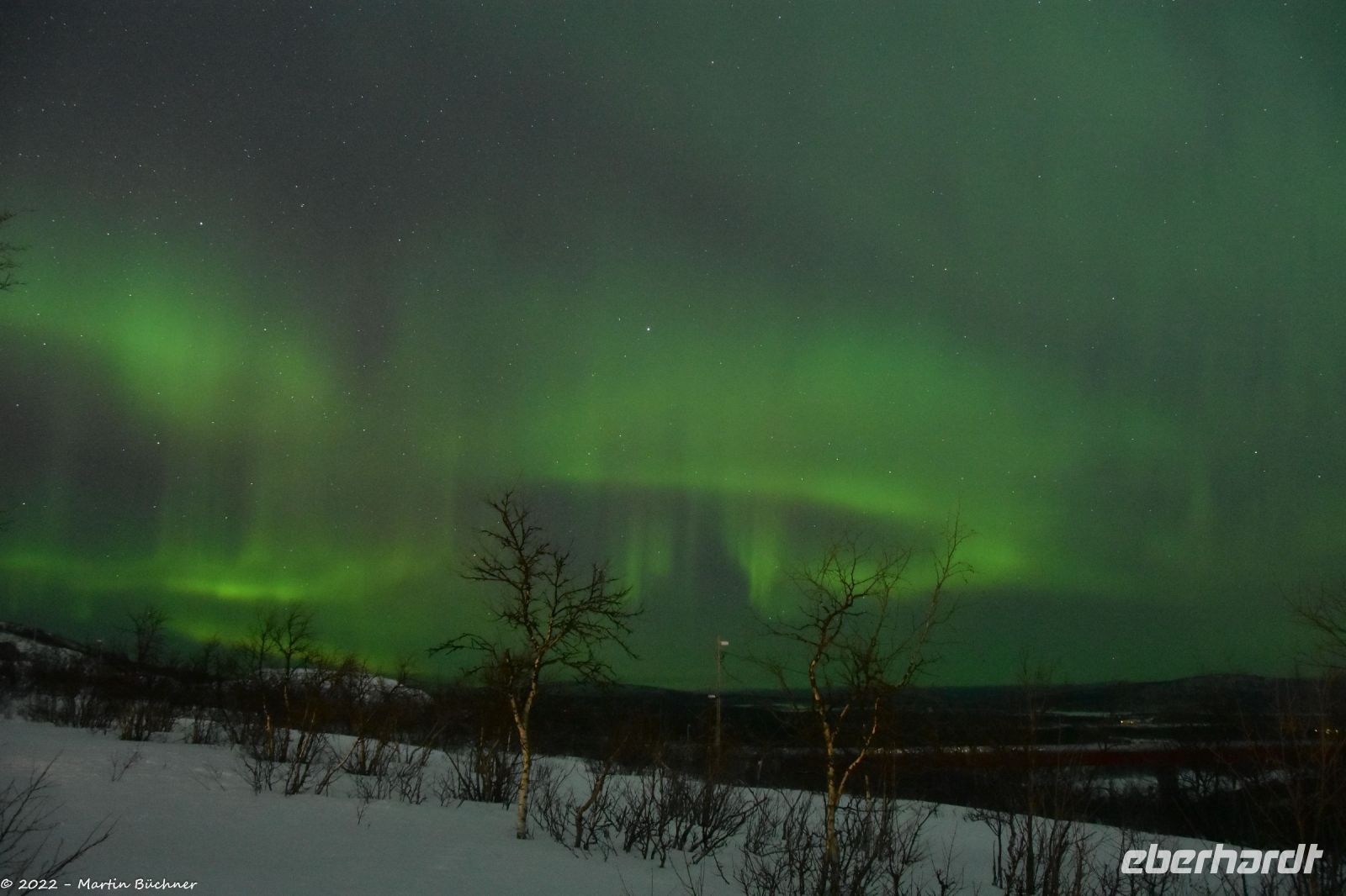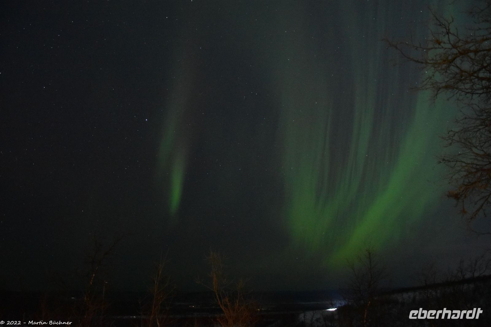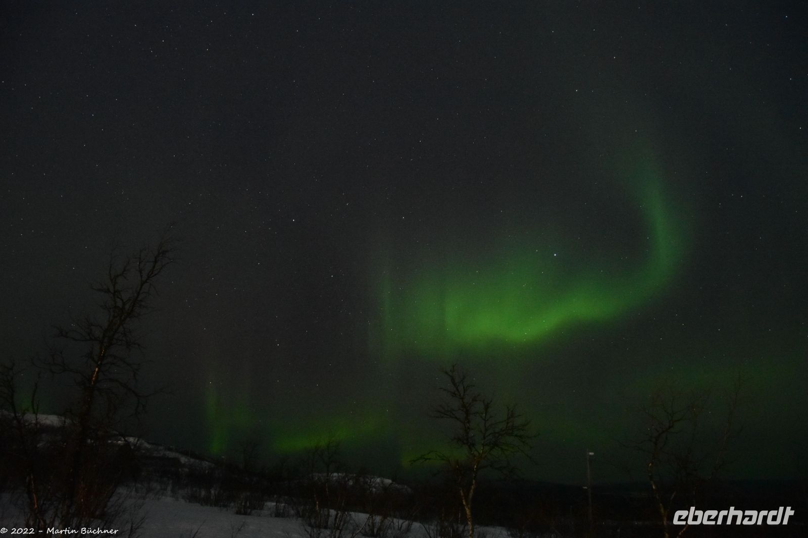 Doch der Tag hat noch mehr zu bieten – am späten Nachmittag starten wir zu unserer Schneemobil-Tour nach Laksforsen. Auch hier werden wir wieder abgeholt und für die Arktis eingekleidet. Auch hier führt der Weg auf einen anderen Teil des Torneälv. Der Himmel ist sternenklar als noch das Polarlicht als Krönung dieser unvergesslichen Szenerie auftaucht.