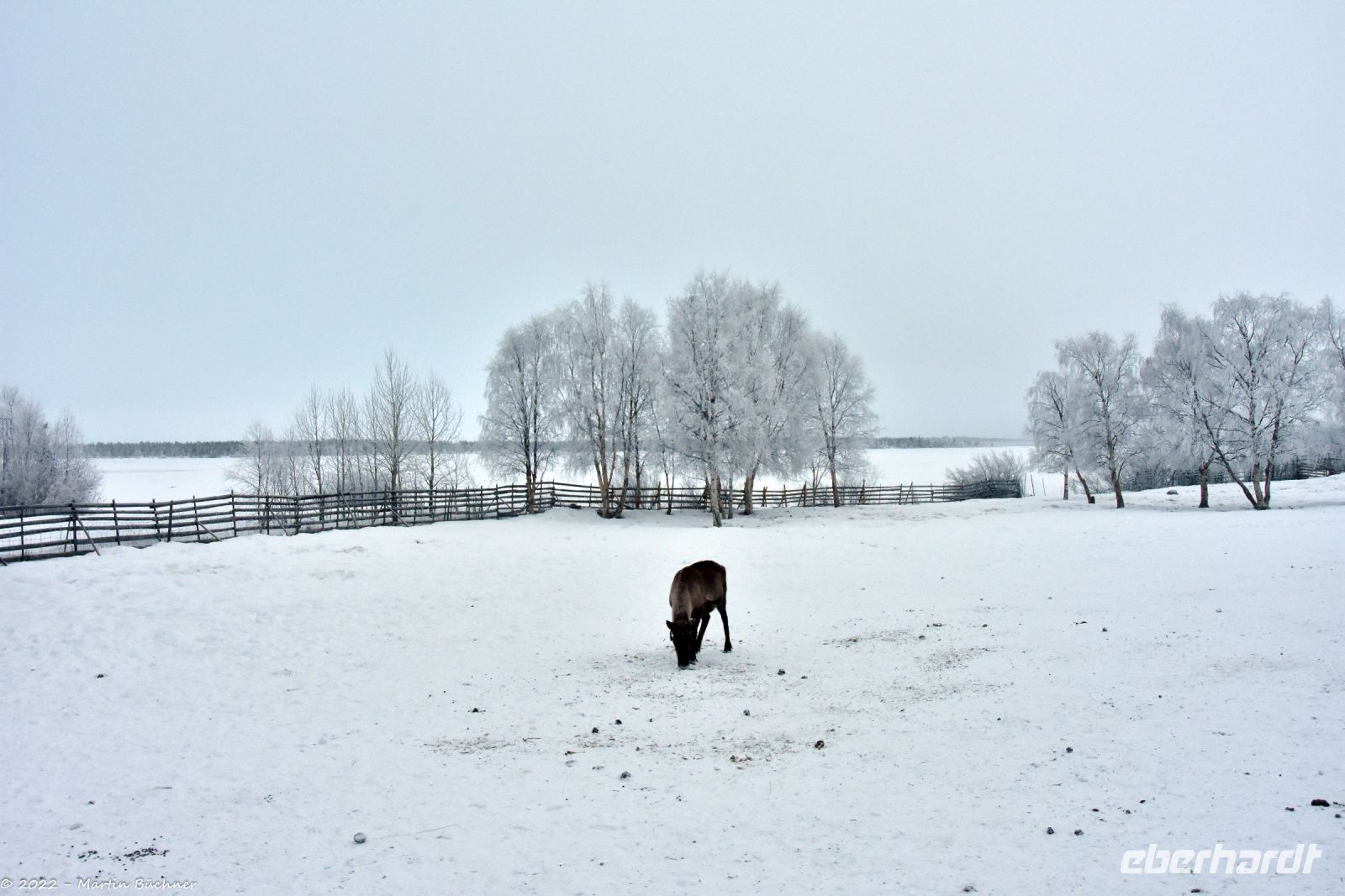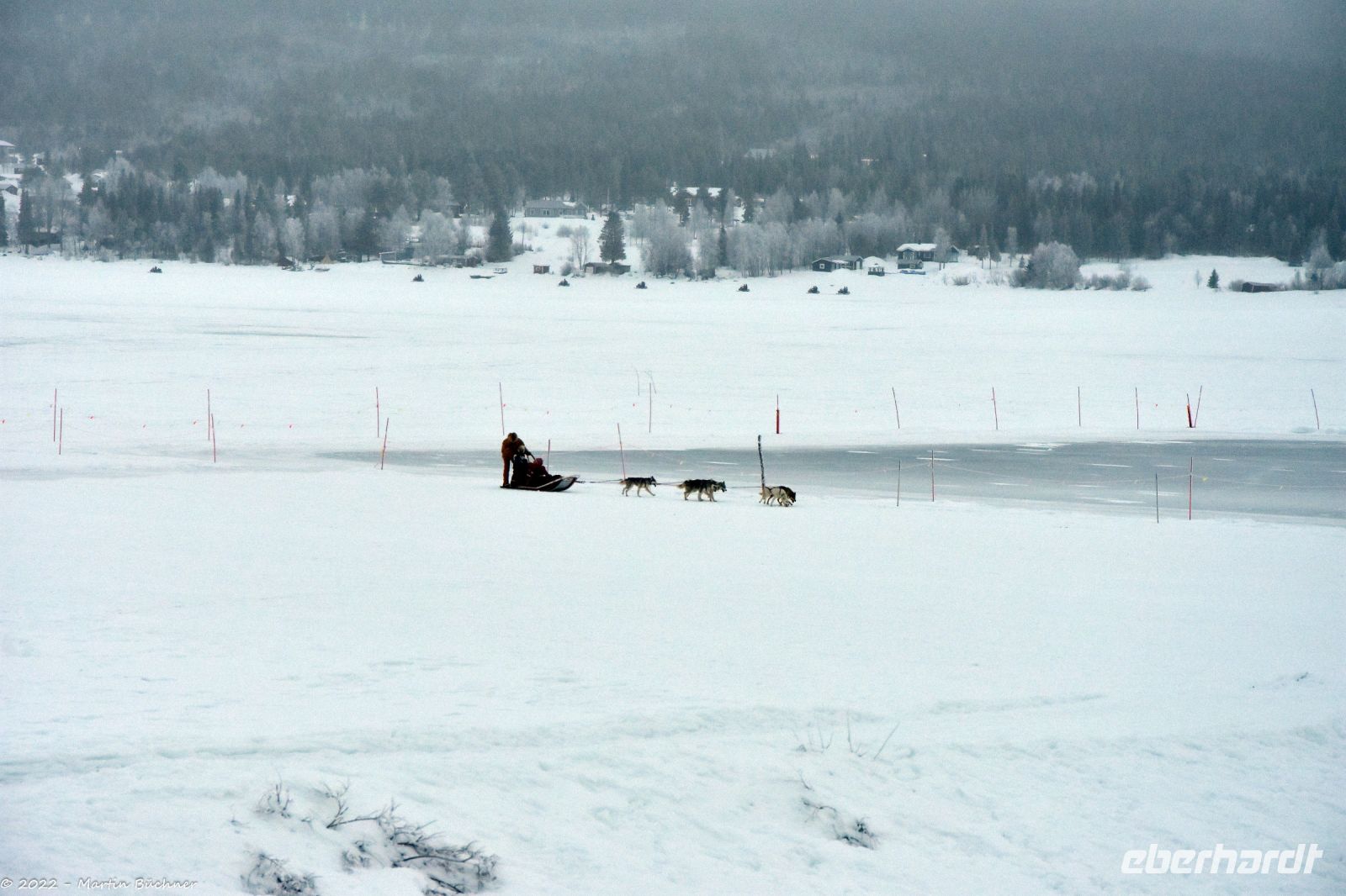 Unsere Route führt uns vorbei am zugefrorenen Torneräsk – der sechstgrößte See Schwedens – er gilt als Quellgebiet des Torneälv (finnisch Torniojoki, Torne Fluss), der in seinem weiteren Verlauf über weite Strecken die Grenze zwischen Schweden und Finnland bildet (im Übrigen auch eine Zeitzonengrenze) und bei Tornio (Finnland) und Haparanda (Schweden) in den Bottnischen Meeresbusen (nördlichster Teil der Ostsee) mündet.