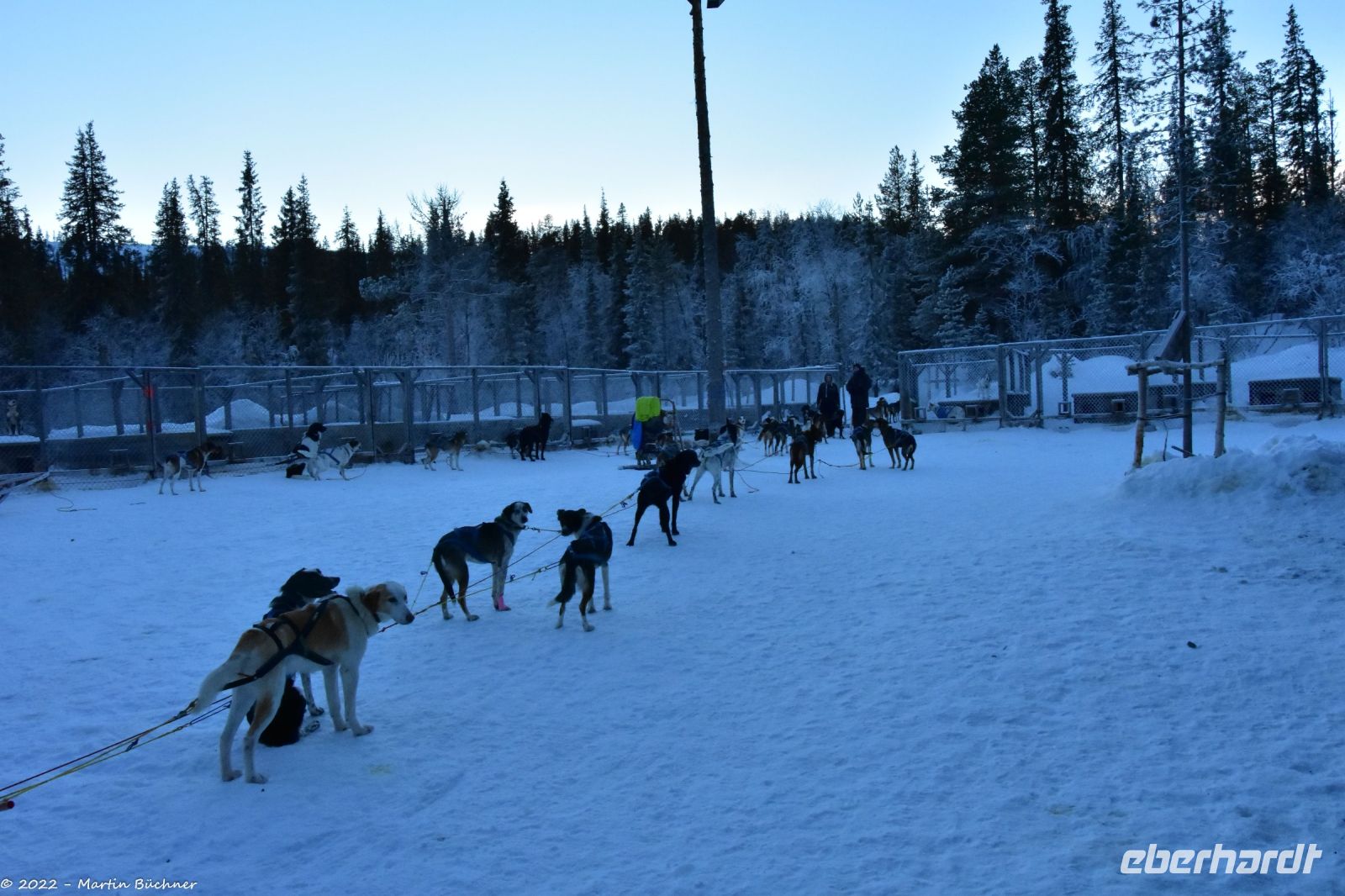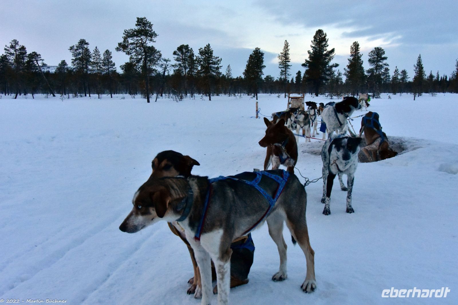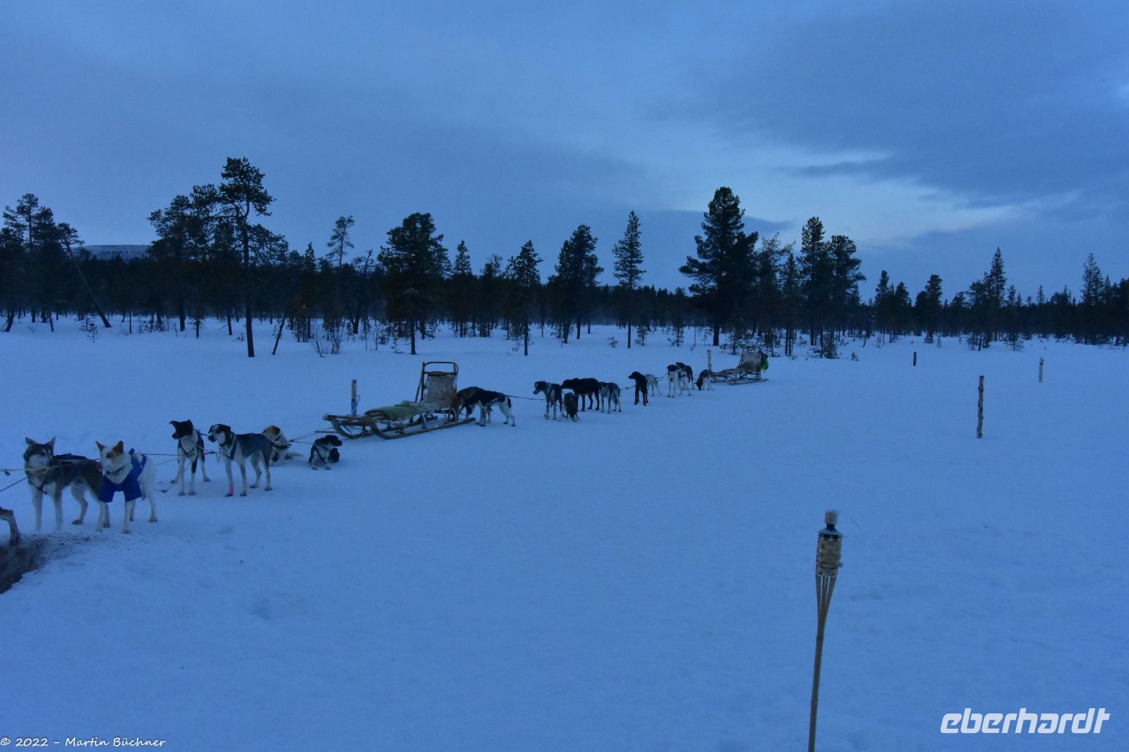 Am frühen Nachmittag starten die gebuchten Gäste zu unserer Hundeschlittenausfahrt. Wir werden abgeholt und nach Kurravaara gebracht. Mitten im Wald beginnt an einer Hundestation unser Abenteuer. Ausgestattet mit warmer Kleidung fahren die Schlitten mit je vier Gästen und einem Musher (Hundeschlittenführer) in die lappländischen Wälder. 12 Hunde ziehen ein Schlitten. Bis zu 30 km/h schnell laufen die Hunde, in unserem Fall mehrheitlich Alaska Huskys. Ein einzelner Hund kann bis zu 100 kg Gewicht ziehen. Mit hoher Geschwindigkeit beginnt die rasante Fahrt. Die Musher müssen intensiv Dauerbremsen damit die Fahrt nicht zu rasant wird. Unglaublich diese Kraft und Energie. Wer einmal so einen Hund in Aktion erlebt hat, dem fällt es schwer solche Hunde in städtischen Wohnungen zu wissen. Die Fahrt führt uns hinaus auf den zugefrorenen Torneälven. Unterwegs werden wir an einem Lavvu mit Feuerstelle und einer kleinen Stärkung erwartet. Ein unvergessliches Erlebnis.
