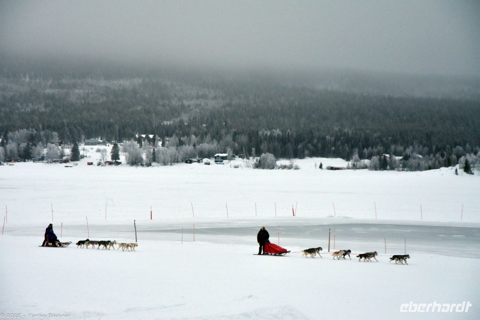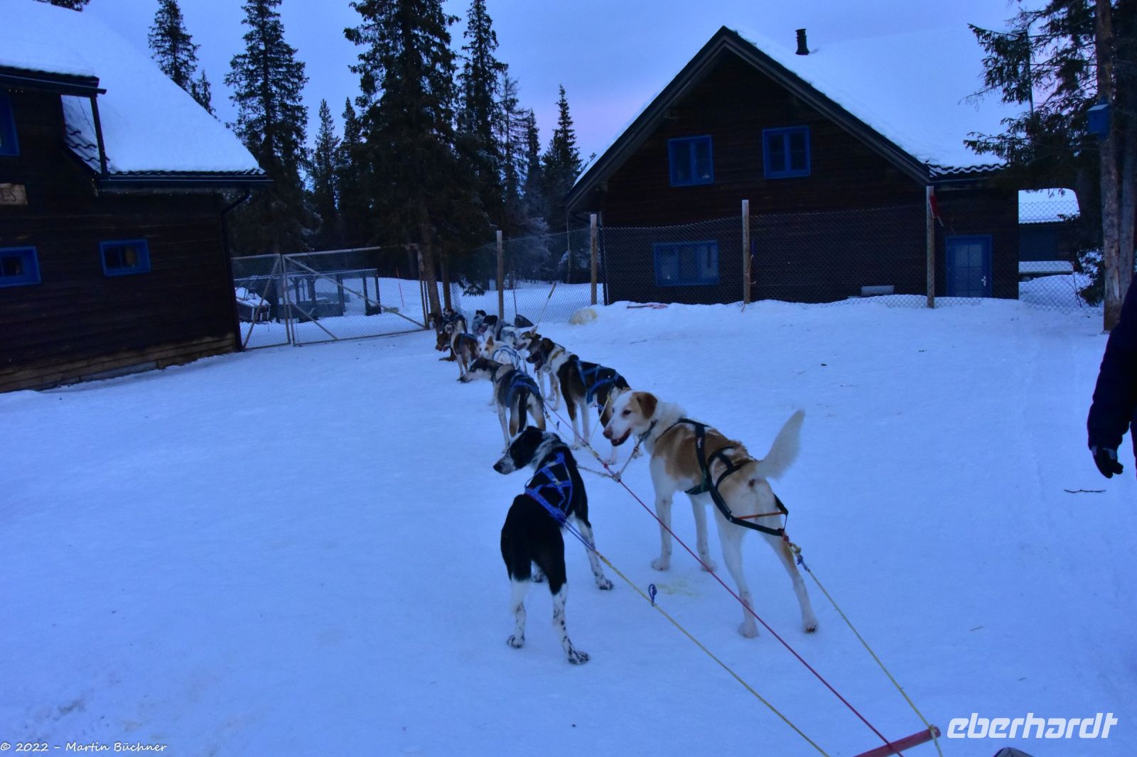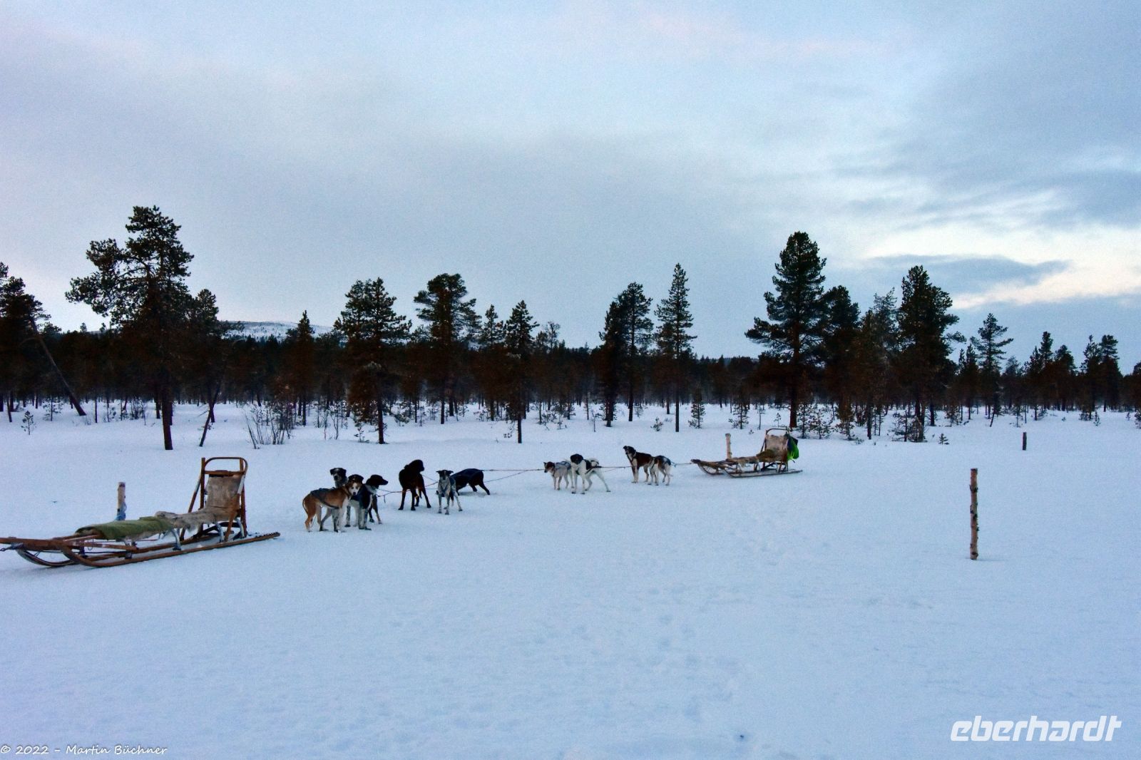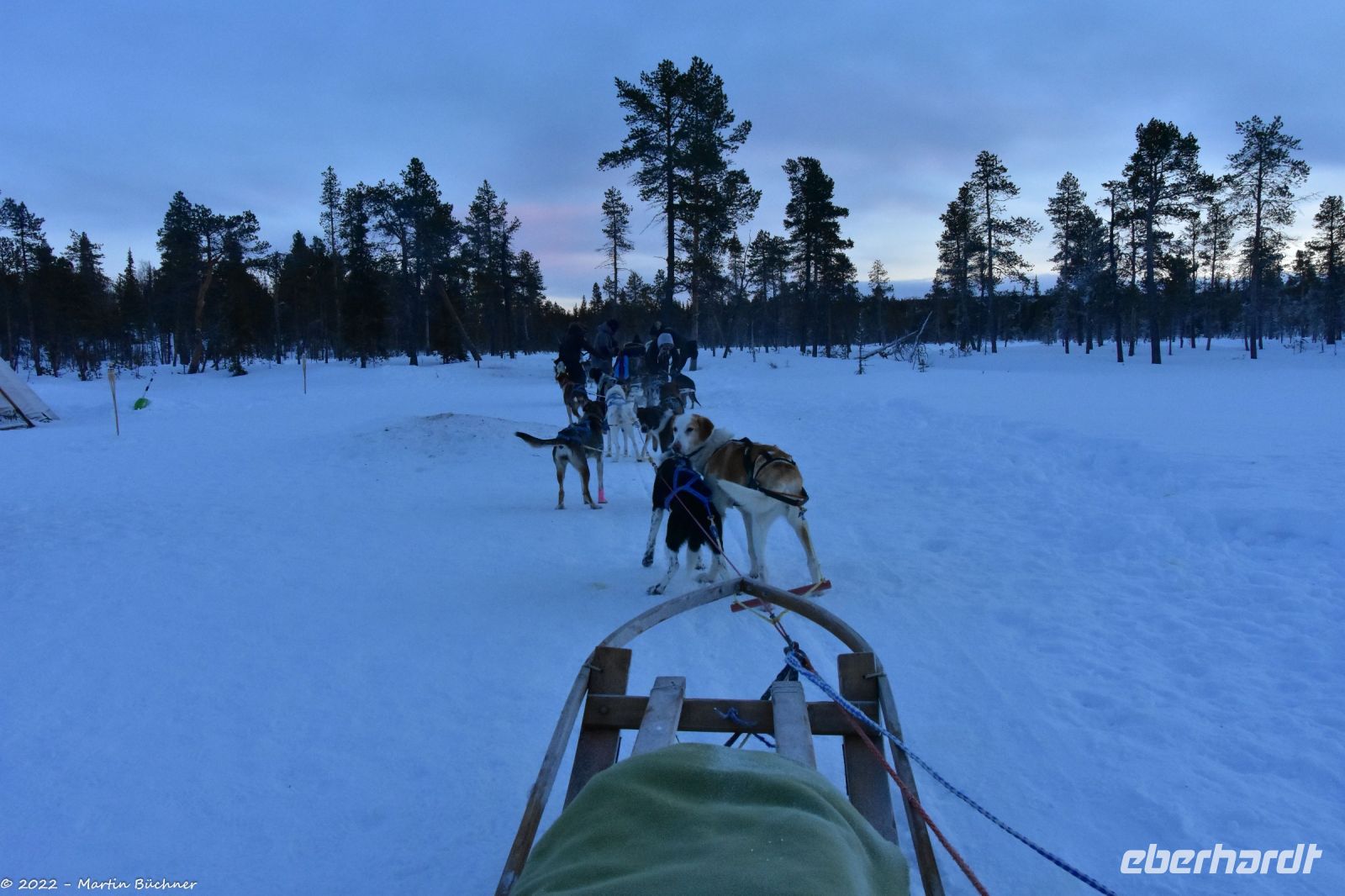 Am frühen Nachmittag starten die gebuchten Gäste zu unserer Hundeschlittenausfahrt. Wir werden abgeholt und nach Kurravaara gebracht. Mitten im Wald beginnt an einer Hundestation unser Abenteuer. Ausgestattet mit warmer Kleidung fahren die Schlitten mit je vier Gästen und einem Musher (Hundeschlittenführer) in die lappländischen Wälder. 12 Hunde ziehen ein Schlitten. Bis zu 30 km/h schnell laufen die Hunde, in unserem Fall mehrheitlich Alaska Huskys. Ein einzelner Hund kann bis zu 100 kg Gewicht ziehen. Mit hoher Geschwindigkeit beginnt die rasante Fahrt. Die Musher müssen intensiv Dauerbremsen damit die Fahrt nicht zu rasant wird. Unglaublich diese Kraft und Energie. Wer einmal so einen Hund in Aktion erlebt hat, dem fällt es schwer solche Hunde in städtischen Wohnungen zu wissen. Die Fahrt führt uns hinaus auf den zugefrorenen Torneälven. Unterwegs werden wir an einem Lavvu mit Feuerstelle und einer kleinen Stärkung erwartet. Ein unvergessliches Erlebnis.