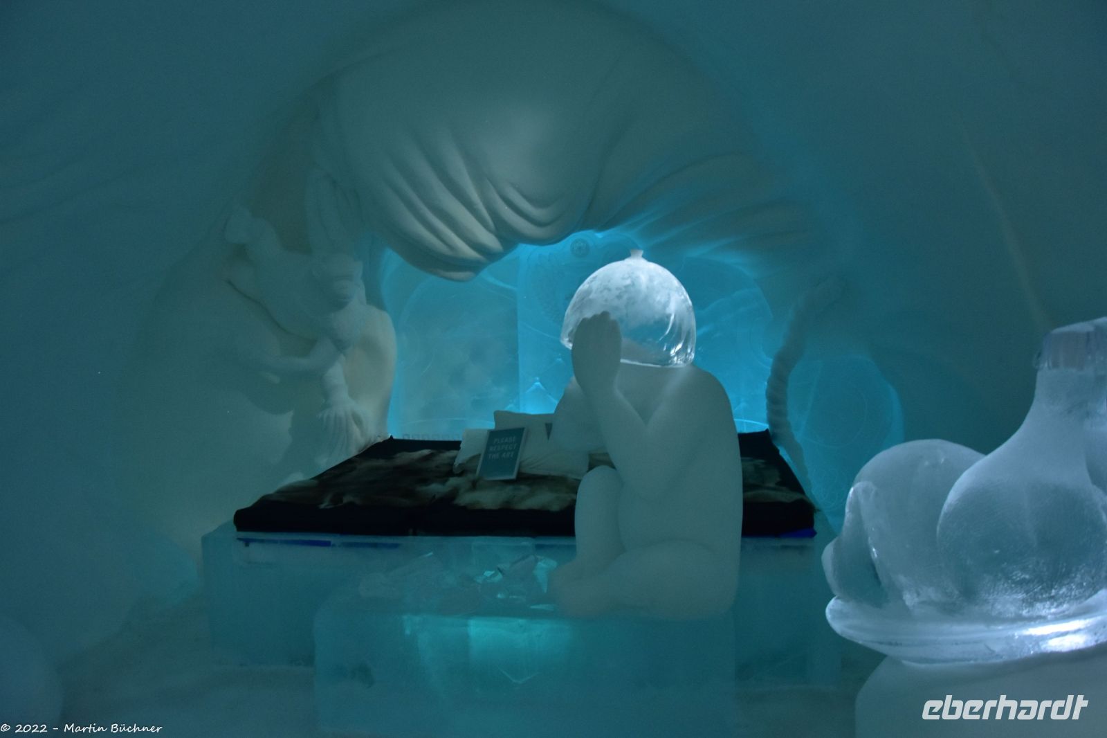 Nach einem sehr guten Frühstück startet die Gruppe von Kiruna nach Jukkasjärvi. Wie wird es wohl den fünf Teilnehmern im Eishotel ergangen sein? Für alle steht nun eine Besichtigung der gesamten Anlage an (inkl. Führung durch einen lokalen Guide). Insbesondere die Suiten stellen jede für sich ein vergängliches künstlerisches Unikat dar, dass sich in keinem Jahr wiederholt. Jeder darf Vorschläge für neue Kreationen einsenden. Die besten Entwürfe und deren Schöpfer werden eingeladen die Papierkreationen in Eisskulpturen zu verwandeln. Erfahrene Eiskünstler helfen bei der Umsetzung. Jeder kann mitmachen, so gibt es Eiskünstler, die in Jukkasjärvi zum ersten Mal in ihrem Leben mit Schnee und Eis in Kontakt kommen.