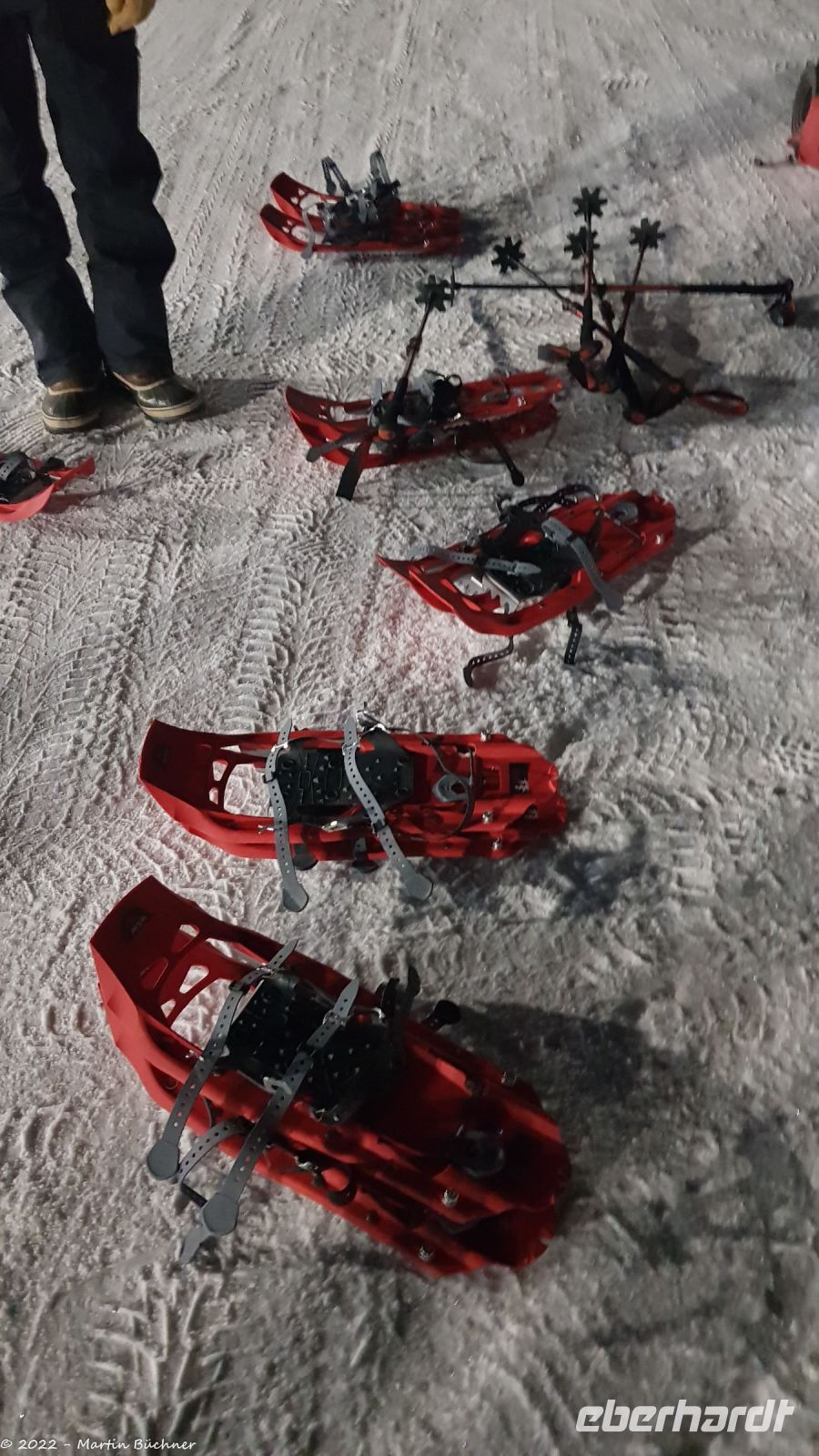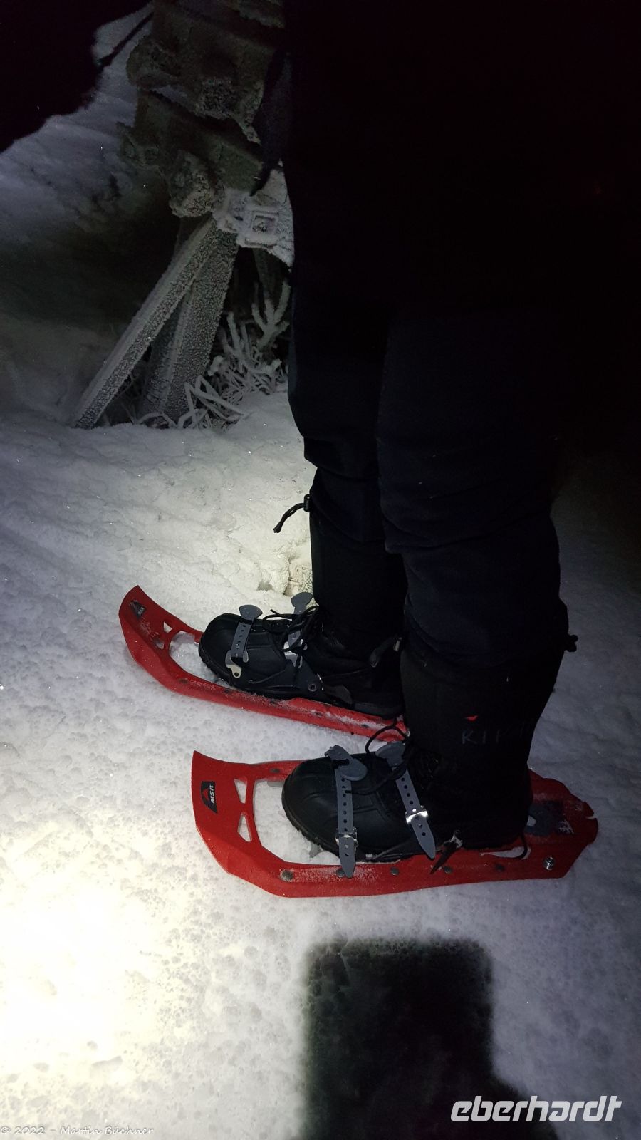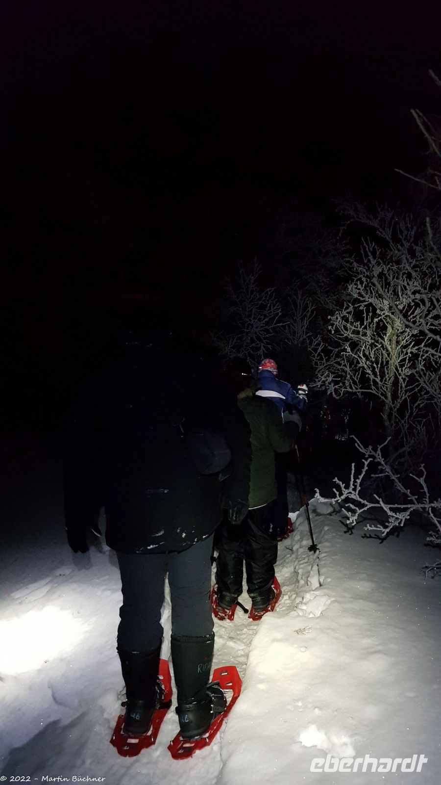 Am Abend startet für einige Gäste und mich ein weiteres Abenteuer: Nach dem Abendessen starten wir mit einem lokalen Guide zu unserer Schneeschuhwanderung („Snowshoe-Hike“).