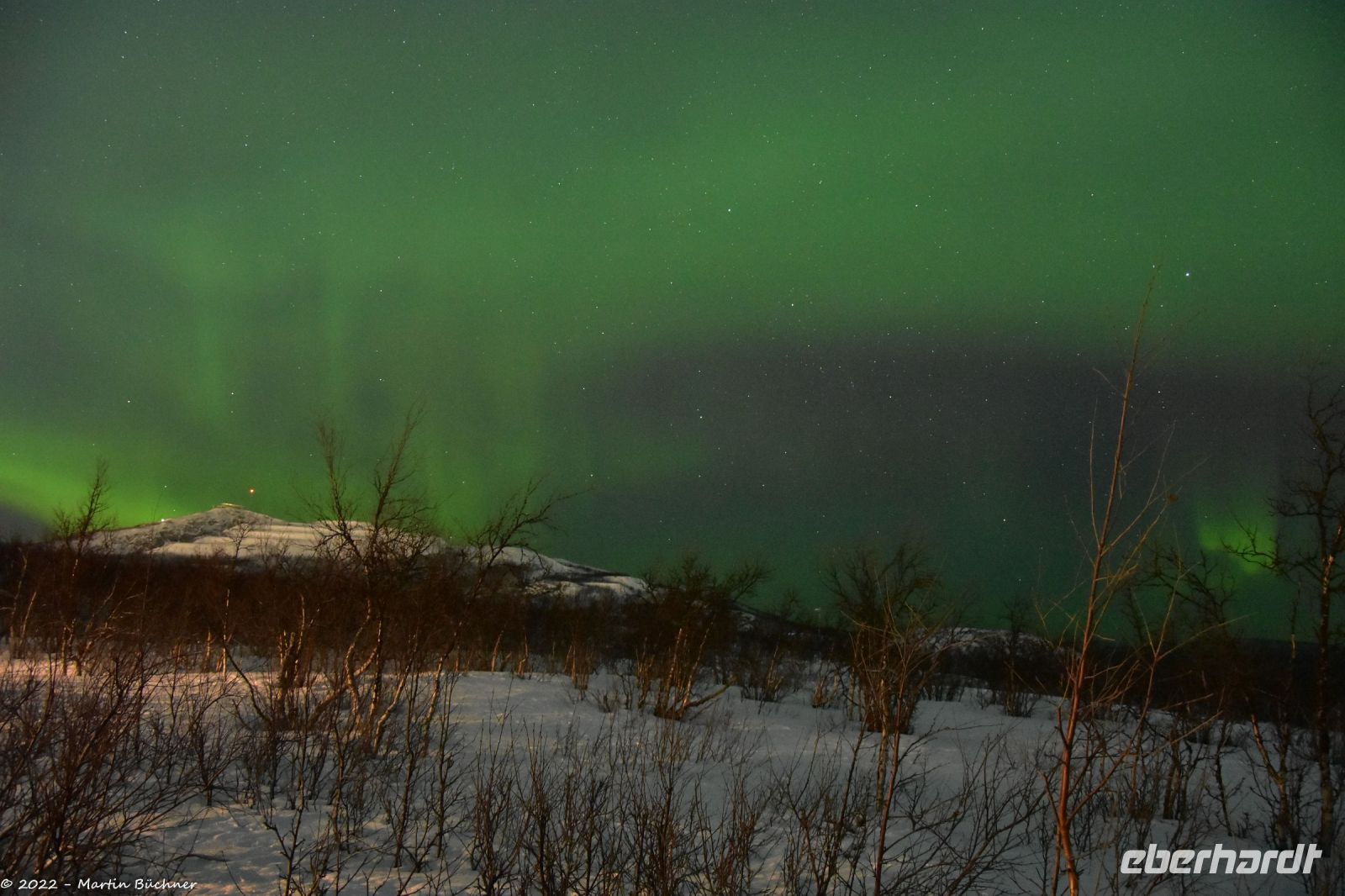 An der dunkelsten Stelle des Weges, am perfekten Ort zum perfekten Zeitpunkt, zeigt sich zum ersten Mal auf dieser Reise „die grüne Lady“, das Polarlicht bzw. Nordlicht. Laut knisternd stapfen wir zum Teil steil bergab, durch den meterhohen staubtrockenen Schnee. Etwas tiefer liegt ein kleines Birkenwäldchen, deutlich geschützter fehlt hier die gefrorene Oberfläche. Reinster Pulverschnee bei der man trotz Schneeschuhe sofort bis zur Hüfte versinkt. Etwas fordernd überwinden wir diese Tiefschneestelle. Wir stapfen weiter über den nun wieder hart gefrorenen Boden durch die Nacht. Das Licht der Sterne funkelt wie kleine Diamanten in den Eiskristallen. Nach gut zwei Stunden erfreuen wir uns bei einer kleinen Rast, typische selbstgebackene Plätzchen und heißer Heidelbeertee versüßen uns den Stopp. Nach einer weiteren Stunde erreichen wir unser Hotel. Eine unvergessliche Wanderung entlang des „Midnatsolstigen“ – Mitternachtssonnensteig liegt hinter uns.