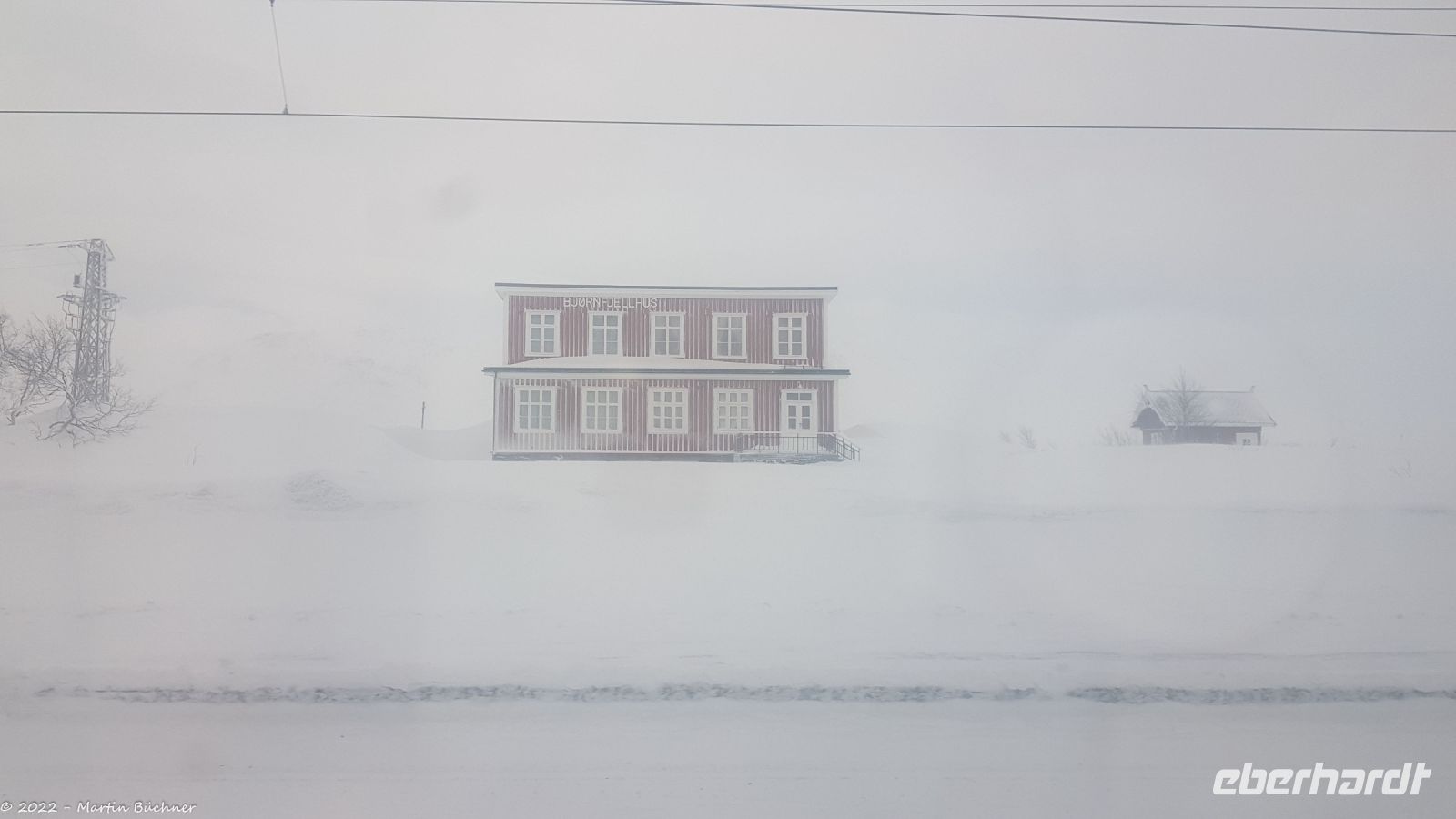 In weiser Voraussicht war unser Chauffeur bereits am Vortag mit unserem Bus nach Narvik aufgebrochen. Der Wetterbericht kündigte für unseren Reisetag ein Unwetter mit starken Winden auf dem Bjørnfjell an. Wir gingen von einer Straßensperrung aus, eine Weiterfahrt nach Tromsø wäre dann ggf. nicht mehr möglich gewesen. Zur Sicherheit fuhr unser Chauffeur einen Tag eher nach Narvik. Wir bekamen einen Extra-Transfer zum Bahnhof von Kiruna und nahmen unsere Koffer im Zug selbst mit.